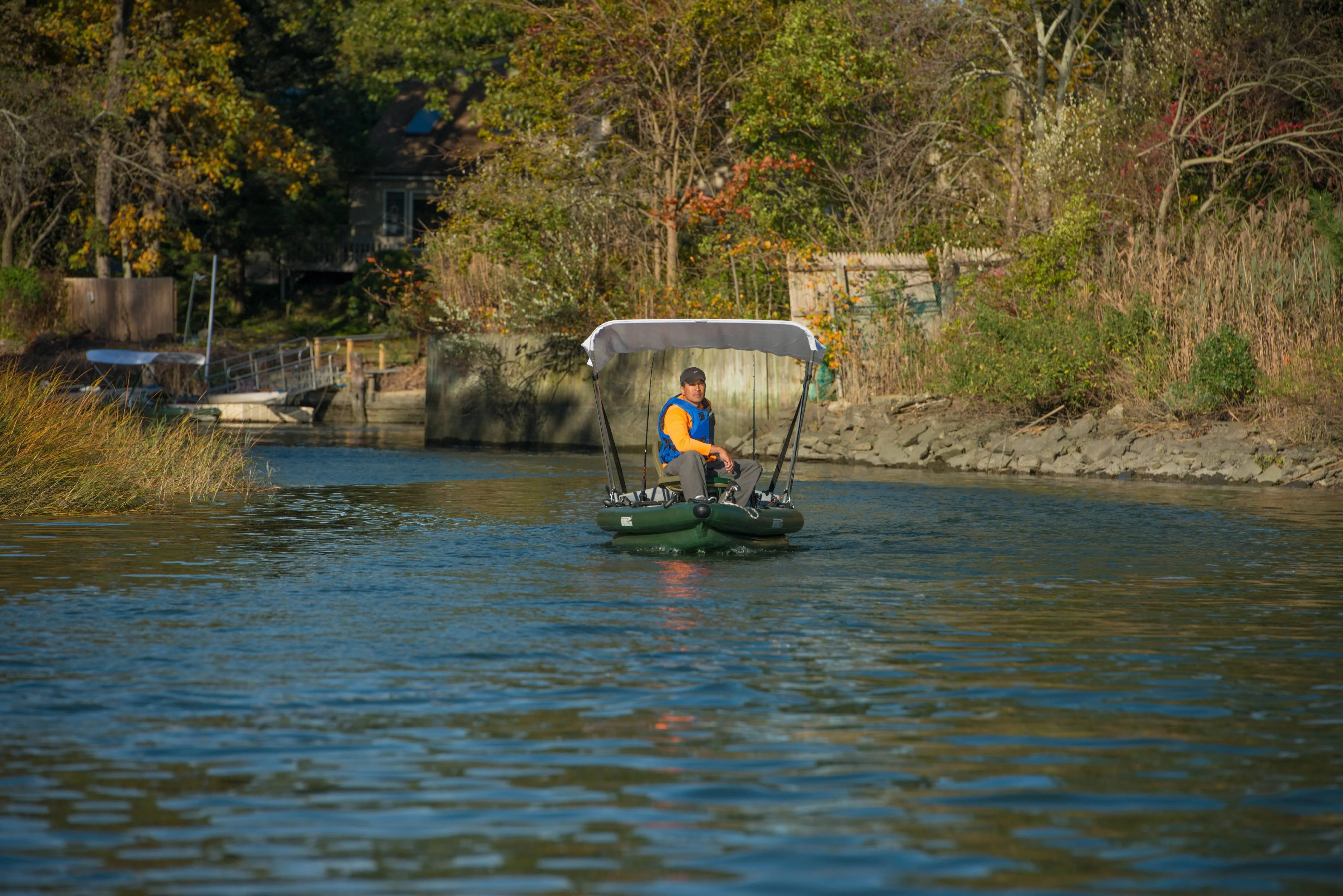 A PATENT-PENDING REVOLUTIONARY "Roll Up & Go" 16 ft one or two-man FISHING SKIFF. Simply rolls up and stows in most any car trunk ready to go! Comprised of entirely drop-stitch technology. Giving you all the benefits of a rigid hull minus the excessive burdens and added cost. No trailer, no ramps, no expensive fuel cost, no maintenance, no storage fees! The hull design truly maximizes speed, handling, performance, stability, fuel efficiency and most importantly safety. Nearly unsinkable and completely self-bailing. The FishSkiff will support an incredible amount of weight yet draft as little as six inches of water. The 2 Person Swivel Seat package includes FishKiff?16 Hull, Wide Canopy, 2 Green Swivel Seat Fish Rigs, 1 - SUP Paddle, Manual Select SUP Pump, 2- 7" Pedestals, and Repair Kit.