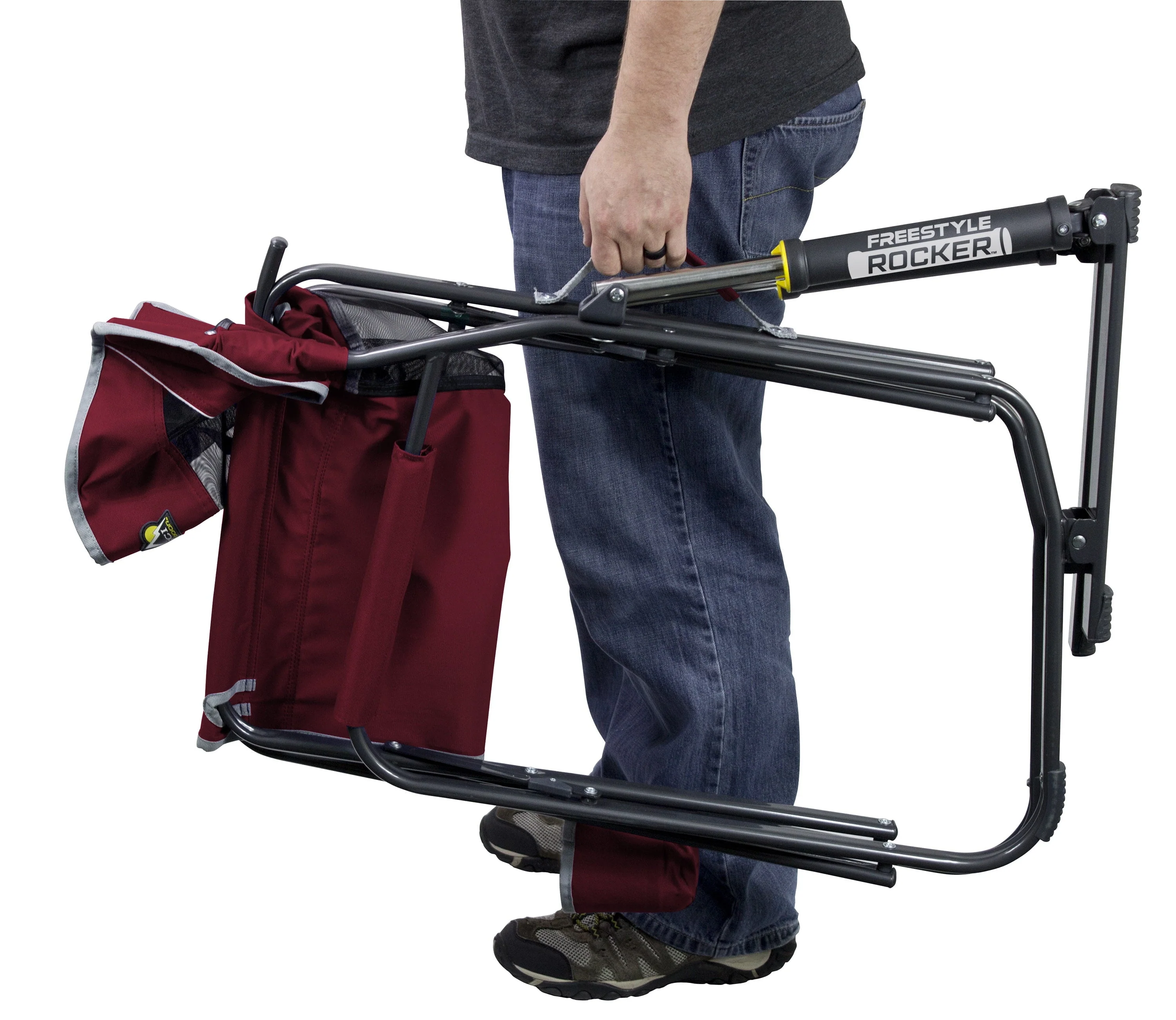 The GCI Outdoor Freestyle Rocker Portable Folding Camping Chair combines innovation and comfort with portable convenience for all your outdoor events and camping needs. Featuring patented Spring Action Rocking Technology, you’ll enjoy smooth rocking and hours of relaxation outdoors. Constructed of a sturdy steel frame, the Freestyle Rocker outdoor chair is rugged enough to go wherever you go �?whether it’s tailgating, cheering on the sidelines or sitting by the firepit. With a beverage holder and durable, nylon mesh backrest for continual airflow, you’ll stay cool in warm weather. This full-size, sturdy rocking chair opens and closes easily with patented Eazy-Fold Technology, making setting up and packing up a breeze. This camping chair comes fully assembled and includes a carry handle. The GCI Outdoor Freestyle Rocker is backed by a limited lifetime warranty, so you can fully experience your outdoor adventures worry-free.