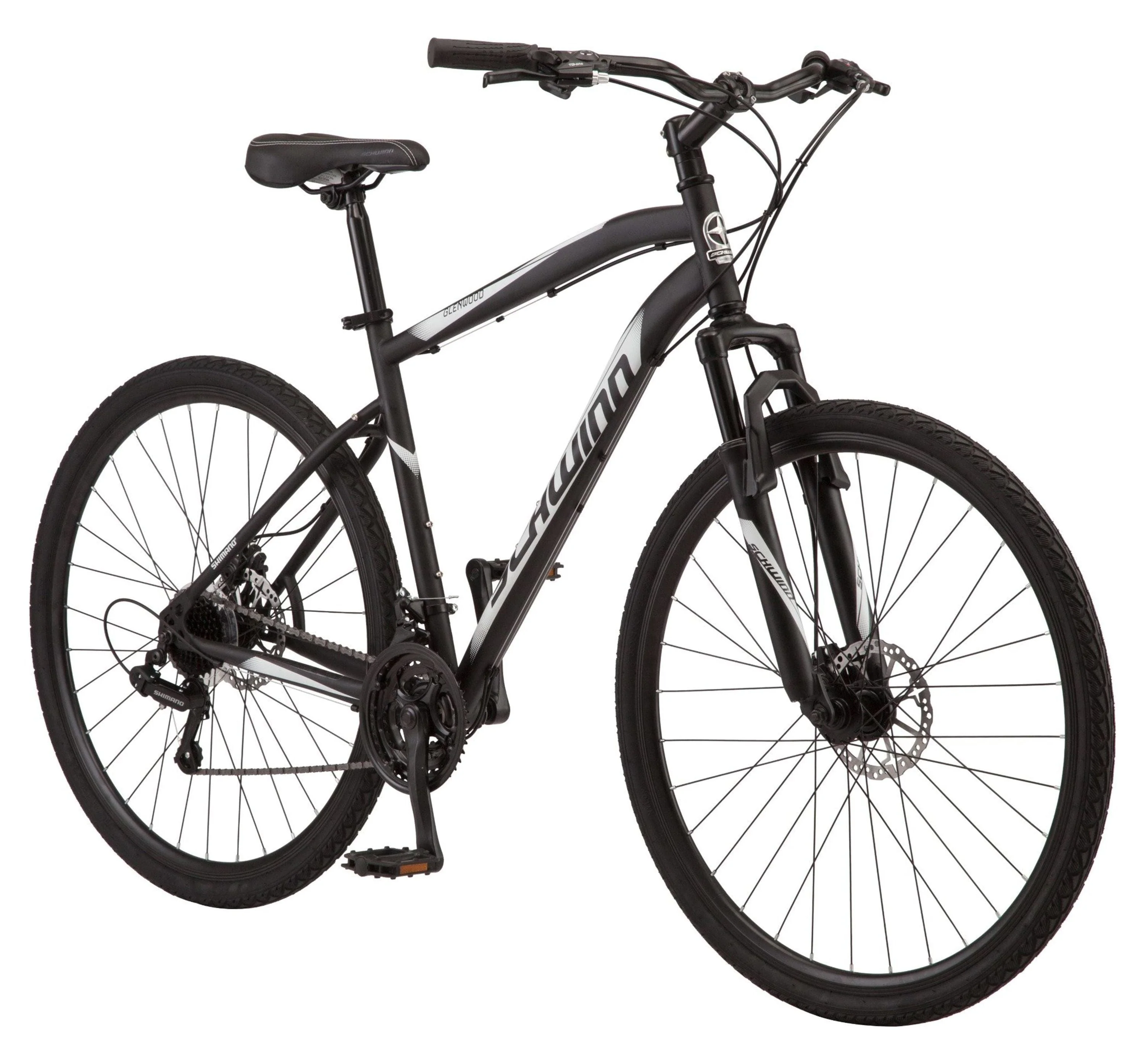 Tooling around the neighborhood? Riding through your favorite park? Or on your way to work? Make your ride the best part of the day with the Glenwood hybrid bike by Schwinn. The Glenwood features a durable steel Schwinn frame and suspension fork that absorbs bumps in the road, giving you a more comfortable ride. 21 speeds let you easily adapt to your terrain with quick, precise gear changes, while the front and rear disc brakes deliver precision stopping power. Plus, alloy double-wall rims with dual sport tires are perfectly suited for pavement and bike path rides. Exercise, commute, or just have a little fun you can do it all with Glenwood.View more from us on our brand page.