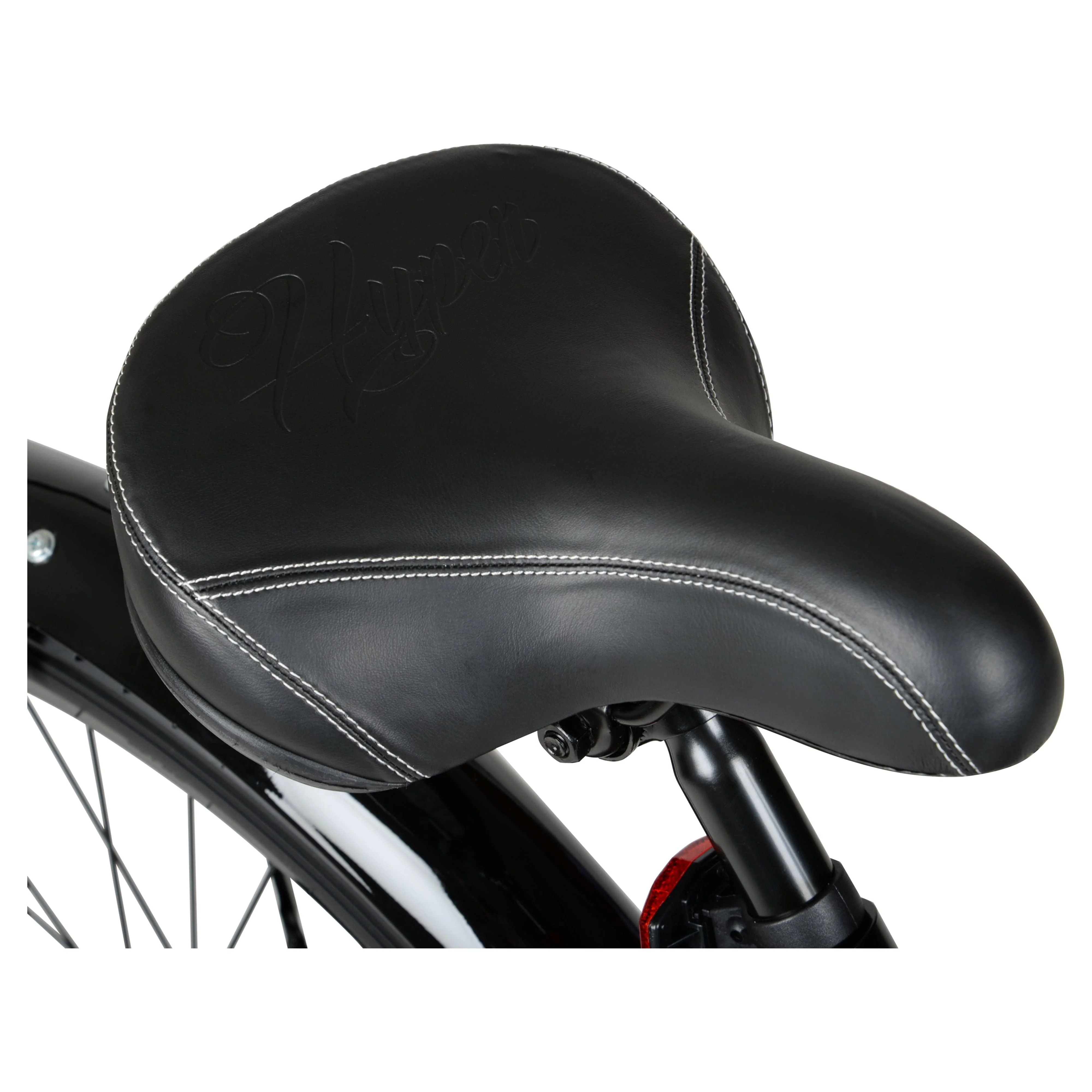 Ride in style with Hyper Bicycles men's 26" beach cruiser bike in black. This bicycle has a steel frame with easy-to-use pedal backward coaster braking. For your comfort, this bike includes platform cruiser pedals, lightweight alloy wheels, and a padded spring comfort seat. Full wrap fenders create protection for your tires. Large upright handle bars help put the rider in an upright comfortable ridding position. Perfect for your daily commutes or weekend leisurely rides, the Hyper Bicycles woman's beach cruiser bike will help make your trips more enjoyable.