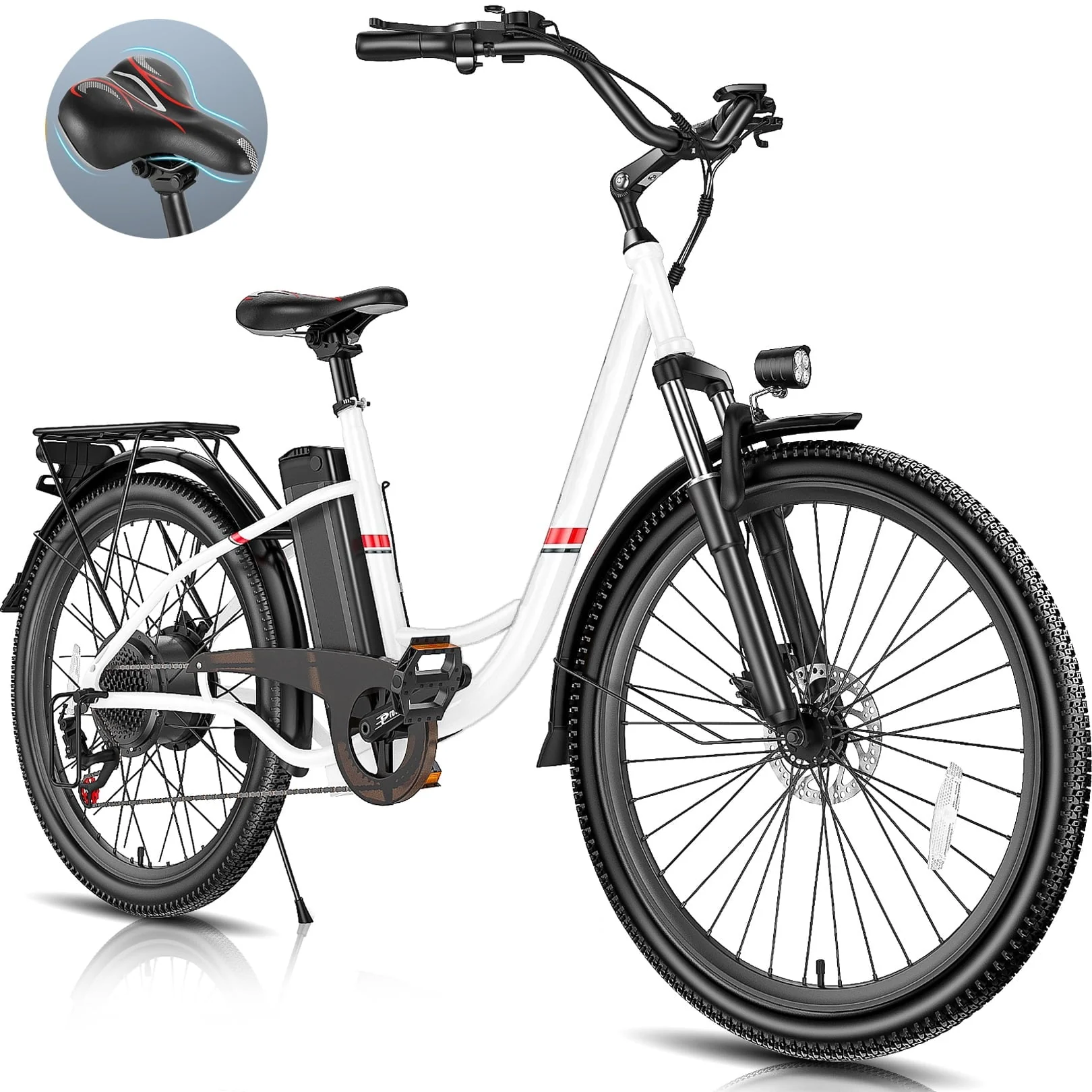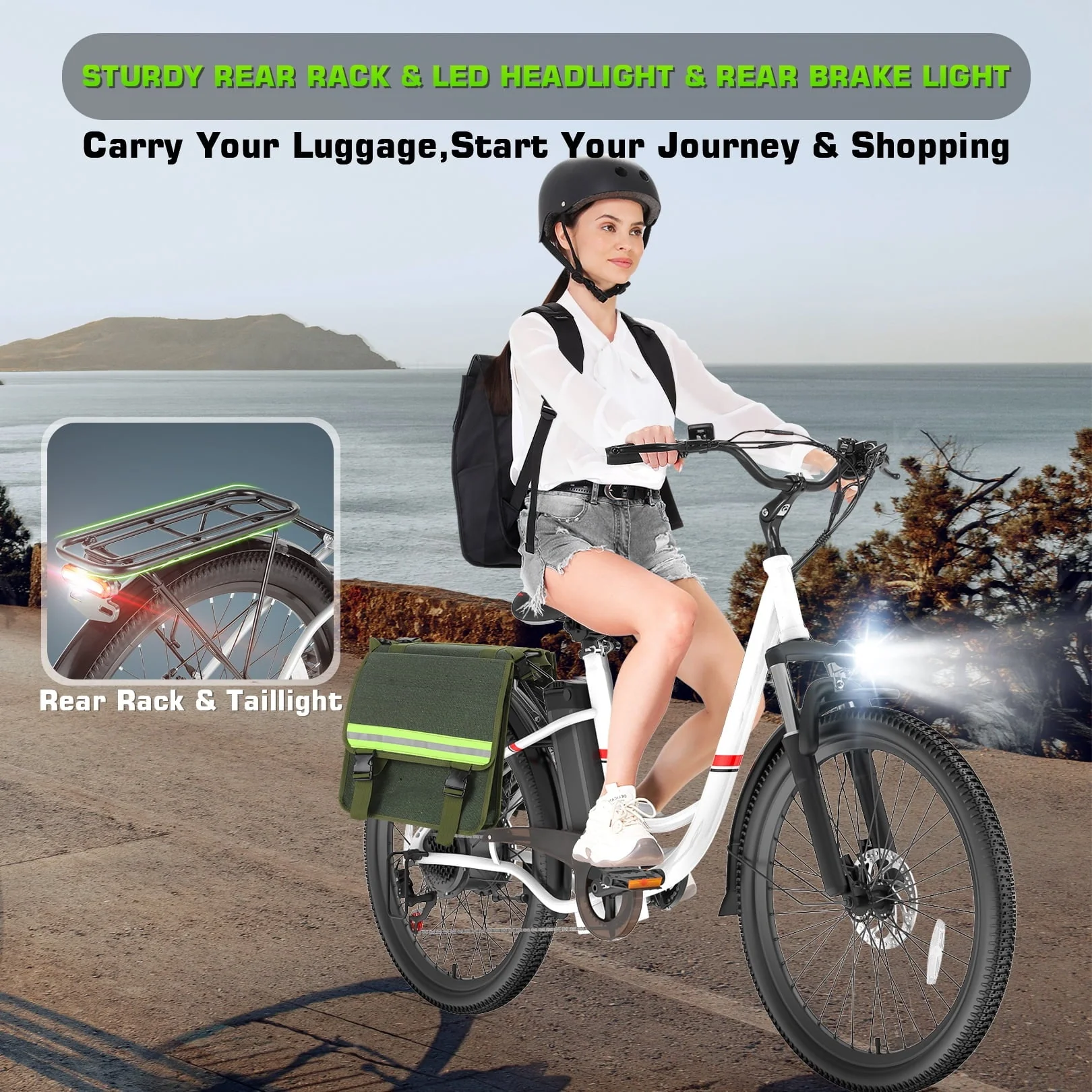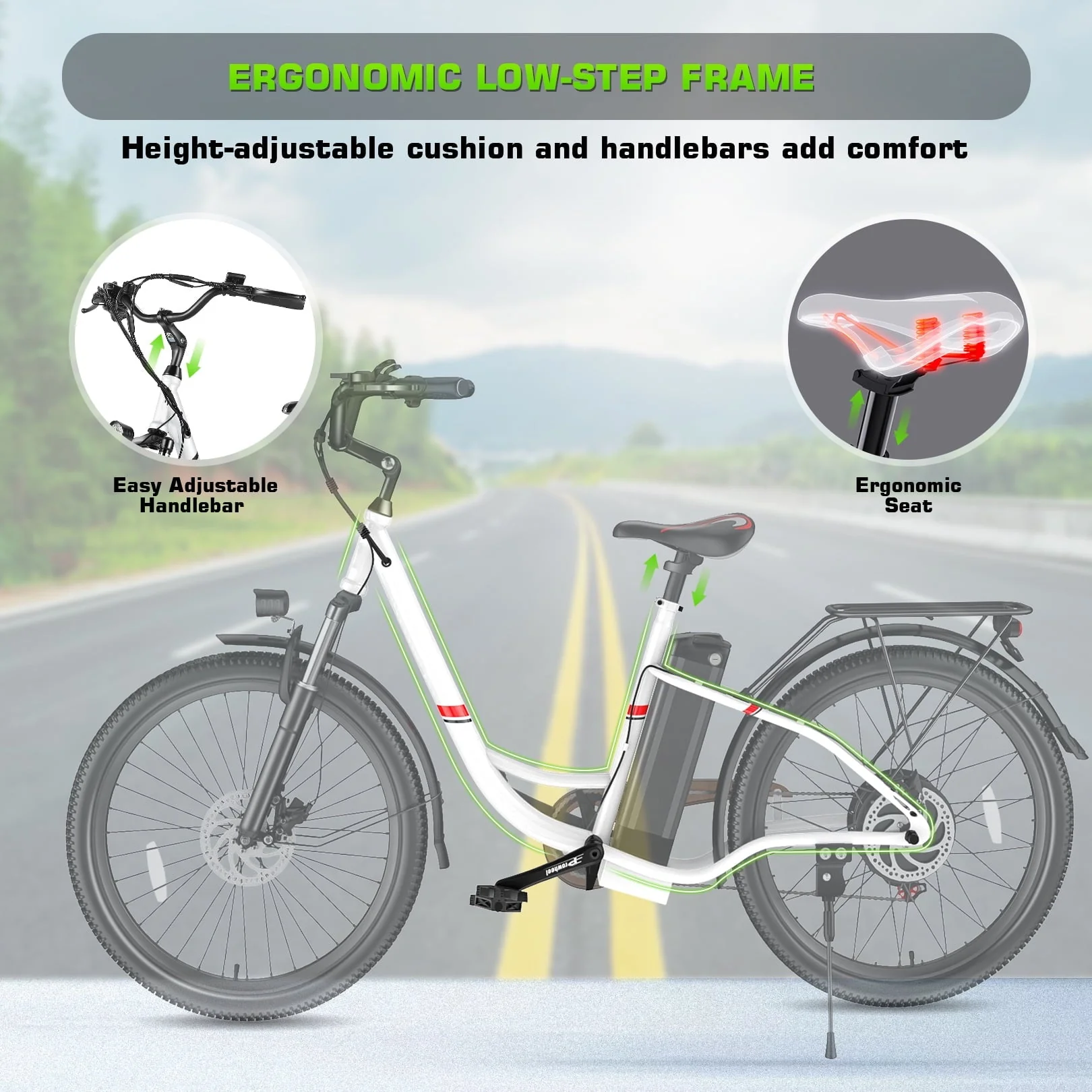 �?strong>STEP-THROUGH COMMUTER BIKE DESIGN�?--- This 26 inch electric bike with a low step frame, wide swept-back handlebar and adjustable soft cushion prioritize your riding safety and comfort, making the cruiser e-bike suitable for both young riders and adults on city commutes. Bright LED headlights, rear brake lights, and bell for nighttime riding safety. Plus, the electric city bicycle includes a stylish and functional rear luggage rack with a carrying capacity of 55 pounds, perfect for accommodating shopping baskets, briefcases, suitcases, and more.🛍�?/p>