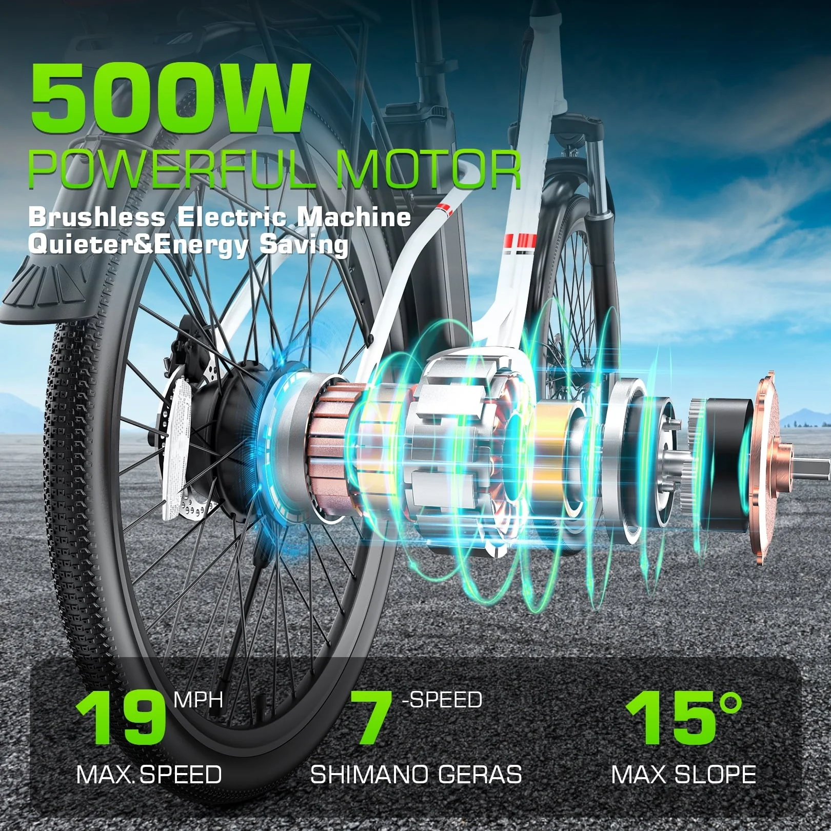 ★�?strong>POWERFUL 500W MOTOR AND 15° CLIMB�?--- Commuter ebike for adults boasts a powerful 500W rear hub motor, enabling a top speed of 19 MPH. This enough power ensures smooth ascents on moderately steep hills, making it perfect for daily commutes, grocery shopping, or leisure travel. Equipped with Shimano 7-speed professional gear for flexible shifting on any terrain, peak power:600W, no pressure 15° climb.
