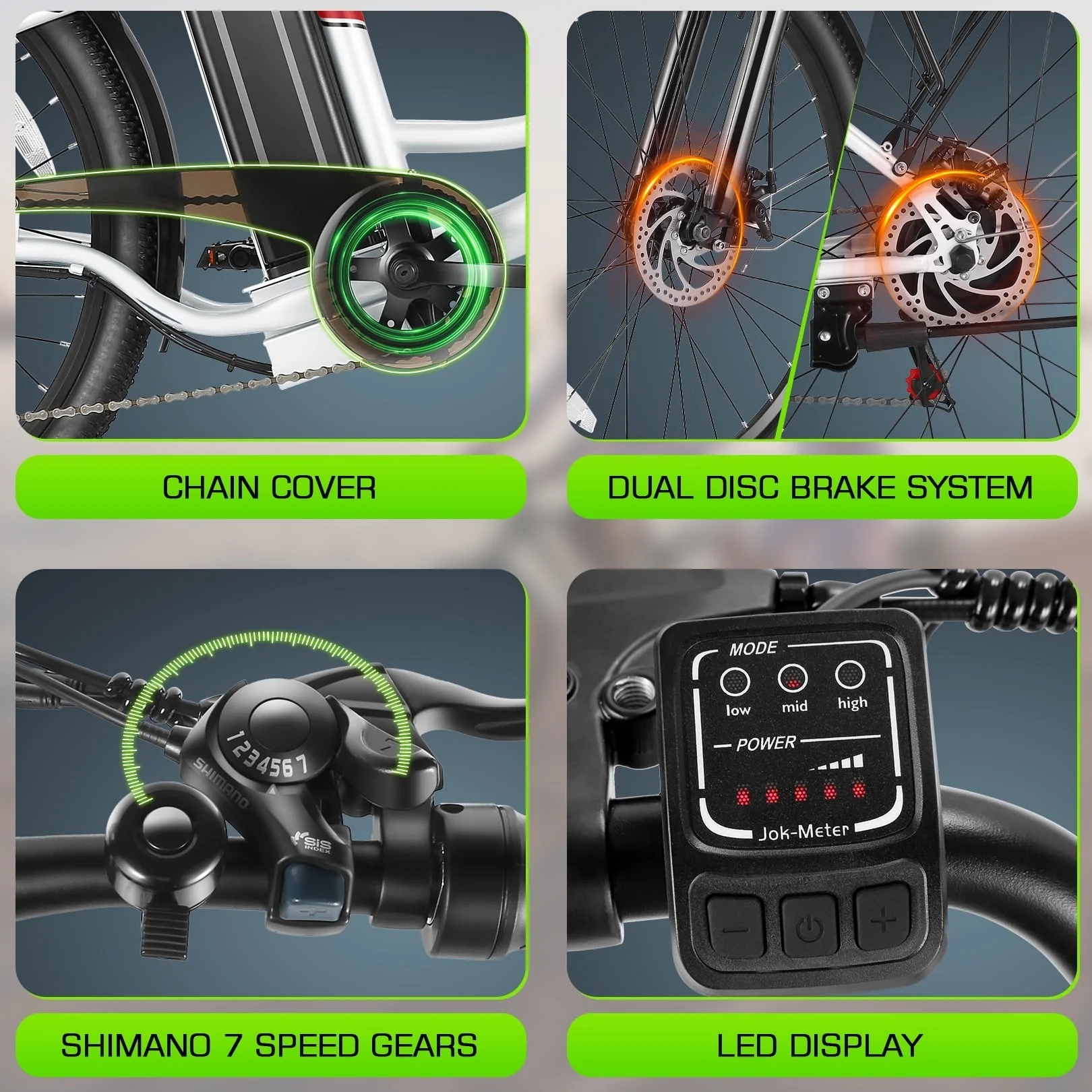 �?strong>5 RIDING MODES�?-- Explore the versatility of this electric cruiser bicycle with an LED display that offers 5 unique riding modes: bike mode, throttle mode, pedal assist mode, booster mode, and cruise control mode. When tackling uphill terrain, simply long-press the "-" button to engage booster mode, making uphill climbs a breeze. Alternatively, in throttle mode, you can activate cruise control mode with the power switch, ensuring a smooth and enjoyable ride while taking in the scenic views.