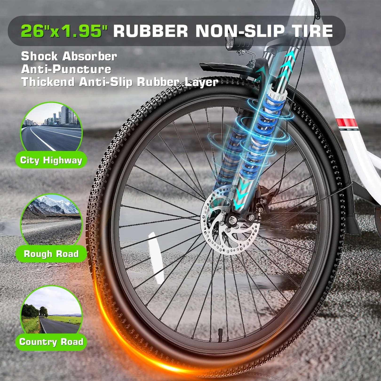 �?strong>SHOCK-ABSORBING BRAKING SYSTEM�?-- Adult electric bike with a professional suspension fork and 26" wear-resistant and anti-puncture tires. Absorb road bumps, bring cushioning to the electric city bicycle frame and the rider, and reduce the injury to the electric bicycle and the rider's stress. The front and rear disc brakes achieve progressive braking throughout the day, effectively shortening the braking distance, and ensuring a step-through e-bike to ride on suburban, city roads, trails, and gravel roads.🏞�?/p>