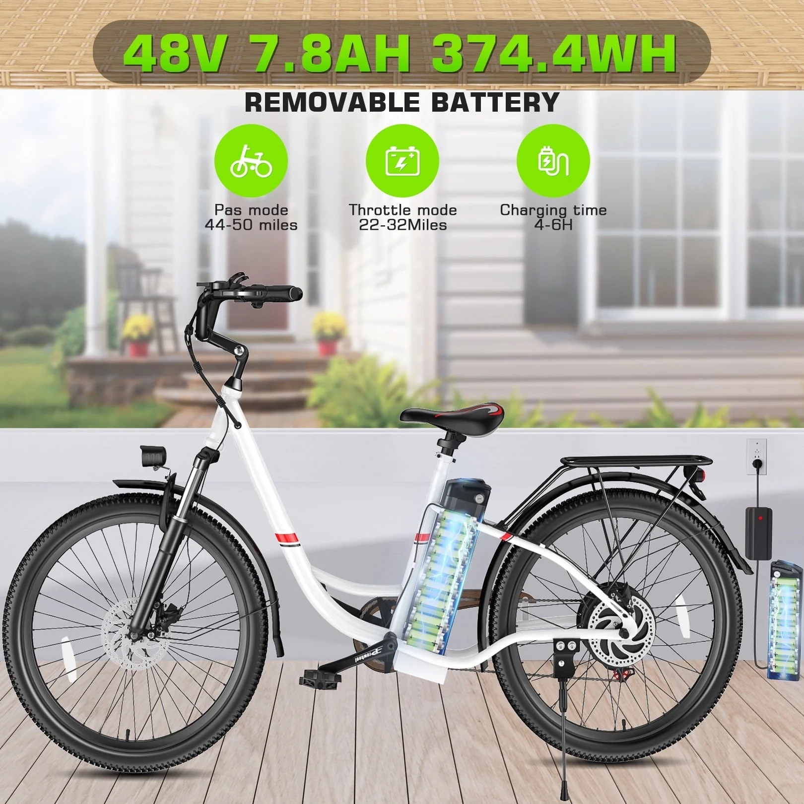 �?strong>48V 7.8AH REMOVABLE BATTERY�?-- Electric City Bike features a removable 48V 7.8Ah 374.4Wh lithium-ion portable battery with enhanced BMS power-saving capabilities. Charging time has been significantly reduced to 4-6 hours for your convenience. With a range of 44-50 miles in pedal assist mode and 22-32 miles in throttle mode, it easily meets your daily commuting and round-trip needs. 🏢