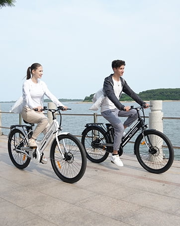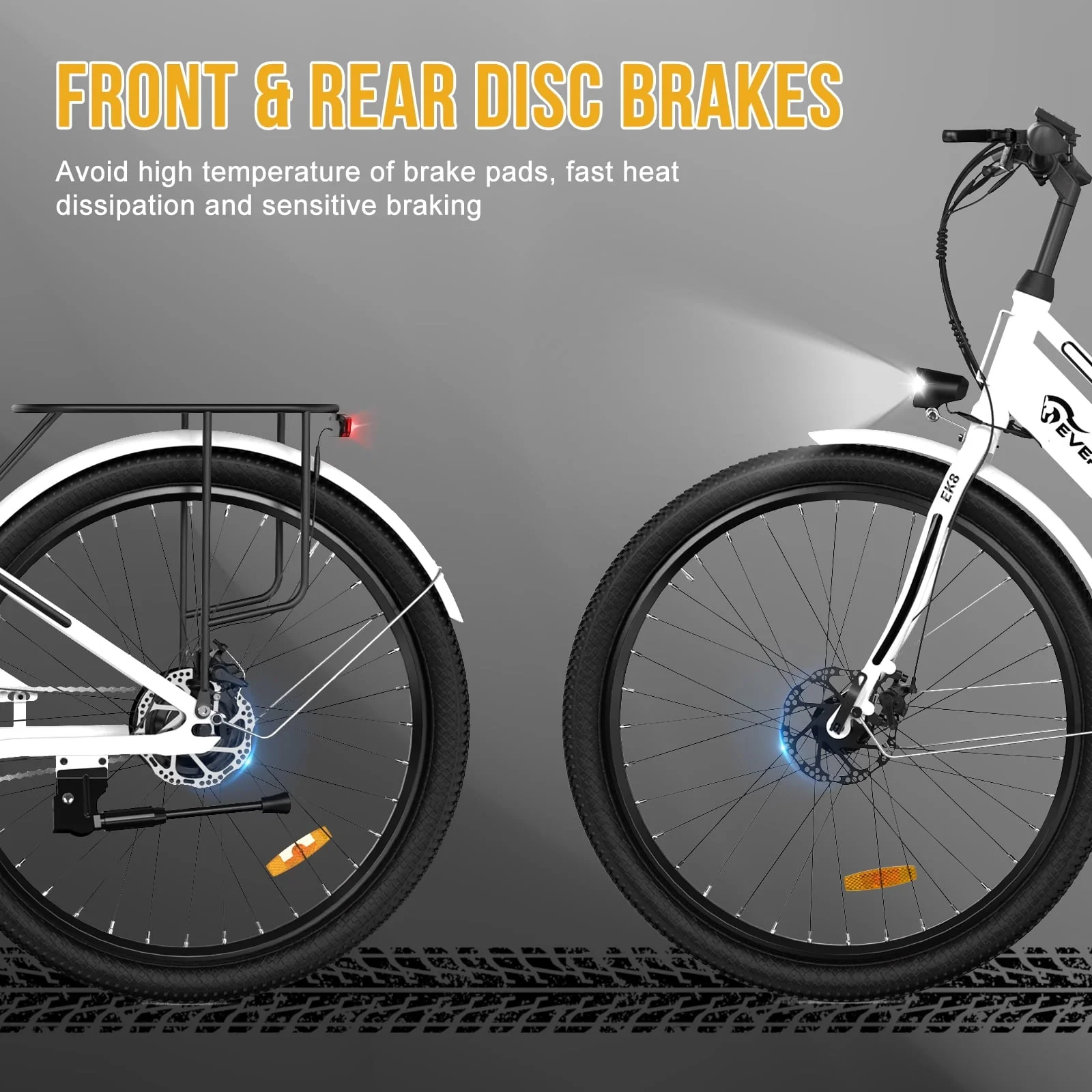 Excellent Shock Absorption: Equipped with a front shock absorbers, while high-volume low-pressure tires also act as additional shock absorbers, providing more balance and control on rough mountain roads. The front and rear double disc brakes and electronic brakes realize all-round safe driving protection. The integrated lighting system and reflectors keep you visible and secure during night rides.