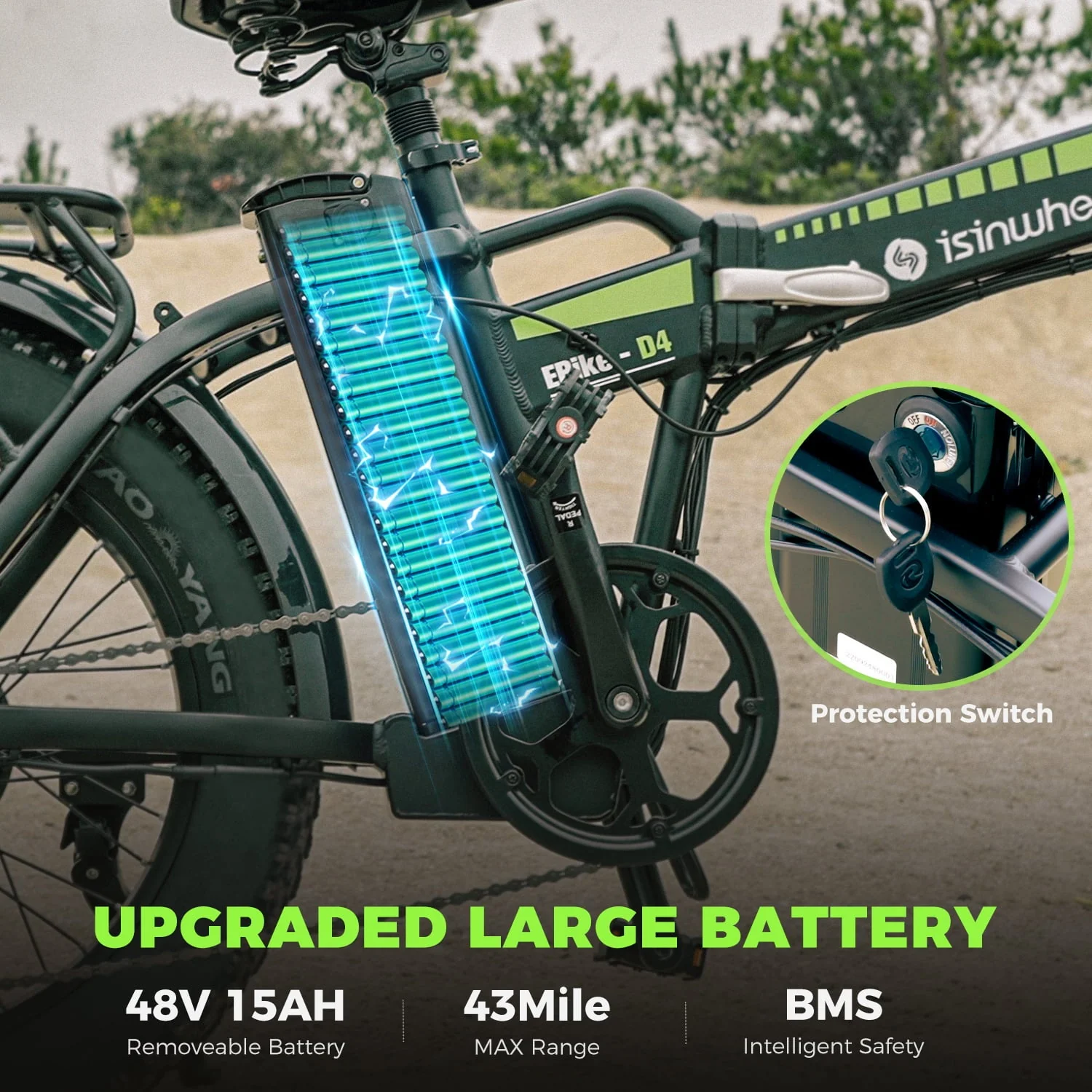 �?5Ah Large Capacity & Removable Battery�? D4 electric bicycle for adults comes with a 48V 15Ah removable Lithium-ion battery. Charing in a mere 6-8 hours, this electric bike is able to achieve 39-43 miles in pure electric mode and 48 miles in pedal assist mode (PAS mode). The removable battery can be charged anywhere you want.
