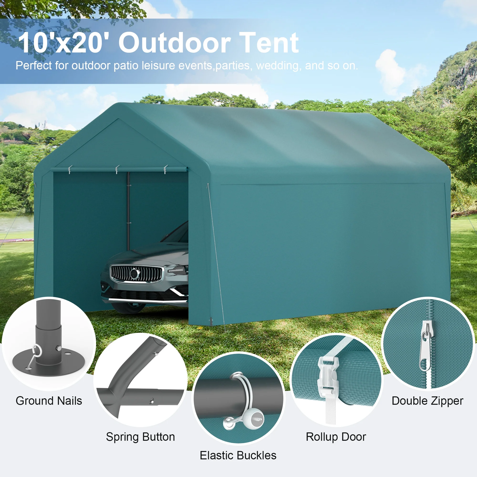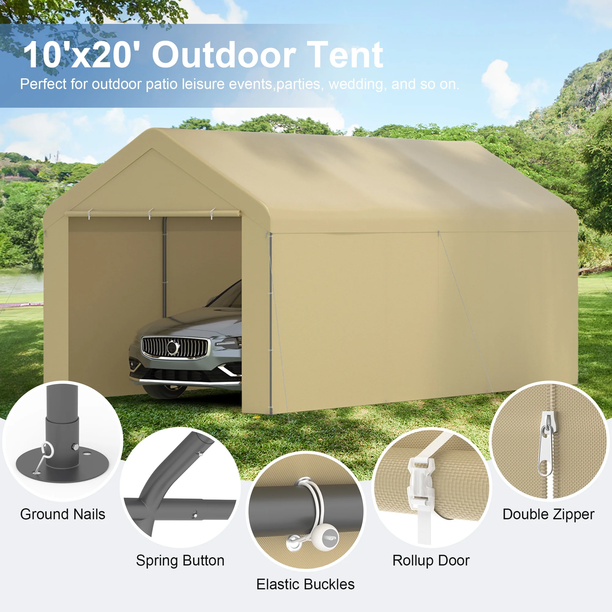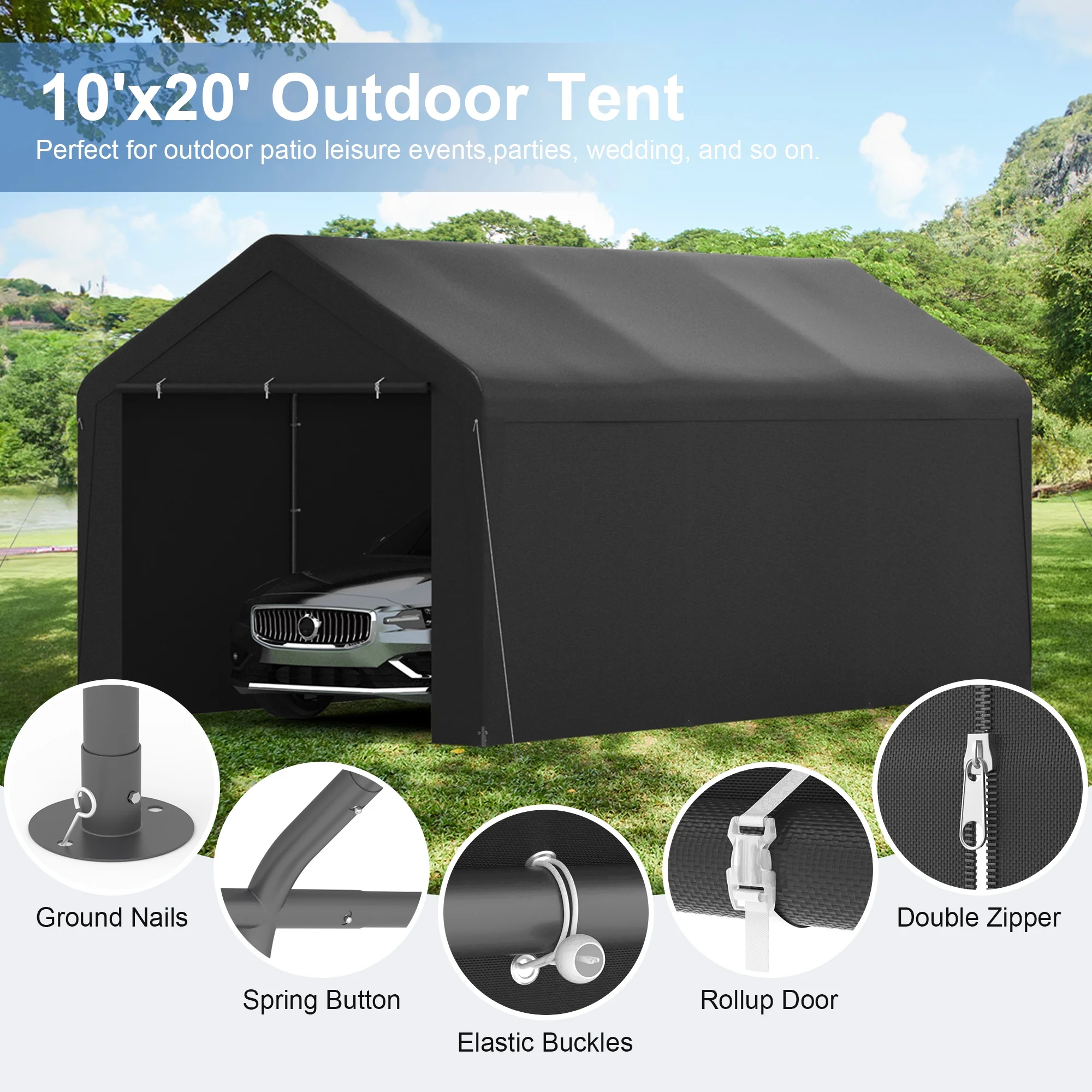 - 【Protection from the Elements】This high-quality carport with side walls offers superior protection for your vehicle. Measuring 10 feet by 20 feet, it provides ample coverage to shield your car from various elements.【Roll-up Zipper Door】Front and back doors with double zippers and buckles can be removed, make 10x20 heavy duty carport easy access for use and providing excellent ventilation.【Removable Sidewall】The side walls add extra privacy and protection, keeping your vehicle safe and secure. Made from long-lasting materials, this car canopy is built to last and can withstand different weather conditions.【Spring button Connector】High strength 1.5 inches diameter and 1mm thicken grey powder coated metal joint fittings, Includes anchoring kit; foot plate and wind rope to keep metal carport rooted.【Easy Assembly】Featuring easy assembly, you can quickly set up the portable garage without any hassle. Car port comes with sturdy frames that provide stability and durability.【Multipurpose Carport】The canopy tent is designed to be versatile, allowing you to use it for various purposes such as parking your car, storing equipment, or creating a covered area for outdoor activities.