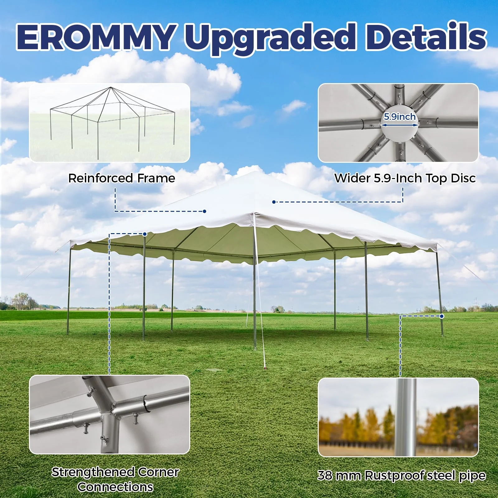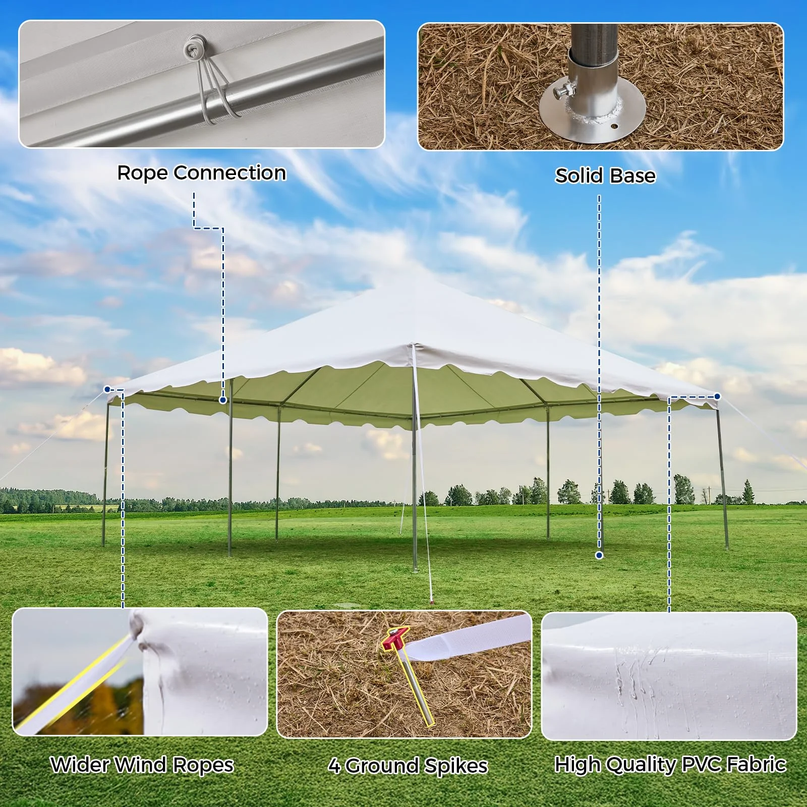 - 【UPGRADED GALVANIZED FRAME】This upgraded heavy-duty party tent adopts 1.5'' diameter powder-coated steel pipe and 1.65'' diameter metal connectors, which are rust-proof and durable. The special diagonal bracing structure makes the entire party tent more sturdy