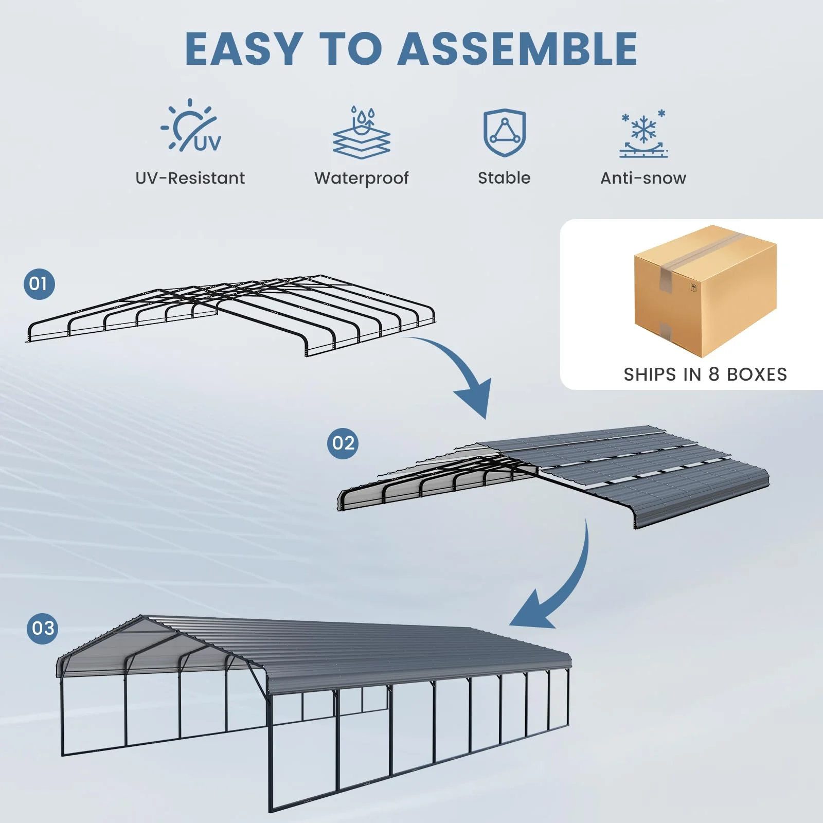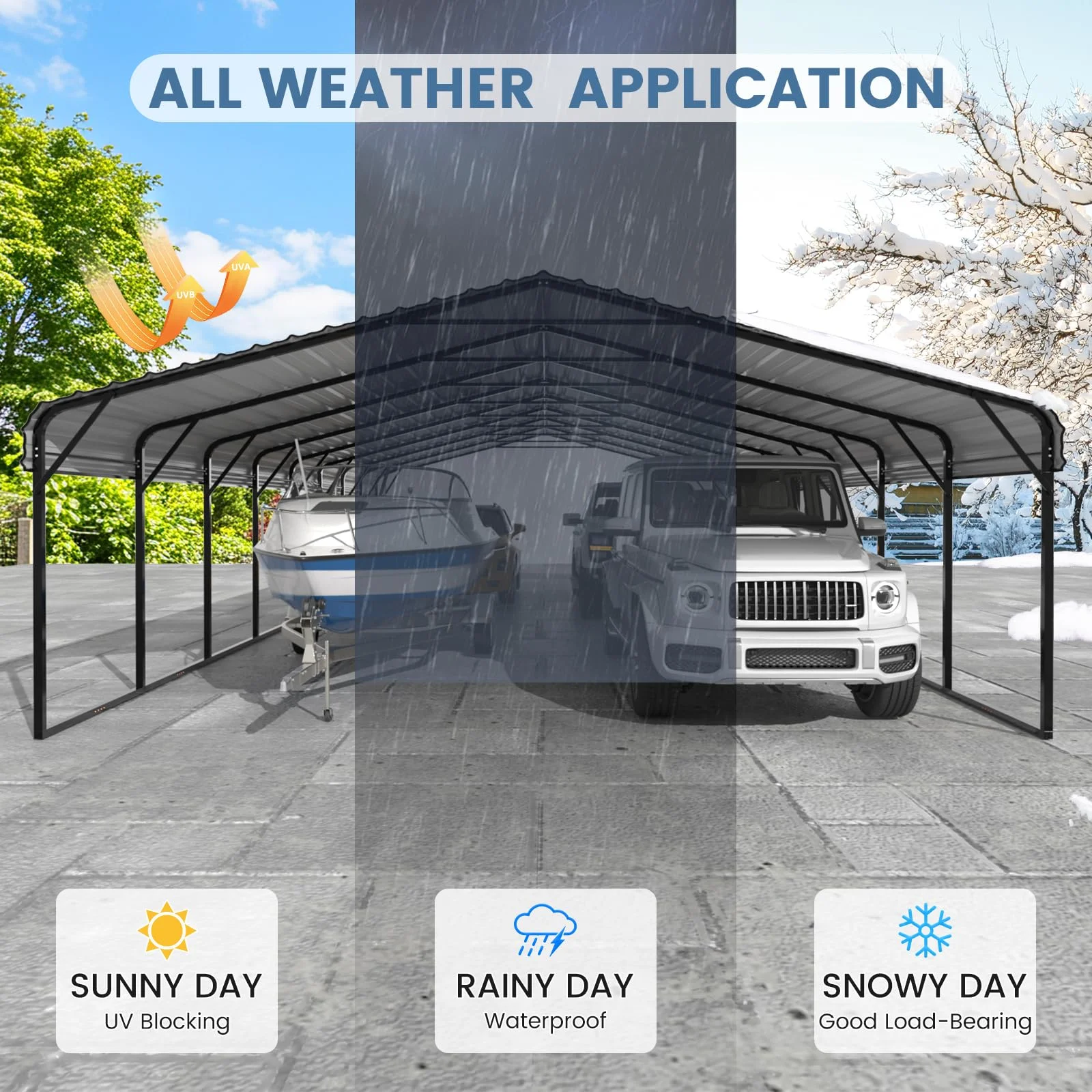 - Engineered with 10 rust-resistant 2"x2" steel poles and 15 reinforced cross beams to withstand 100 MPH winds and 40 PSF heavy snow loads, providing heavy-duty all-weather protection for your vehicles, boats, or tractors.