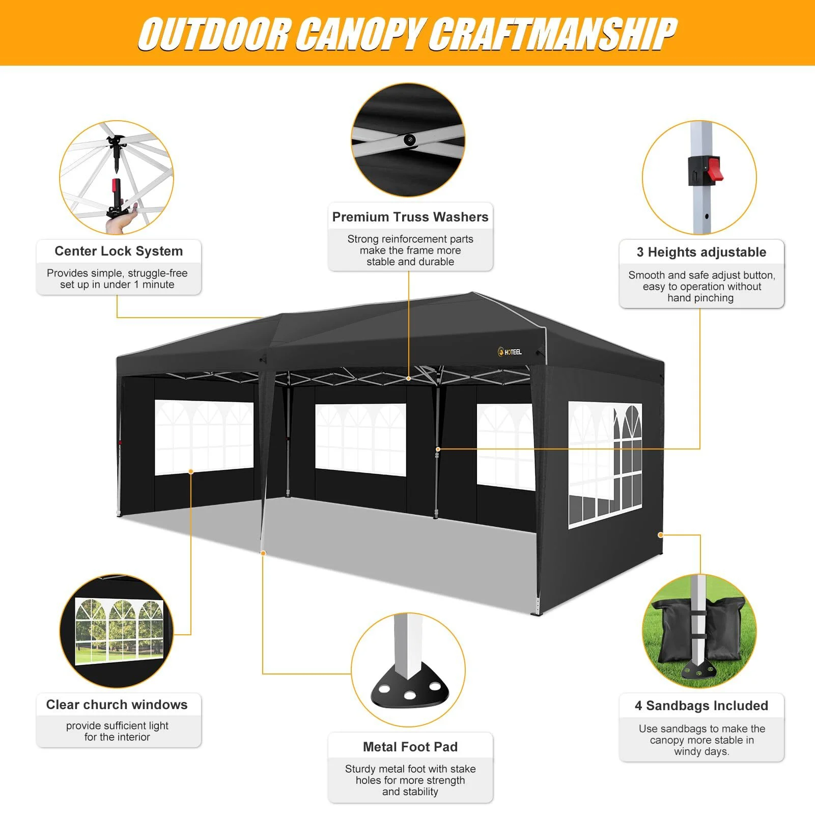 HOTEEL 10x20 Pop up Canopy with Sidewalls, One Push Outdoor Tents for Parties Waterproof Canopy Tent with Reinforce Rod, Easy Setup Event Tent with Sandbag for Backyard, Camping, Market, Black