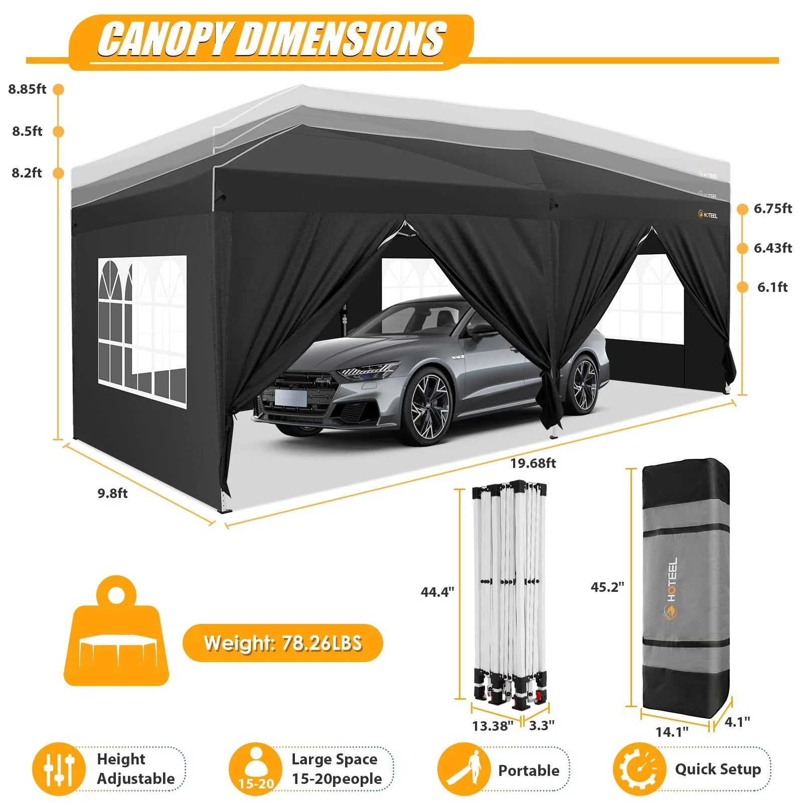 Fabric & MaterialWaterproof 420D Oxford cloth and a whole steel frame, Canopy roofs are 100% Waterproof with heated sealed seams.Number of Side WallsWe got 6 removable sidewalls, 2 panels with zipper, 4 panels with clear window.Adjustable HeightOur canopy tent has 3 adjustable height. 8.85FT to the peak of the roof and 5.97ft around the edge of the roof when the canopy is at maximum height. - Package Includes1 canopy frame, 1 canopy cover, 4 sidewalls with clear window, 2 sidewalls with zipper, 6 ropes, 12 metal stakes, 1 carry bag.Item Size When Installed10'L×20'W×8.85'HPackage Size46.4x8.6x16.5inches ColorWhite/Black/Blue/Gray KhakiItem Weight78.2lbNote 1Store the canopy tent in a dry place.Note 2Do not use this party tent in heavy stormy weather, to extend its service life. Remove the top cover and take down the canopy to the lowest in heavy rain or strong wind days.Note 3The canopy can be used on many surfaces such as grass, sand, concrete, patios, etc. However, always use the supplied leg weights and guy rope and pegs where possible.