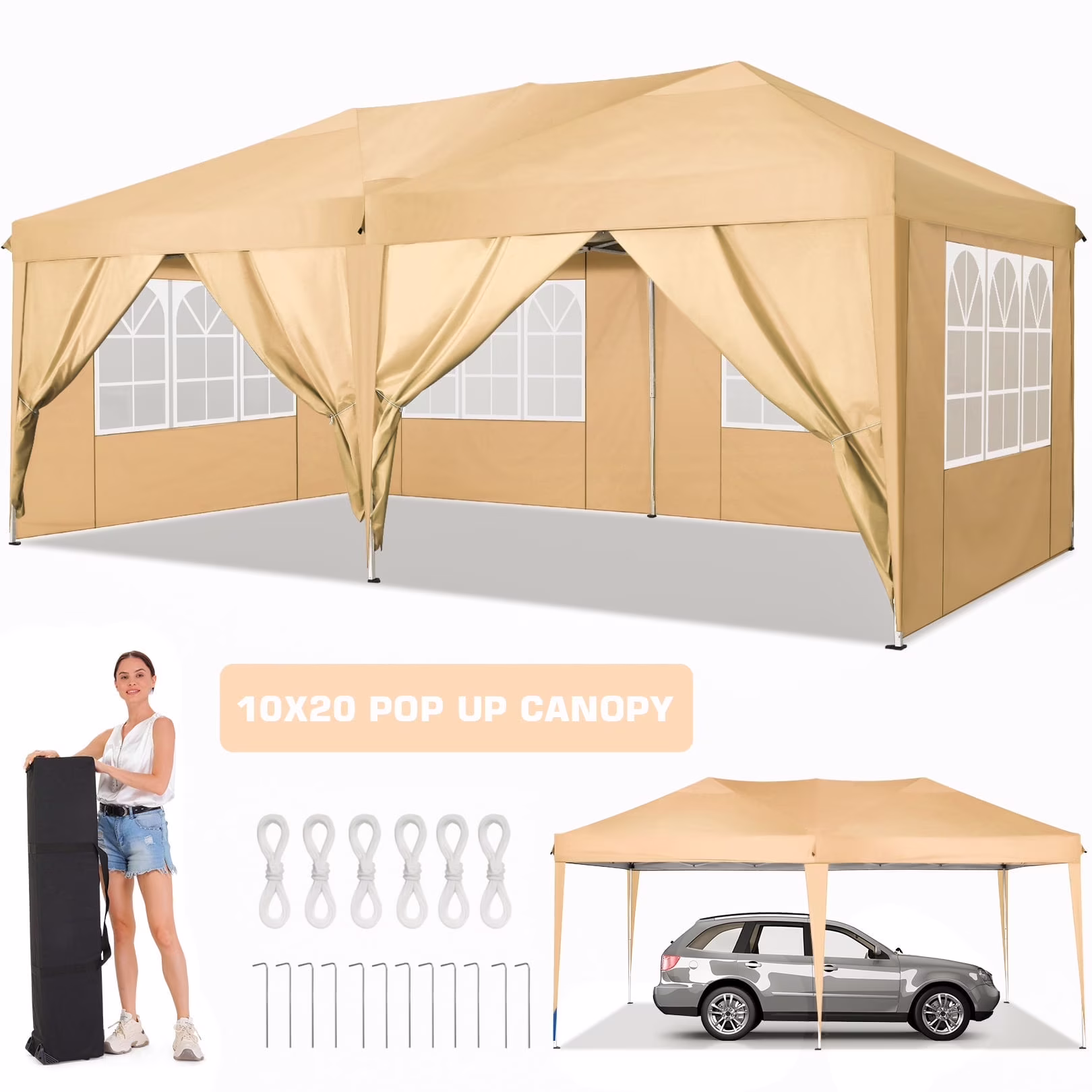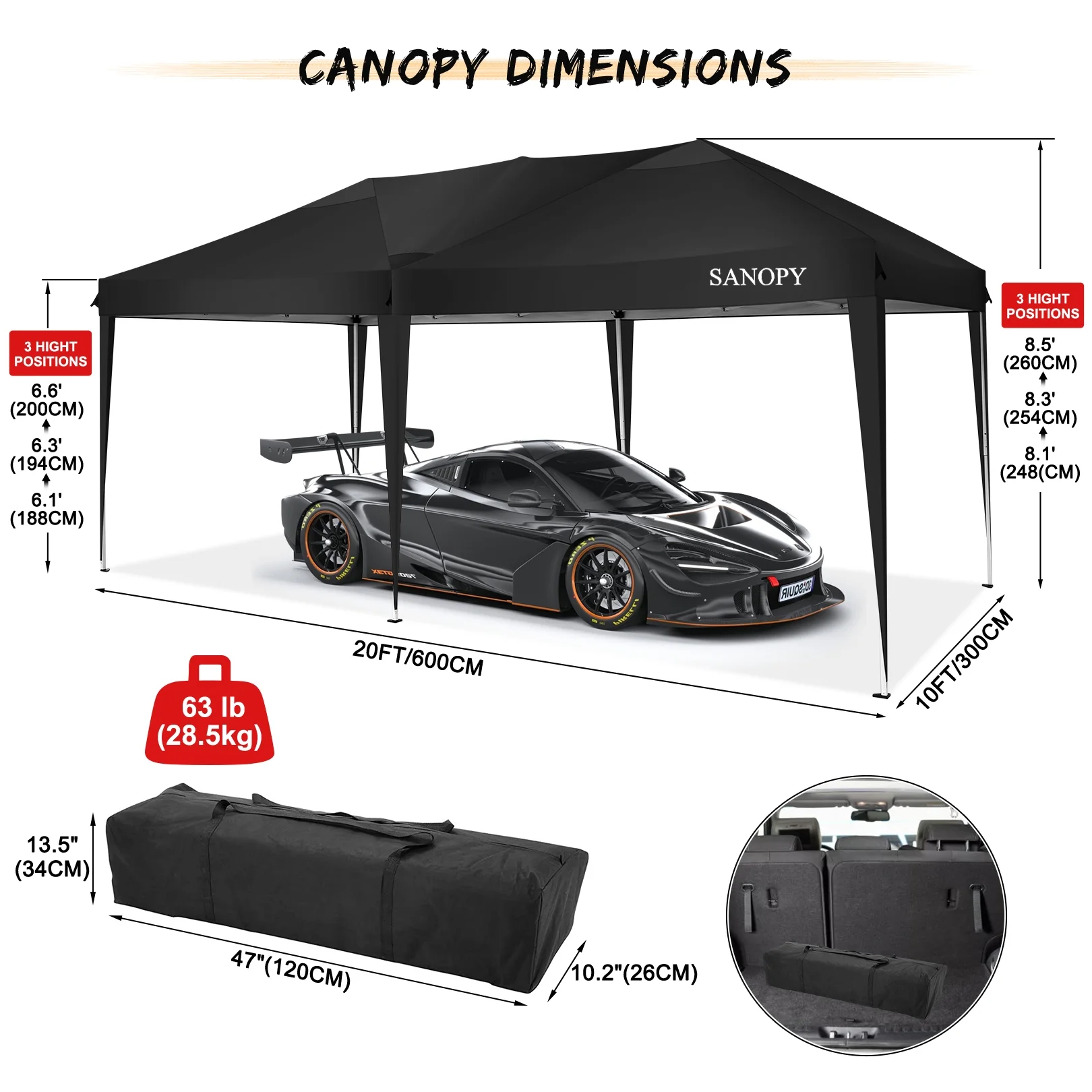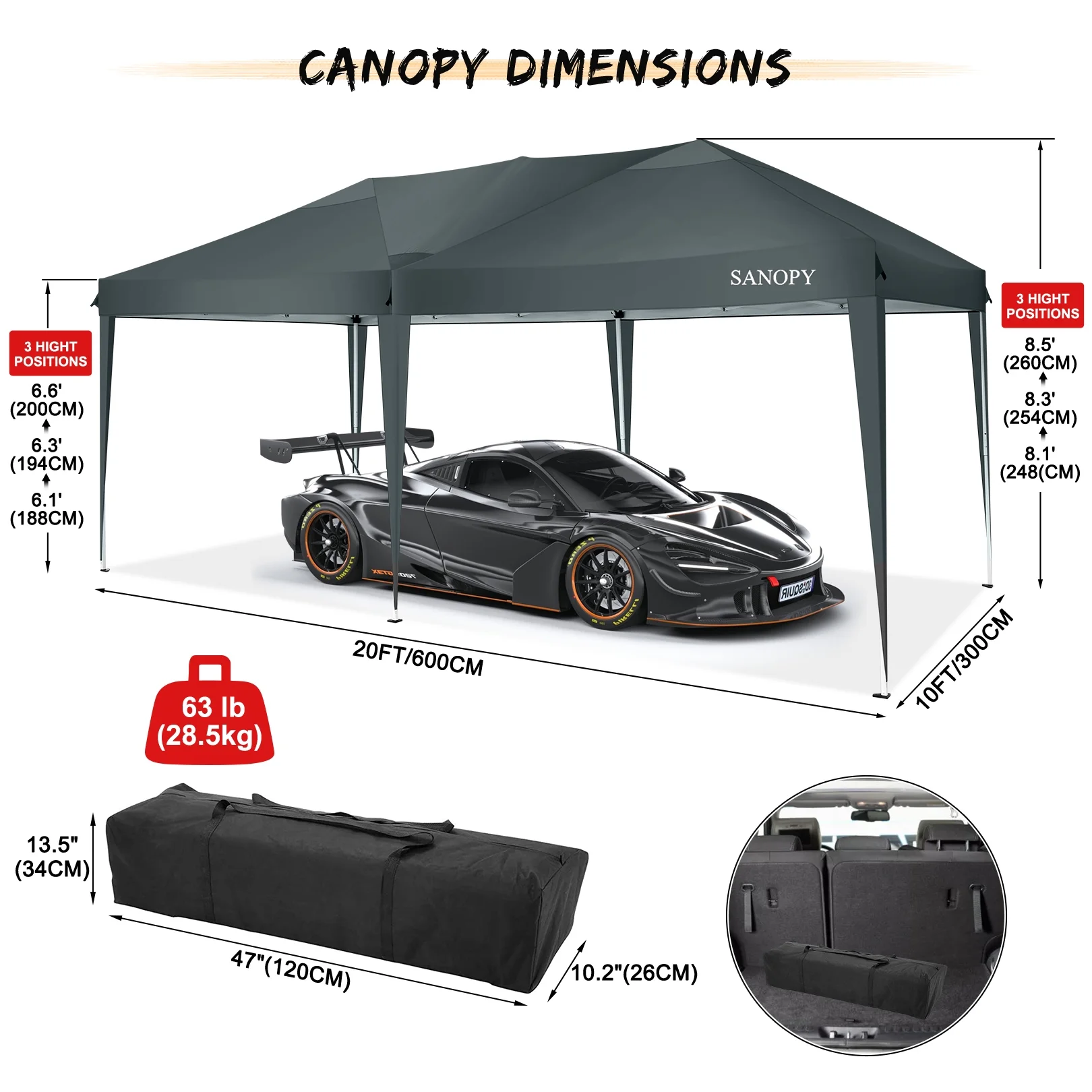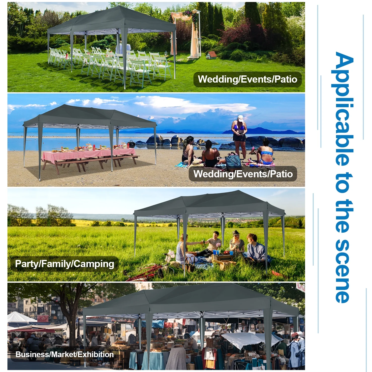 The 10 x 20 Ft canopy tent is constructed with a one-step setup steel canopy frame, waterproof canopy top, stakes, and canopy rope for fastness, which all can be put into a carry bag, easy to carry or stored in the trunks. This canopy tent features an easy setup, is waterproof, windproof, UV protection sturdy, and portable. What is more, the canopy tent height can be adjusted by three levels from 8.1' to 8.5', and the pop up tent is available for more than 20 people with tables and chairs. The outdoor tent can be used as a party canopy, wedding canopy, market canopy, backyard canopy, beach canopy, etc.