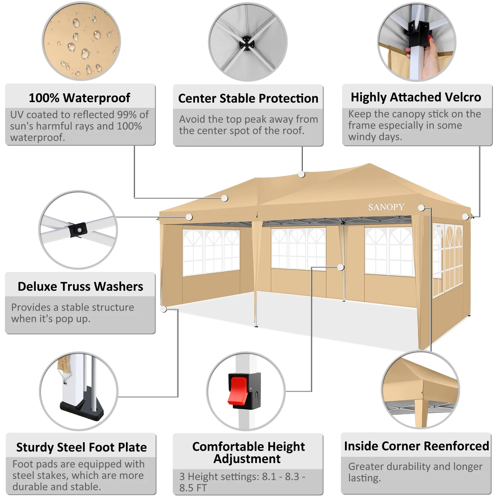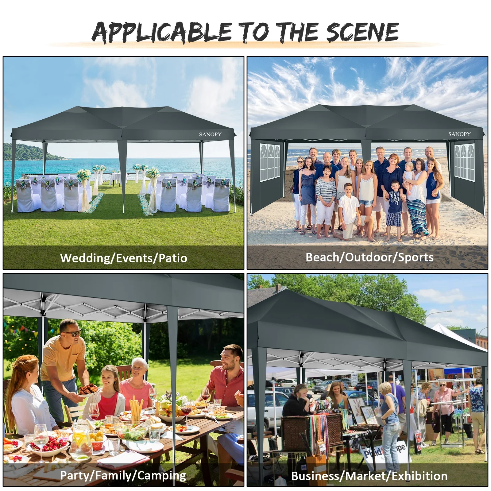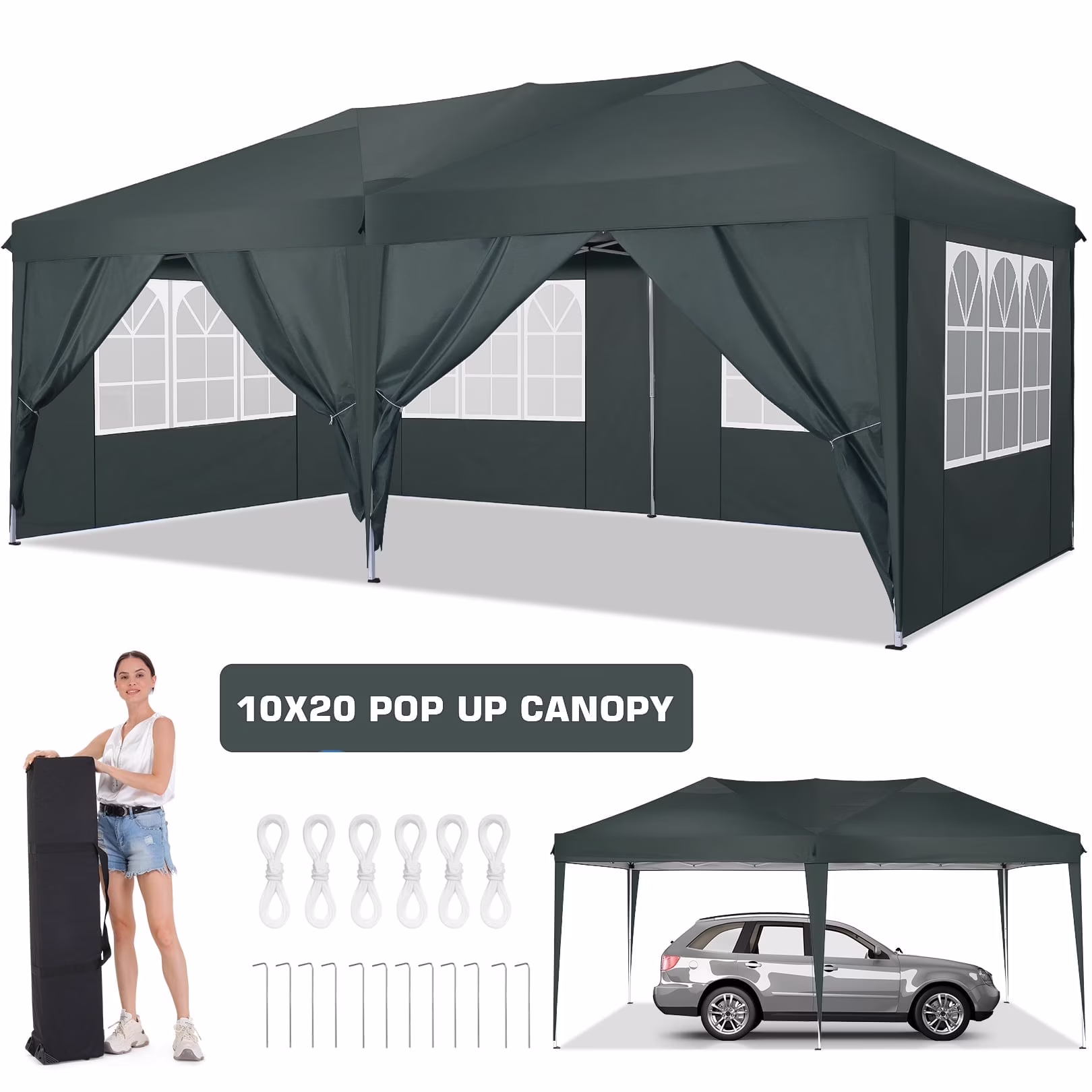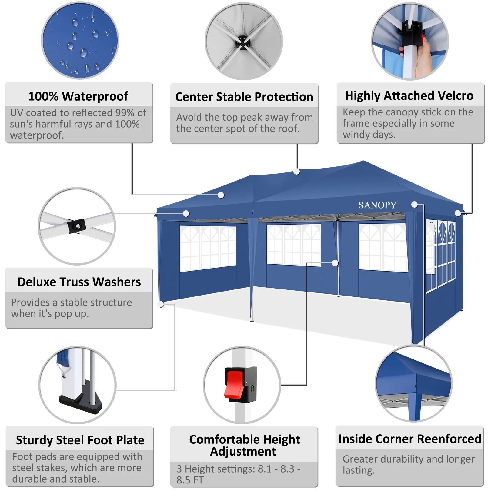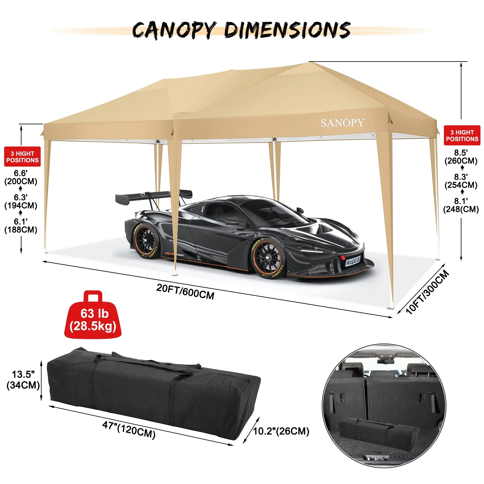 The 10 x 20 Ft canopy tent is constructed with a one-step setup steel canopy frame, waterproof canopy top, stakes, and canopy rope for fastness, which all can be put into a carry bag, easy to carry or stored in the trunks. This canopy tent features an easy setup, is waterproof, windproof, UV protection sturdy, and portable. What is more, the canopy tent height can be adjusted by three levels from 8.1' to 8.5', and the pop up tent is available for more than 20 people with tables and chairs. The outdoor tent can be used as a party canopy, wedding canopy, market canopy, backyard canopy, beach canopy, etc.