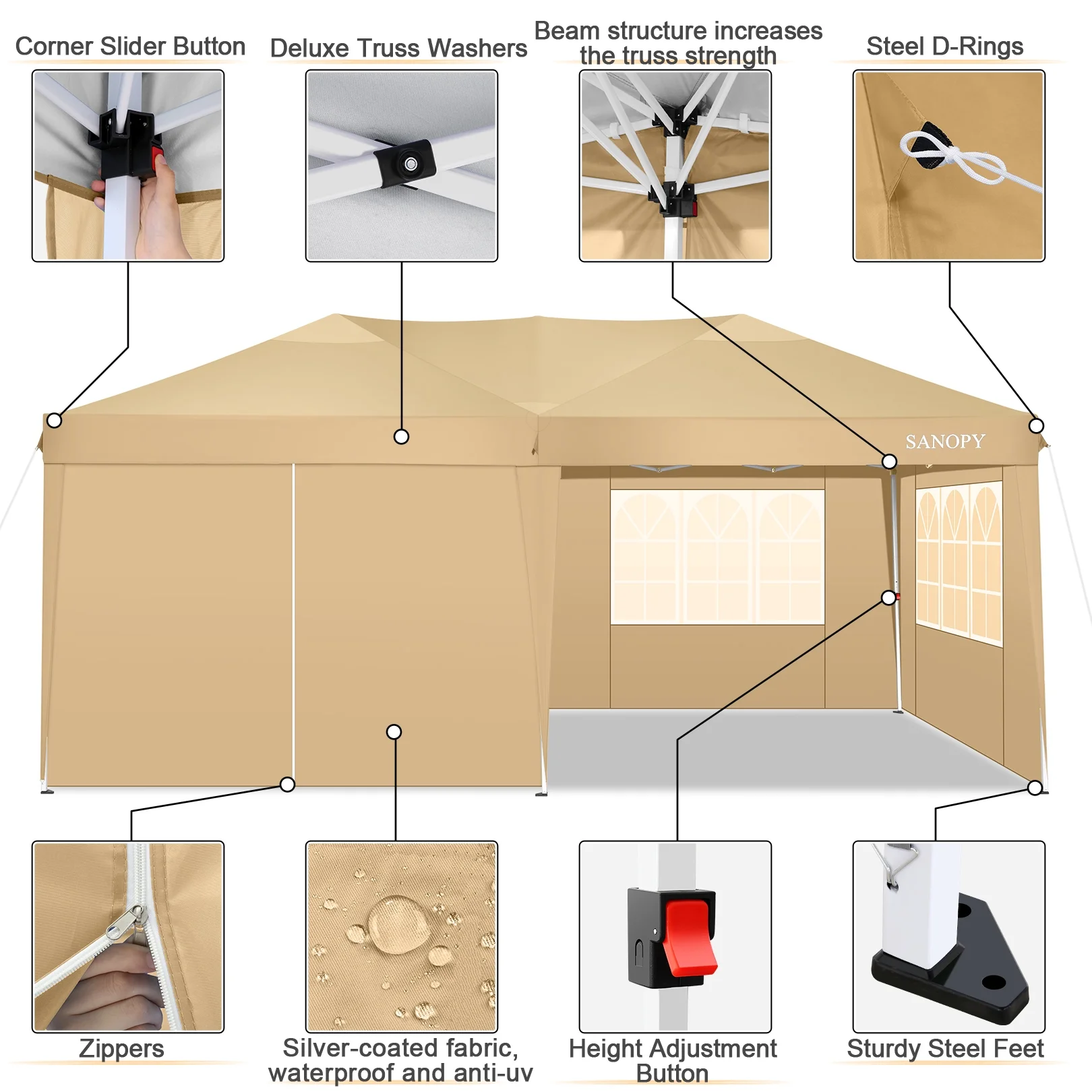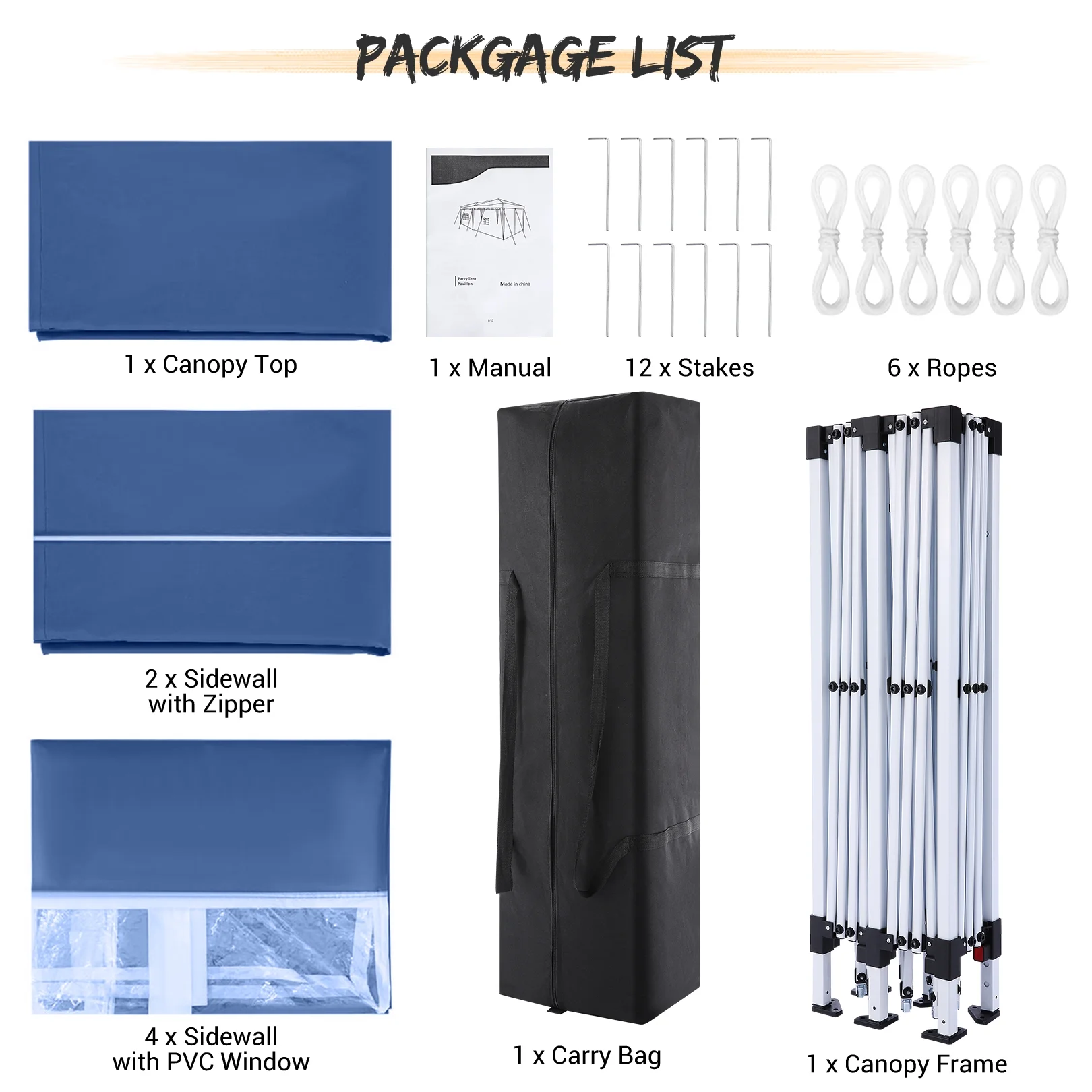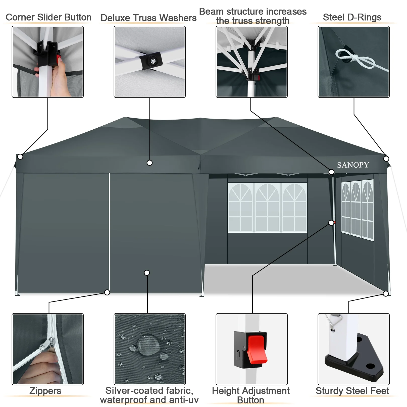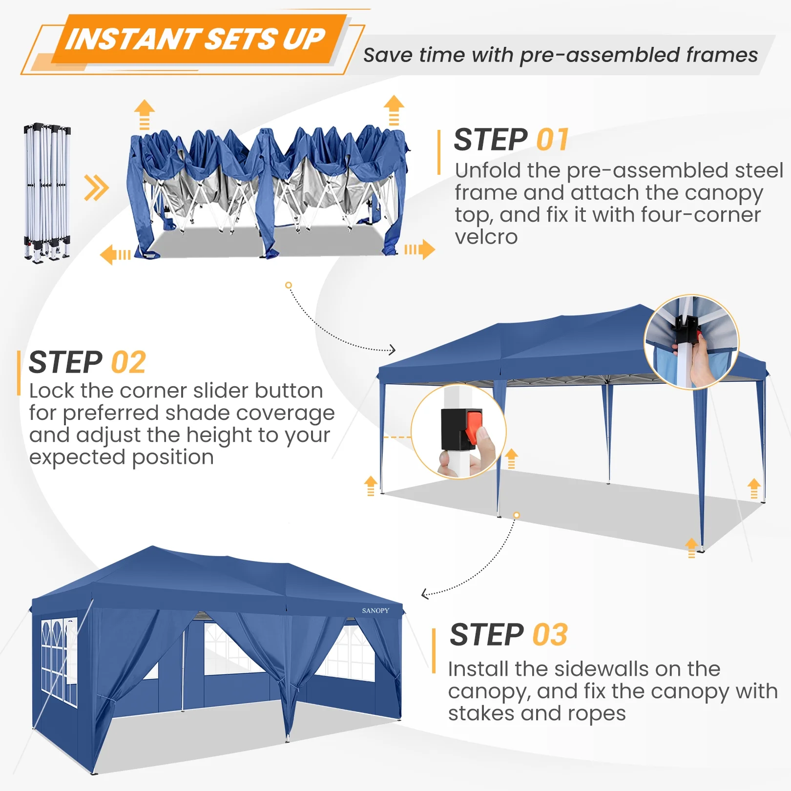 The 10 x 20 Ft canopy tent is constructed with a one-step setup steel canopy frame, waterproof canopy top, stakes, and canopy rope for fastness, which all can be put into a carry bag, easy to carry or stored in the trunks. This canopy tent features an easy setup, is waterproof, windproof, UV protection sturdy, and portable. What is more, the canopy tent height can be adjusted by three levels from 8.1' to 8.5', and the pop up tent is available for more than 20 people with tables and chairs. The outdoor tent can be used as a party canopy, wedding canopy, market canopy, backyard canopy, beach canopy, etc.