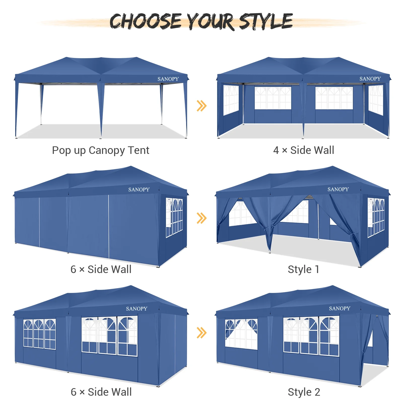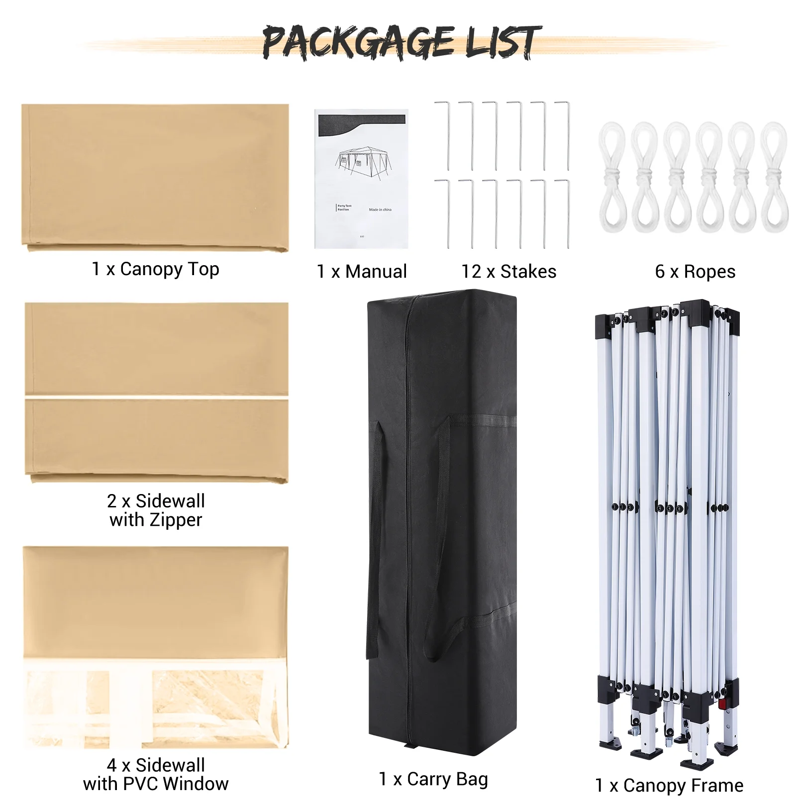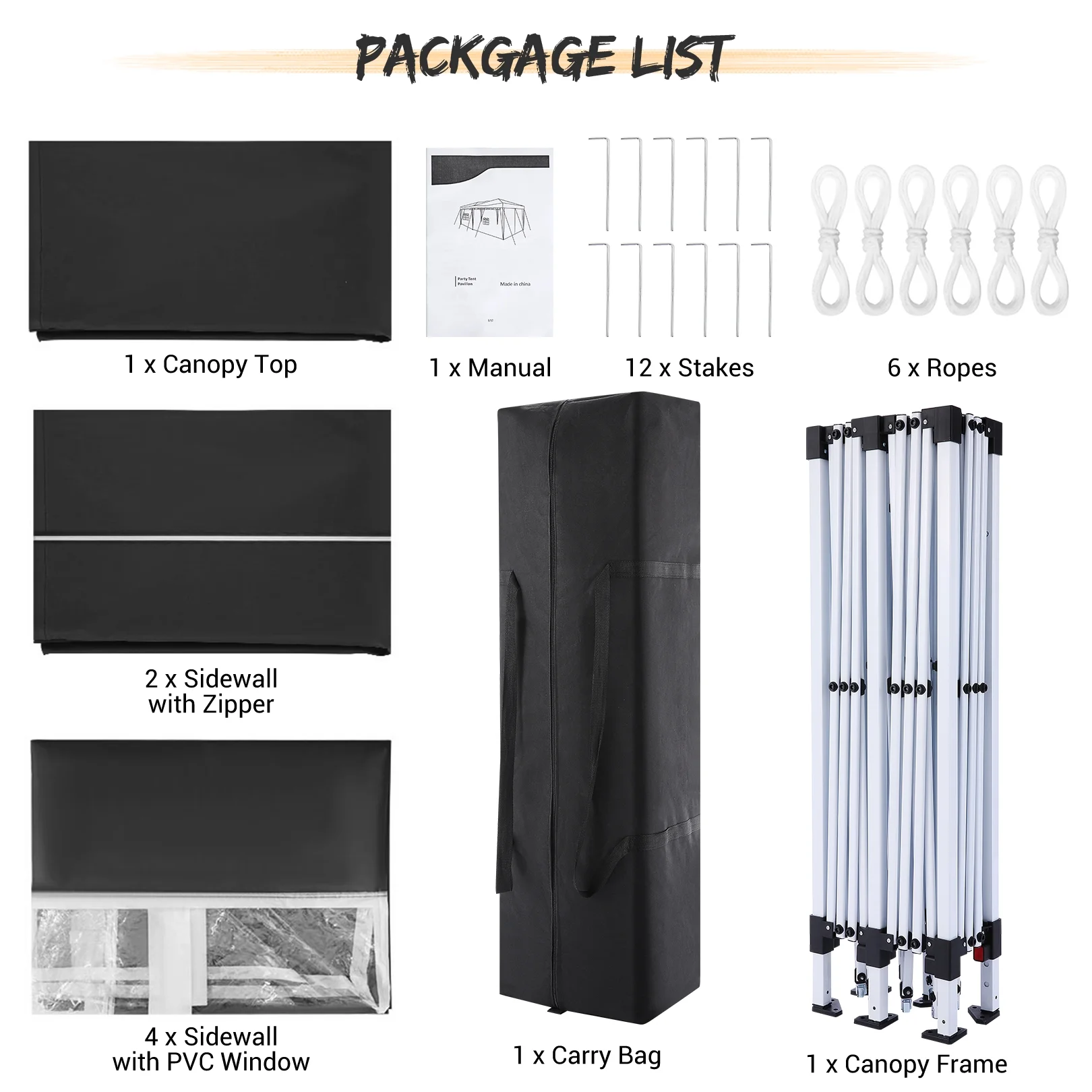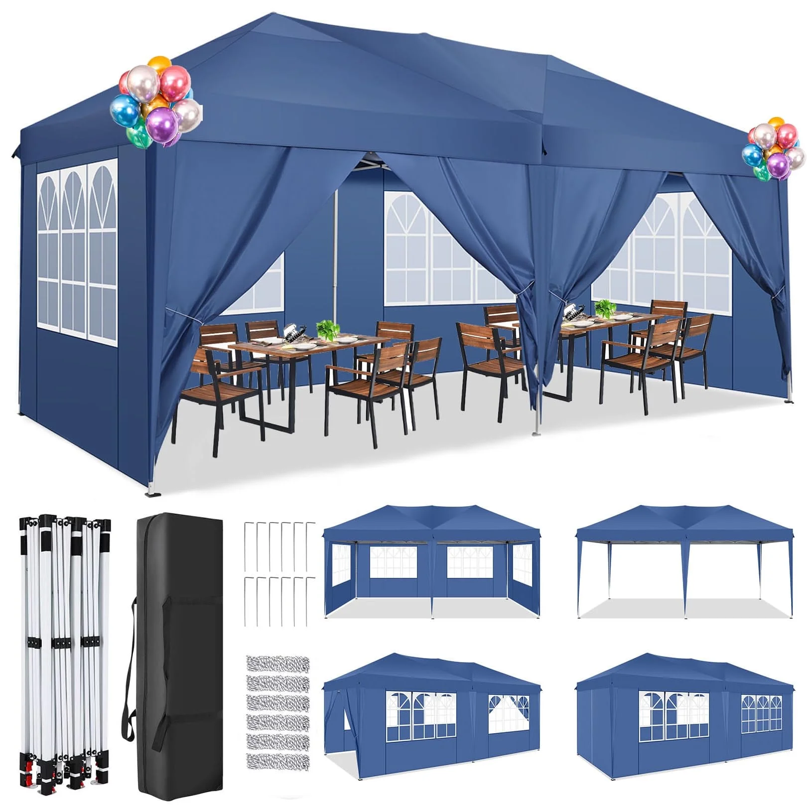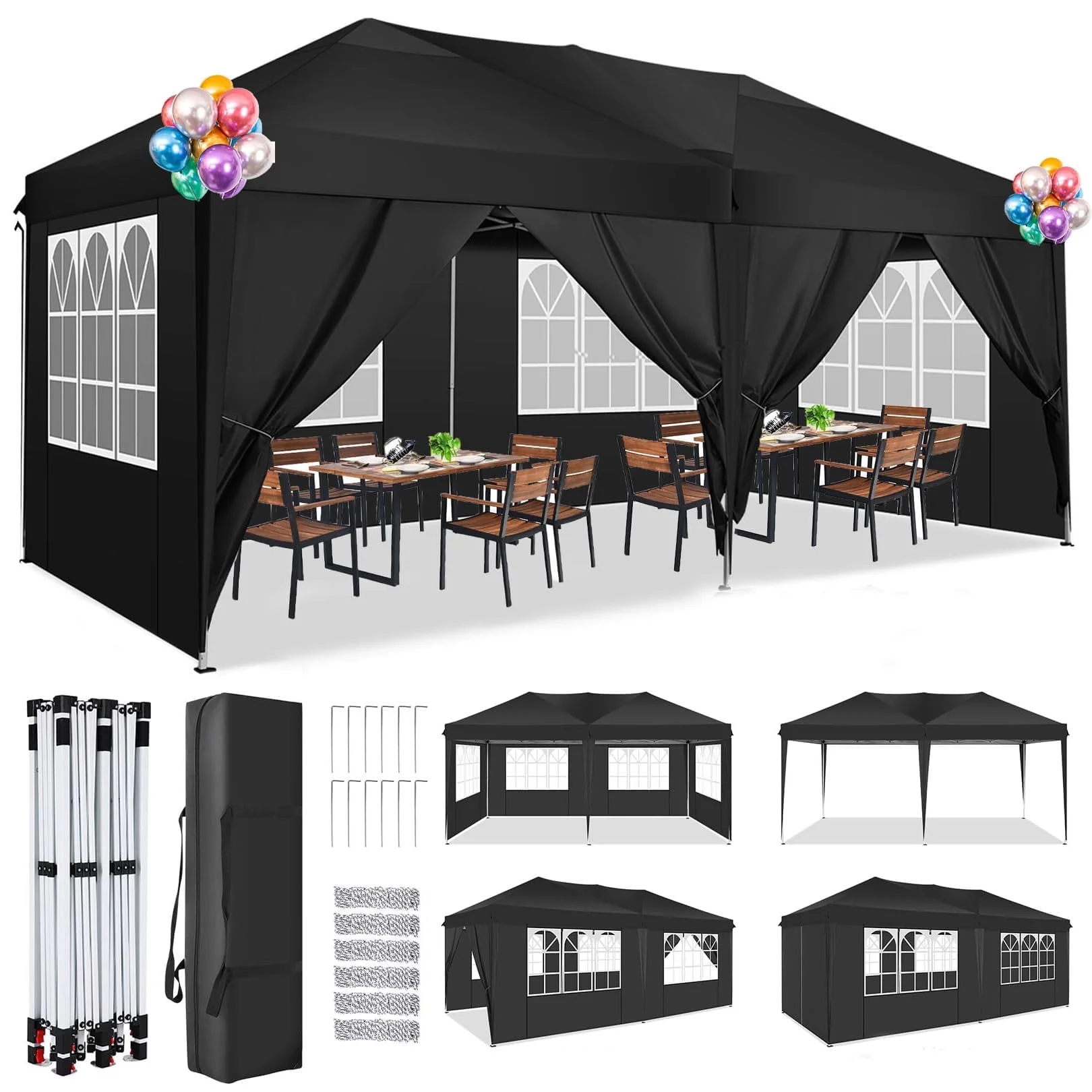 The 10 x 20 Ft canopy tent is constructed with a one-step setup steel canopy frame, waterproof canopy top, stakes, and canopy rope for fastness, which all can be put into a carry bag, easy to carry or stored in the trunks. This canopy tent features an easy setup, is waterproof, windproof, UV protection sturdy, and portable. What is more, the canopy tent height can be adjusted by three levels from 8.1' to 8.5', and the pop up tent is available for more than 20 people with tables and chairs. The outdoor tent can be used as a party canopy, wedding canopy, market canopy, backyard canopy, beach canopy, etc.
