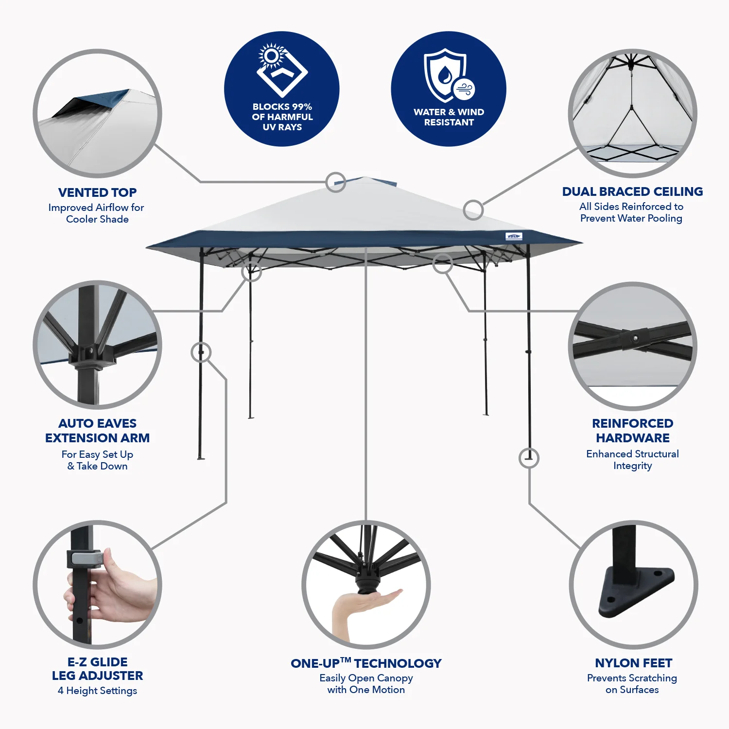 - ONE-UP�?Technology - Easily Open Canopy in One Motion with 1-2 People