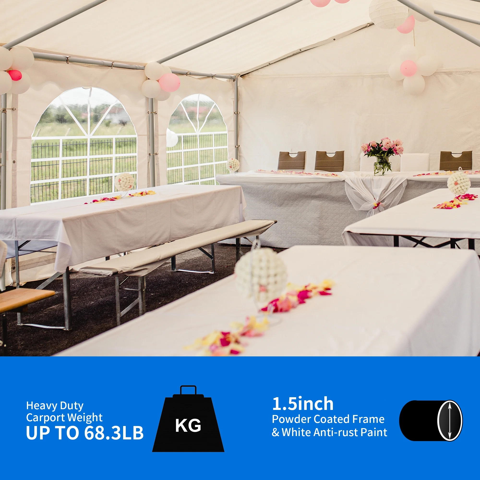 Dextrus 20x40 ft canopy can be assembled to create the perfect outdoor setting for any time of the year. It provides a roomy shaded area during hot summer days while allowing natural light in. Our sturdy, rust-resistant powder-coated steel and durable roof top will stand the test of time.