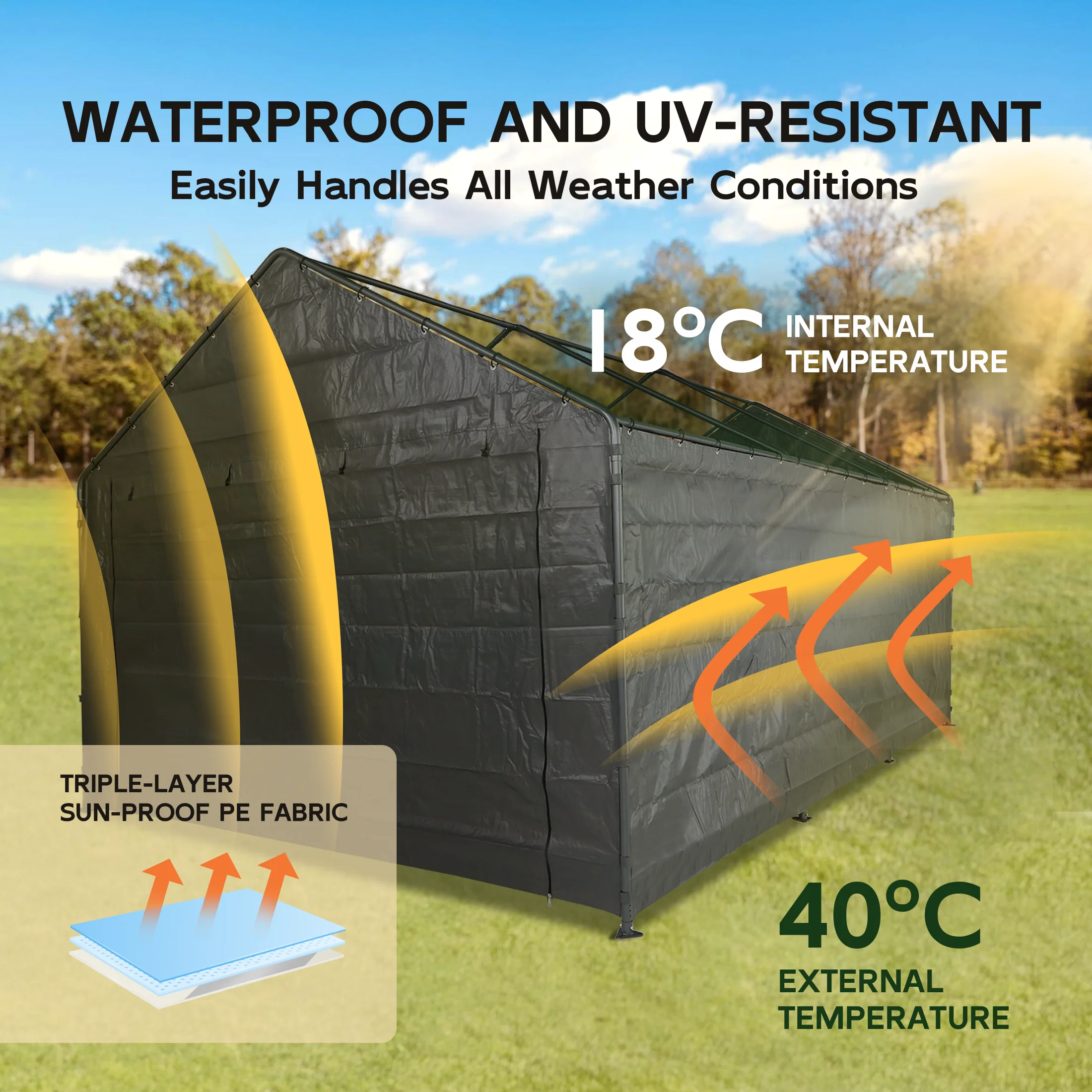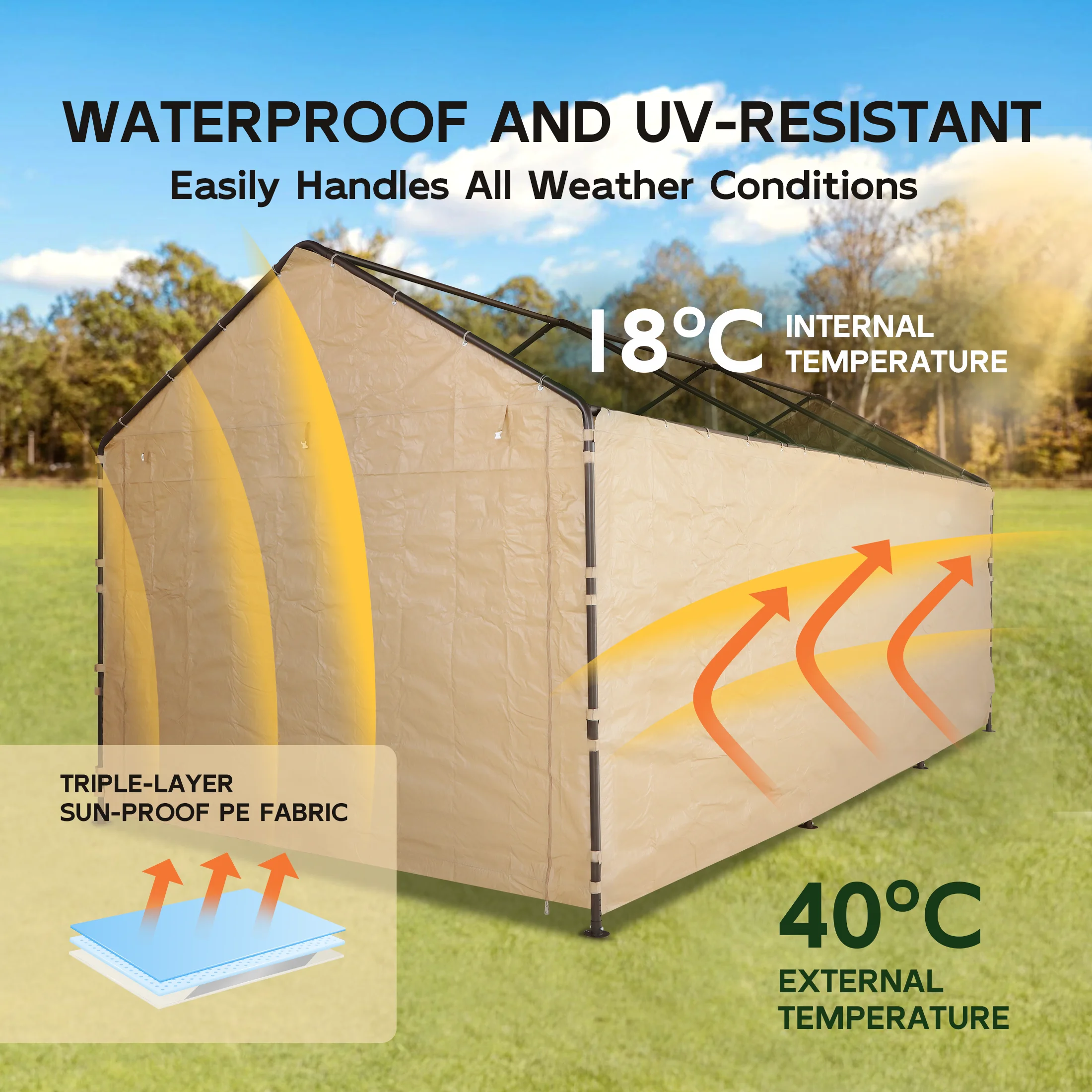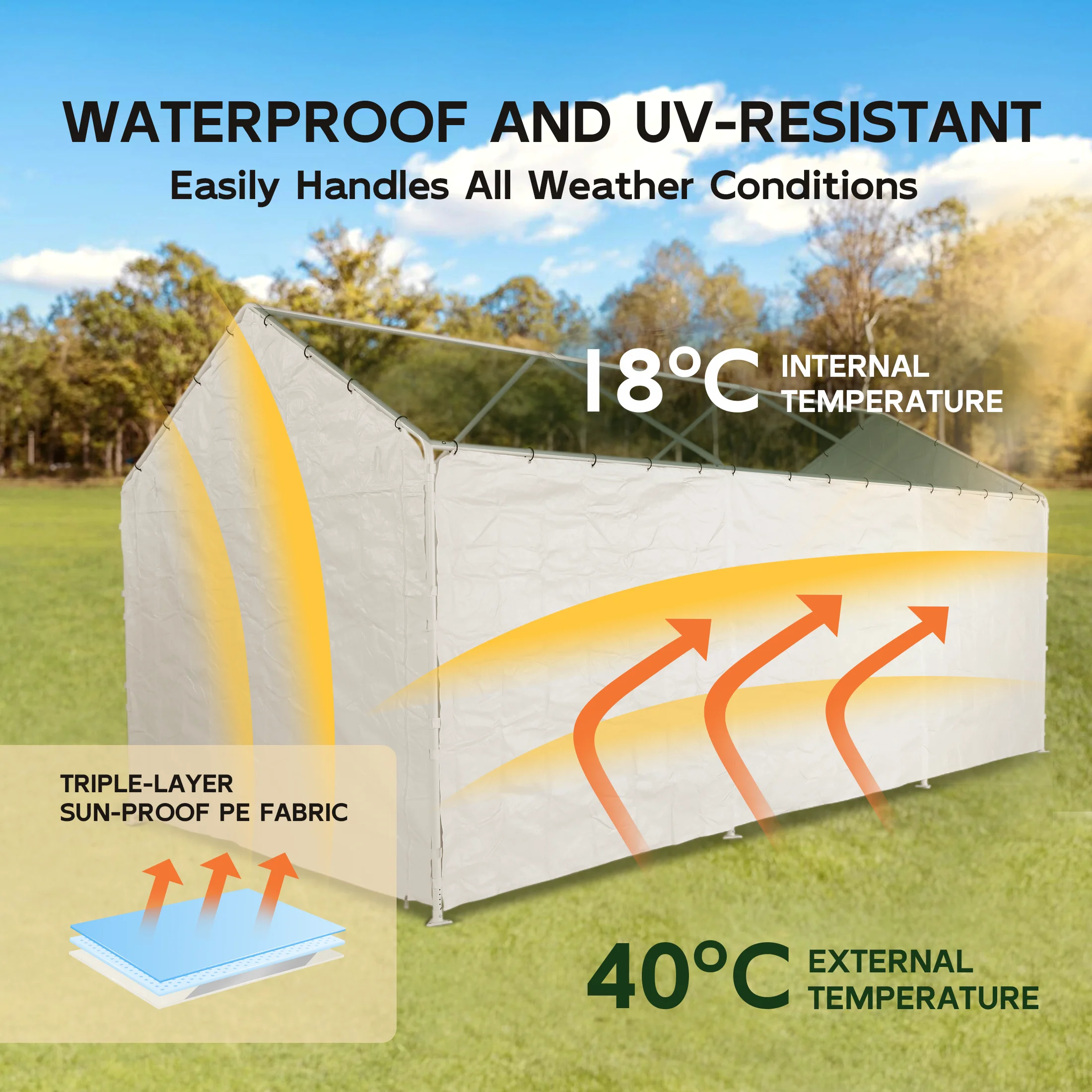 - Triple-layer Sun-proof PE Fabric: Made from 3 layers of heat-sealed PE fabric, our carport replacement canopy cover is resistant to high temperatures, strong wind, and water. It is fade-resistant and doesn't tear easily, enabling the whole carport to accompany you for a long-lasting time. We got you covered. Note: (Frame is not included)
