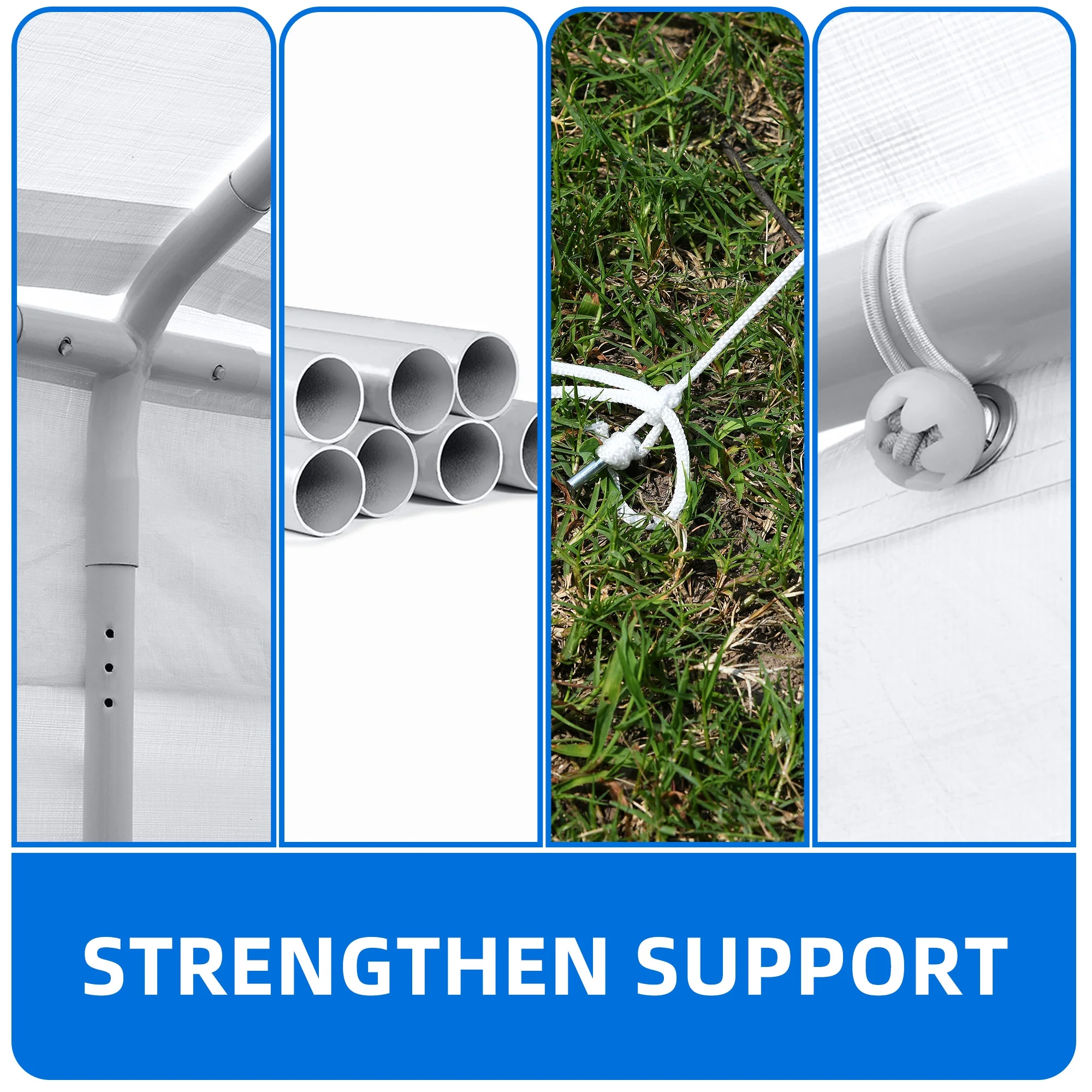 - Safe and Stable: Product features durable steel and aluminum structural frame,The triangular top is reinforced by transverse reinforcement and the leg is reinforced by inclined reinforcement, PE cloth with large PVC windows, solid nylon rope and ground nails. It is completely rainproof, UV-proof, and wind-proof