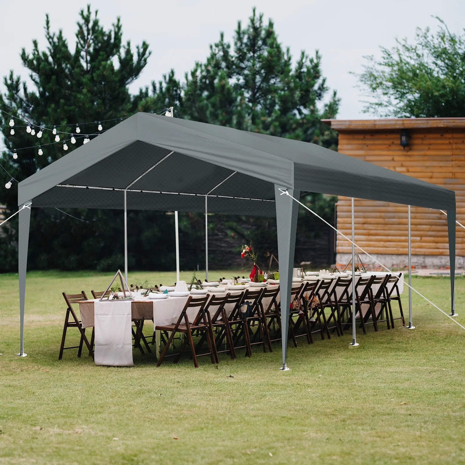 Ktaxon 10x20Ft Carport, a versatile and spacious outdoor solution. Crafted with a galvanized steel frame and 140G PE fabric, this heavy-duty car tent offers 240 sq. ft. of shaded area. Featuring removable sidewalls and a convenient roll-up door, it's perfect for vehicle protection, yard storage, and hosting outdoor events. The canopy effectively shields against sun, rain, dust, and snow, while ventilation windows enhance airflow. Easy to set up with minimal tools, it includes stakes and wind ropes for added stability. Suitable for various uses, this gray canopy with white tubes provides a reliable and functional addition to your garden or patio.
