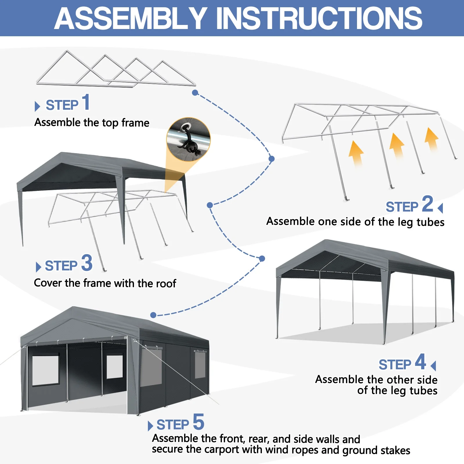 [EASY ASSEMBLY] Coming with clear instructions and requiring minimal tools, this carport canopy can be set up quickly and easily, including stakes and wind ropes for added stability.