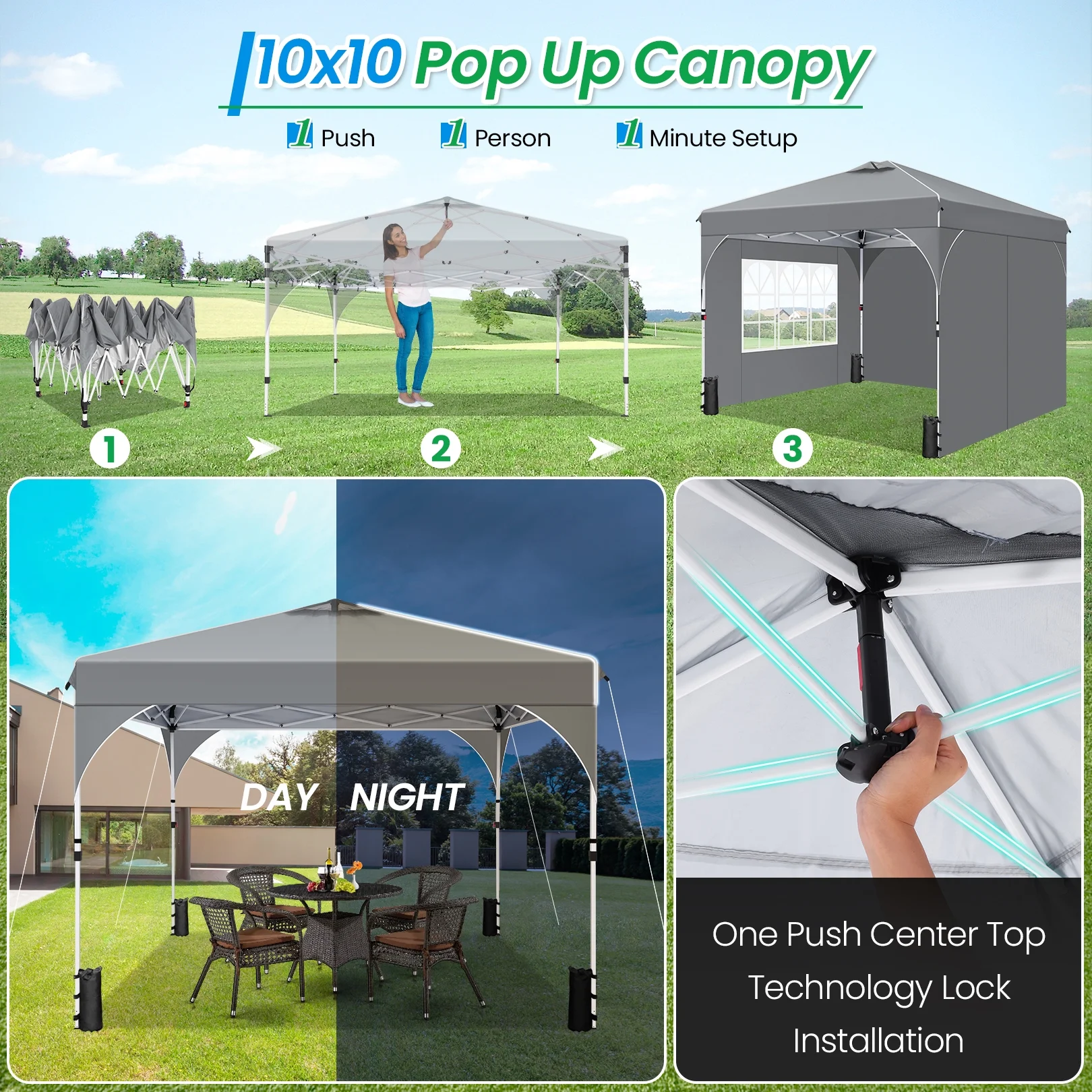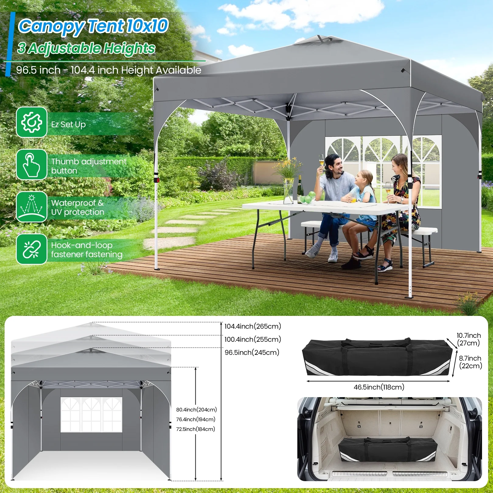 🌈 This 10 x 10 Ft portable canopy tent is constructed with a one-step setup steel tent frame, waterproof canopy top, 4 removable sidewalls with windows and zippers, sandbags, stakes, and tent rope for fastness, which all can be put into a carry bag, easy to carry or be stored in the trunks. This folding party tent features an easy setup, waterproof, windproof, UV-protected, sturdy, and portable. What is more, this patio tent height can be adjusted by three levels from 8.1' to 8.5', and the party canopy is available for more than 15 people with tables and chairs. The outdoor tent can be used as a party tent, wedding tent, market tent, backyard tent, beach tent, etc.