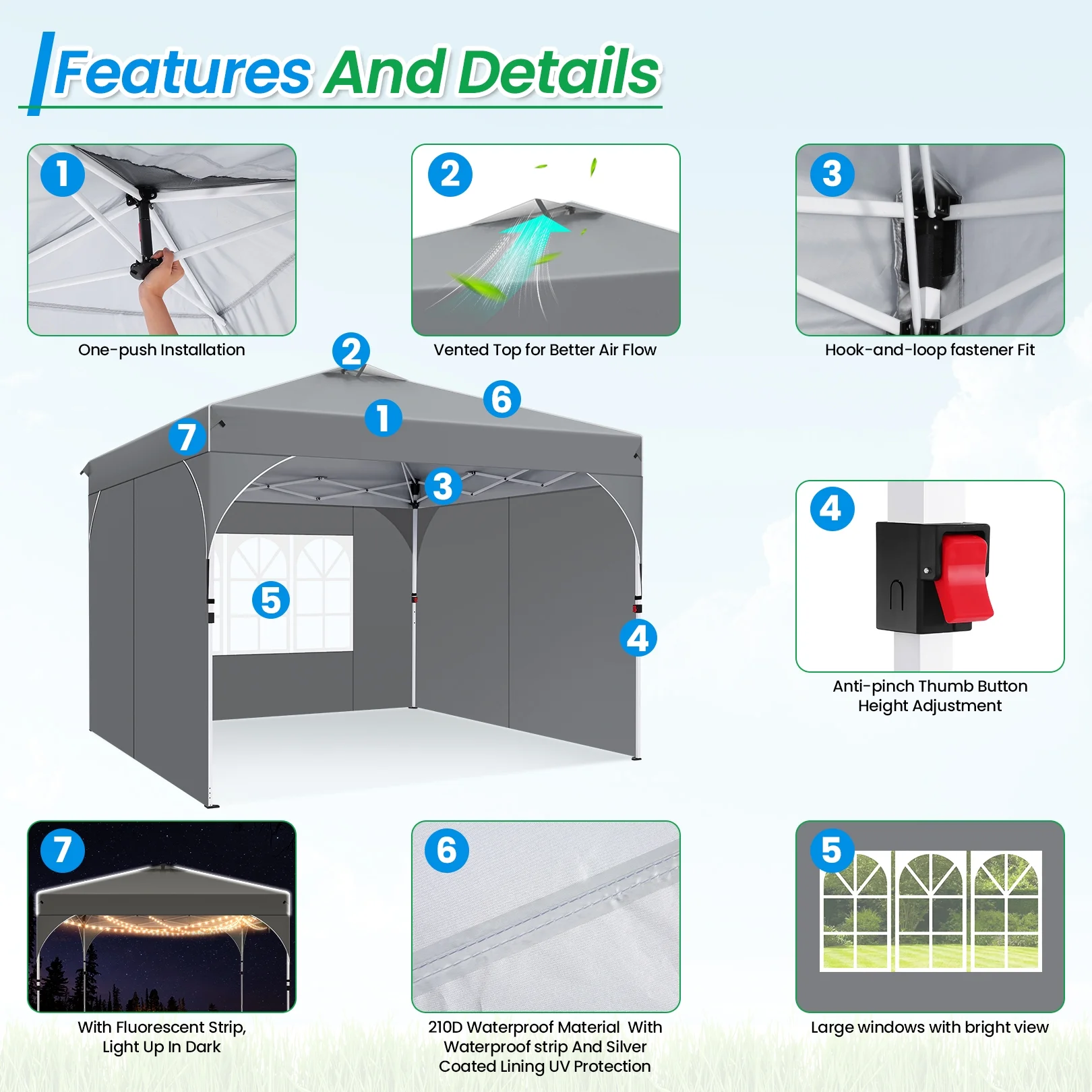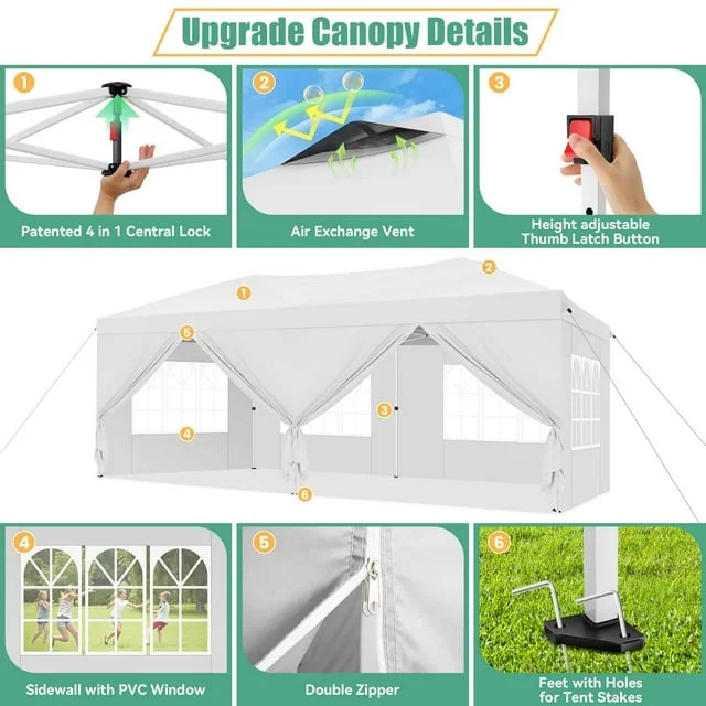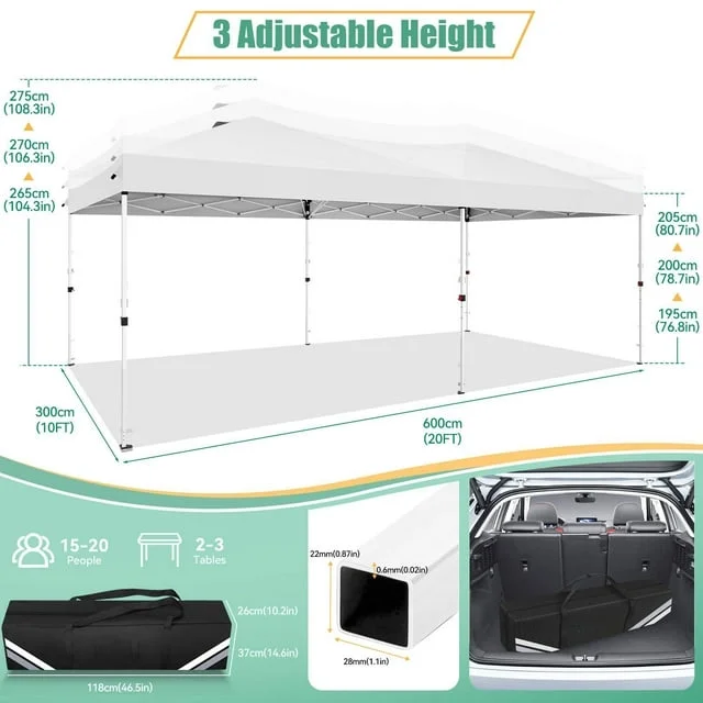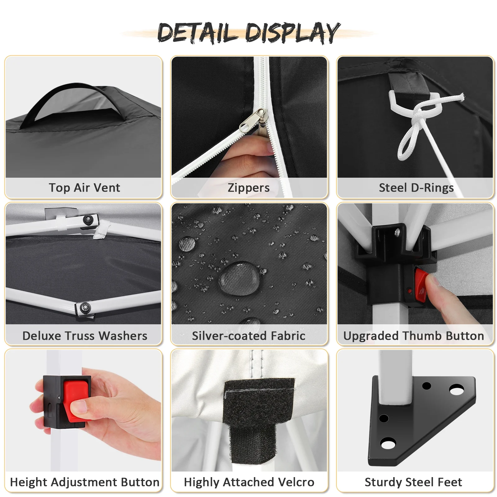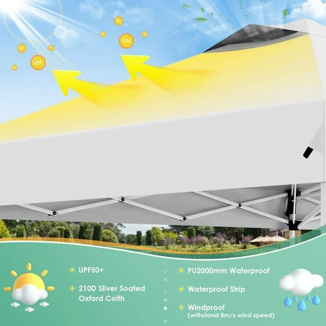 🌞—�?0x10 Ft & 3 Height Adjustable: This outdoor canopy height can be adjusted from 8.1' to 8.5' easily. This party tent can hold about 15 people with a table & chairs.