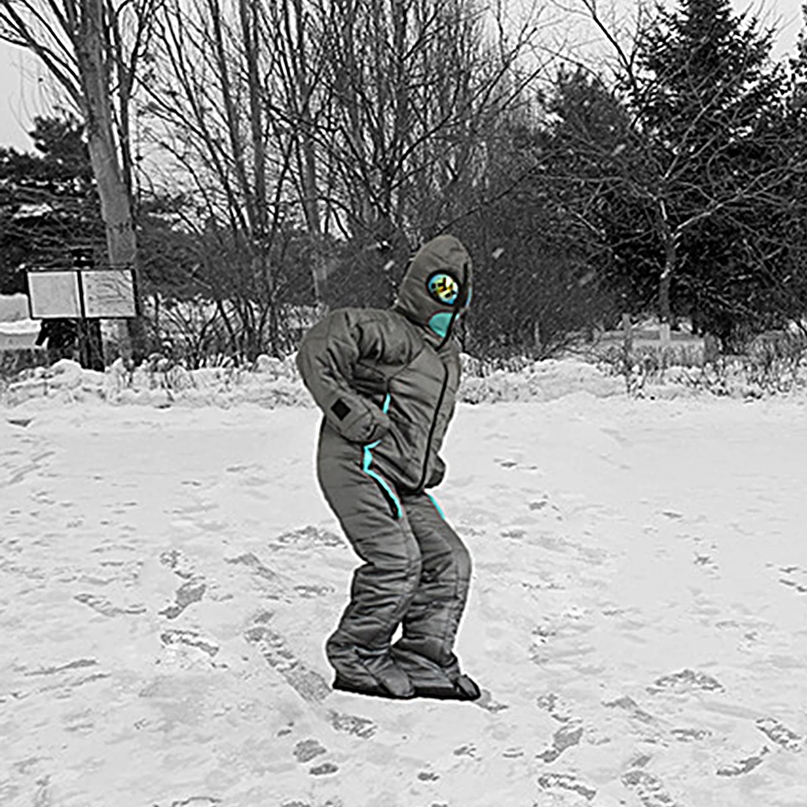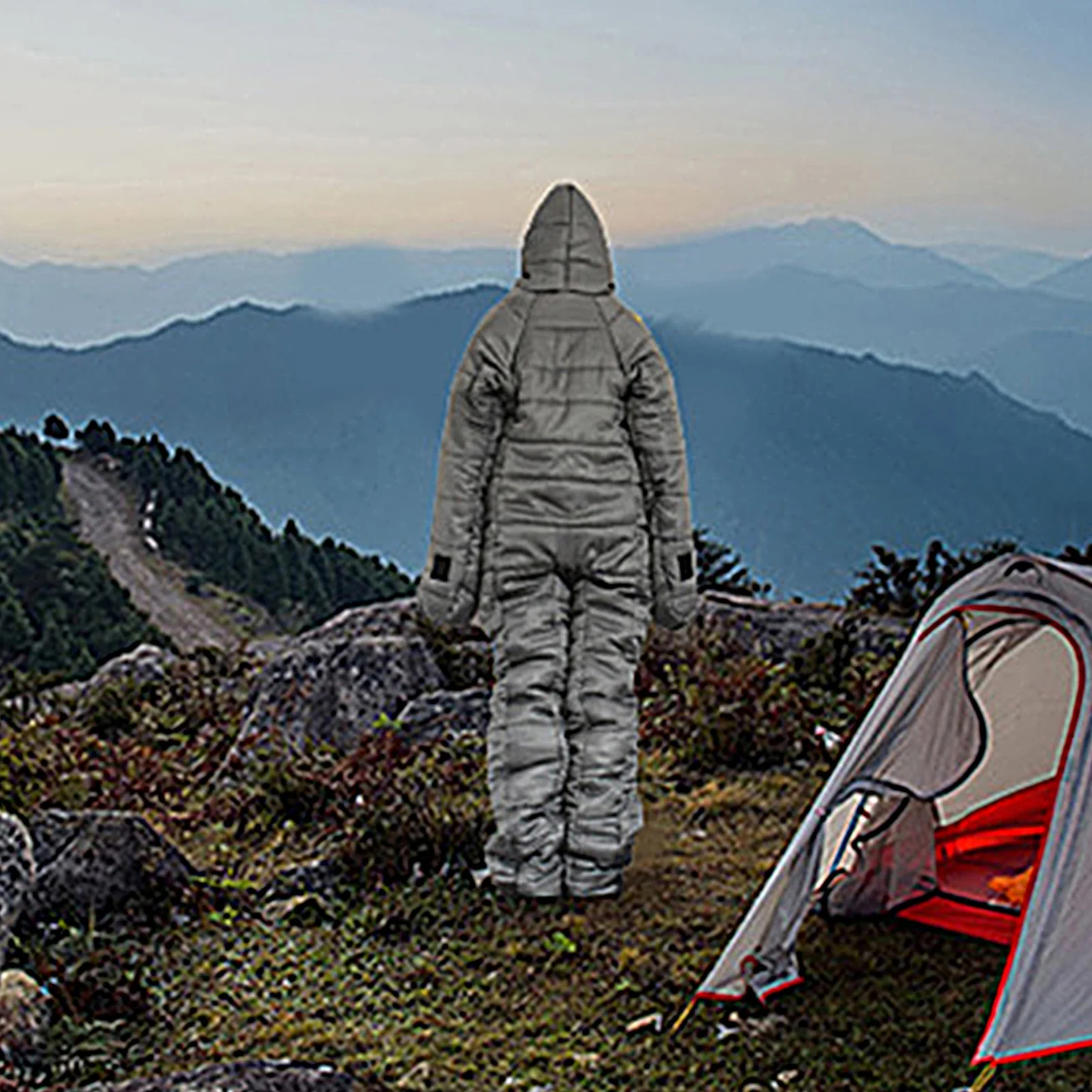 - ?With a wearable design, this sleeping bag has a staggered laminated design for easy access to things, multiple zipper design to make it easy to put on and take off, and a toe opening for easy walking.