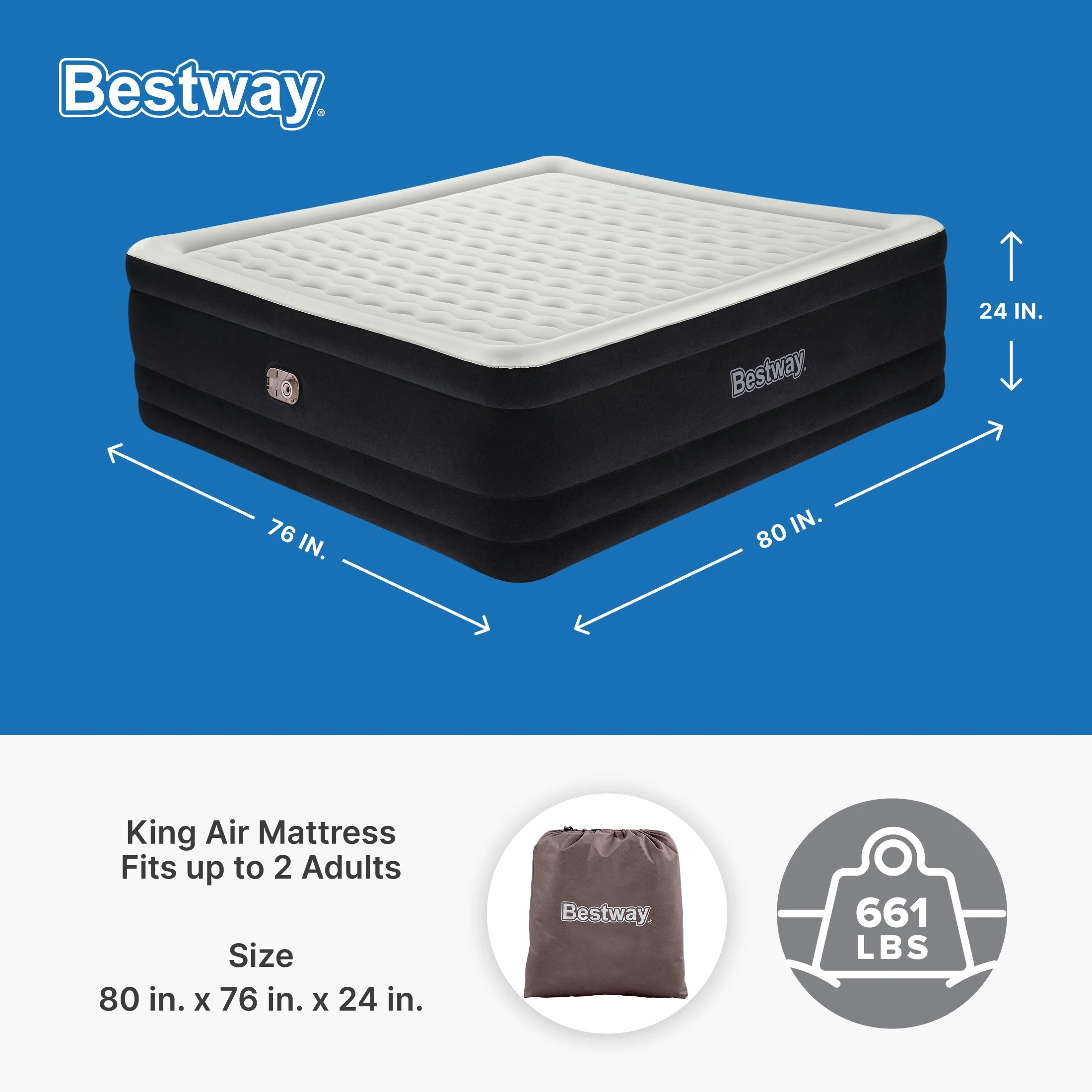 - Contents: 1 Bestway air mattress, 1 storage bag, 1 repair patch