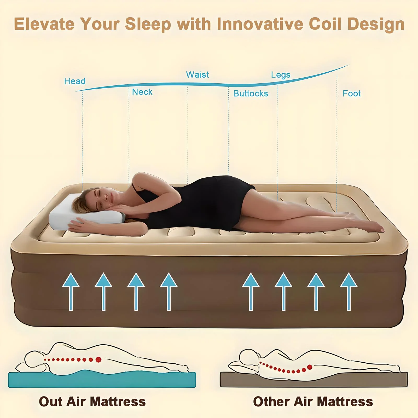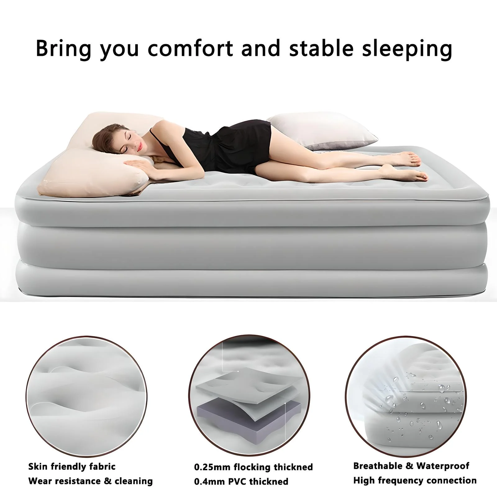 - Luxurious Comfortable & Skin-Friendly:Inflatable mattress has Multi-layer soft top flocking offers a comfortable experience, luxurious flocking fabric is soft, breathable, it's waterproof and easy to clean, perfect for guests and outdoor adventures.