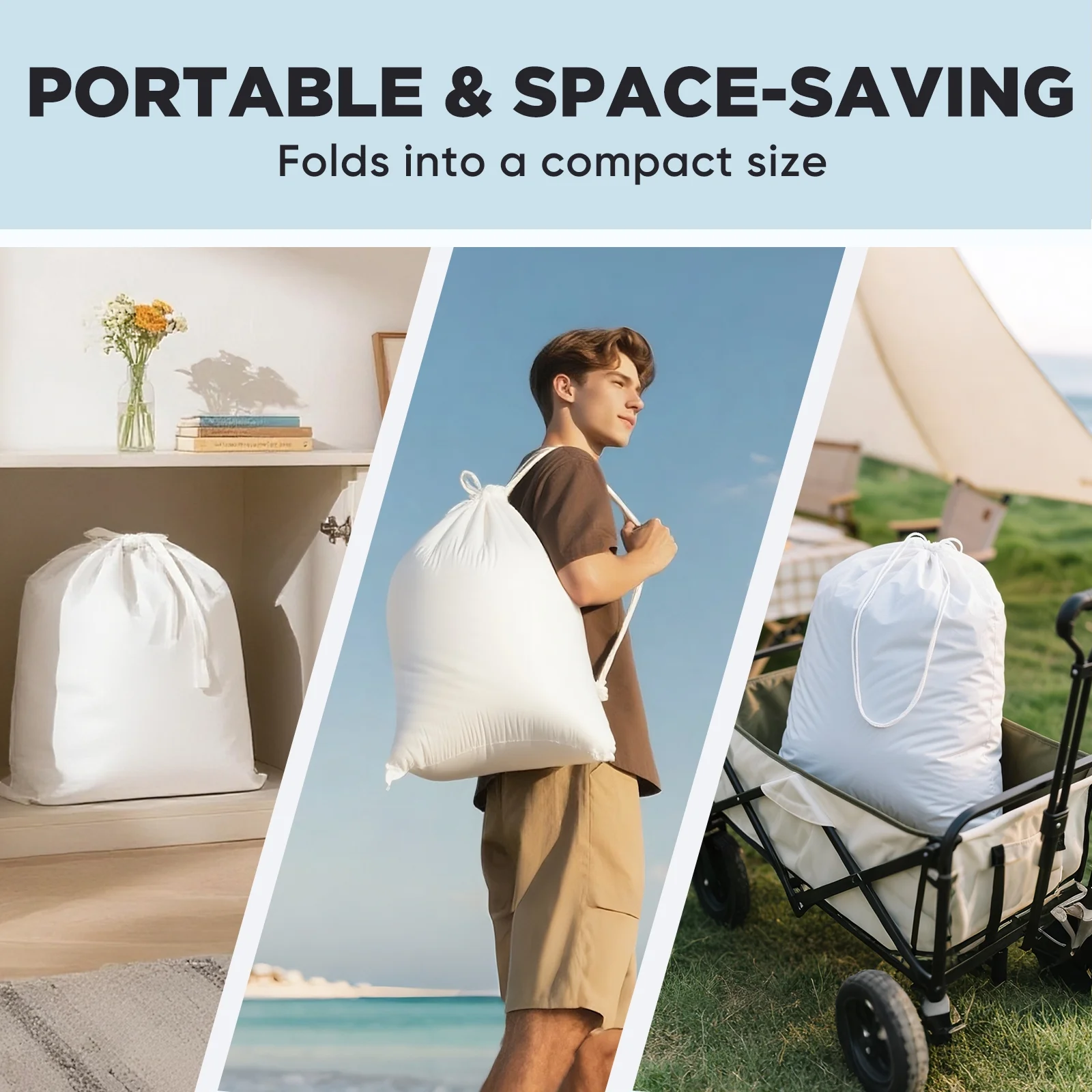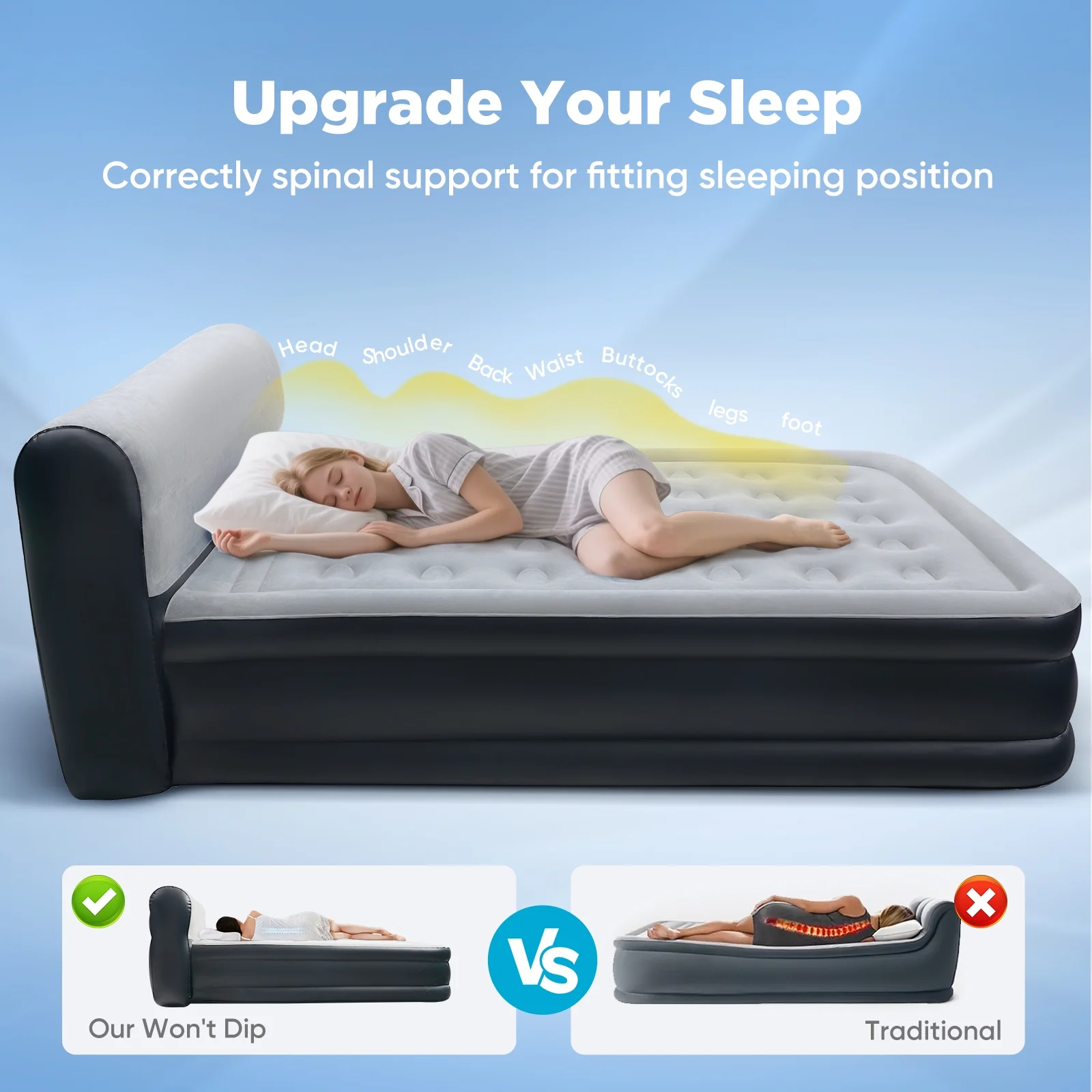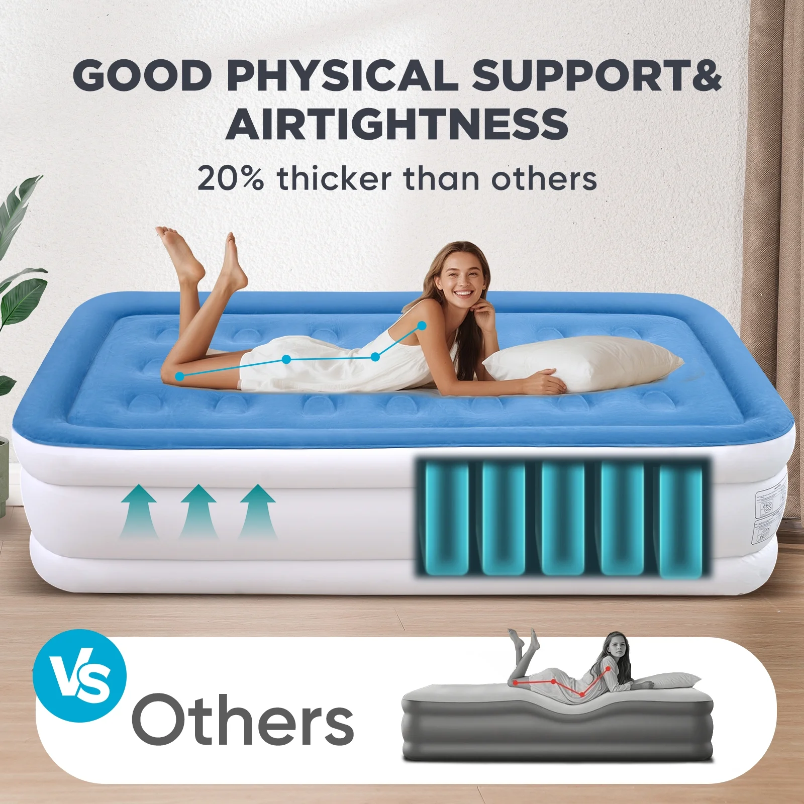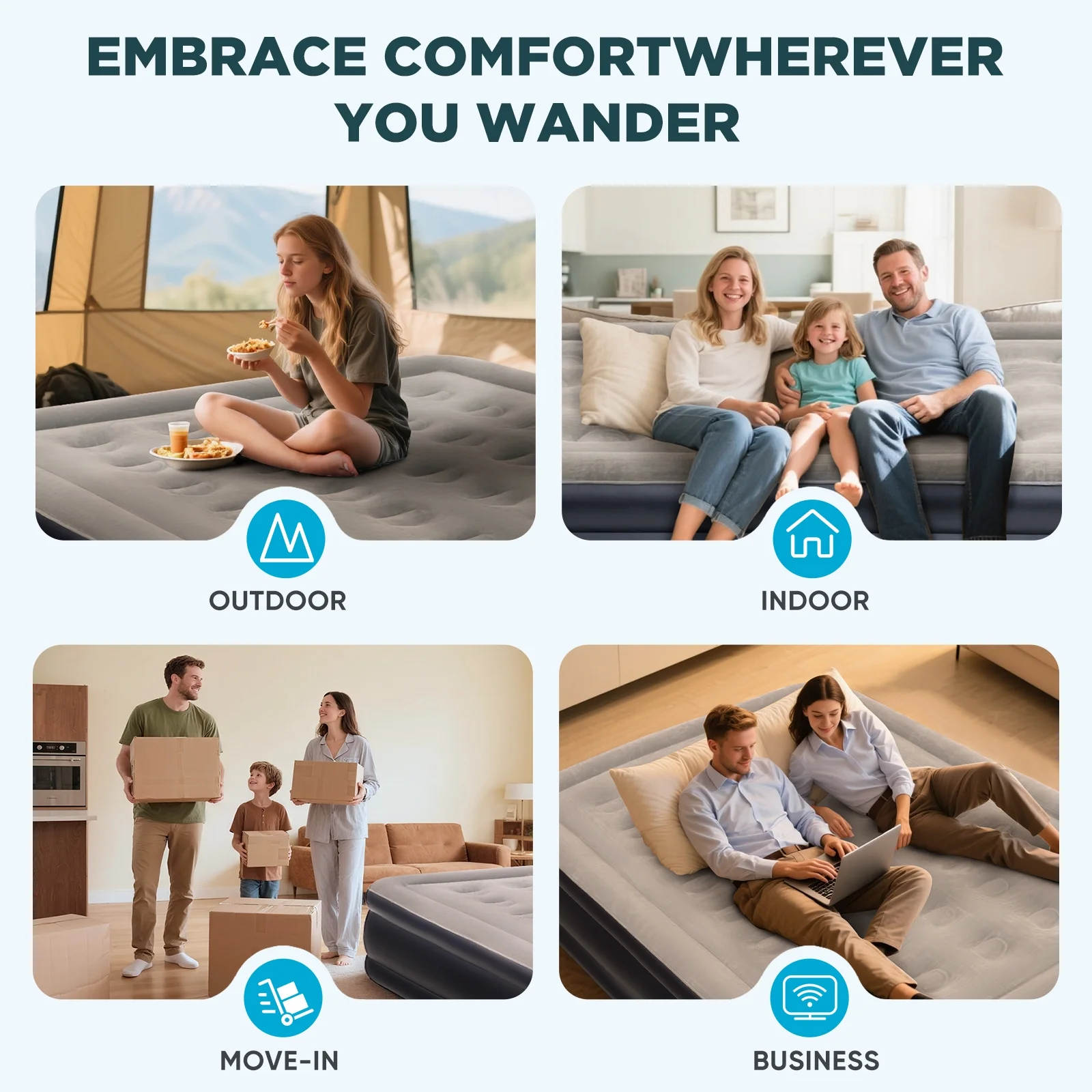 This air bed is equipped with the upgraded dual chamber design providing faster and easier inflation and deflation. In 3 minutes inflated with just the turn of the button and remain for days. No worries about repeated inflation. The thick, multi-layer PVC material of the inflatable mattress features puncture-resistant and waterproof, ensuring a durable and long-lasting mattress. The 35 internal air coils provide exceptional support and keep the blow up mattress firm and flat. With a capacity of 700 lbs, this king air mattress can accommodate 2 or 3 people comfortably. The folded air bed is easy to store and, you can take it everywhere with a storage bag. Perfect for family outings, camping trips, guest beds, and more!