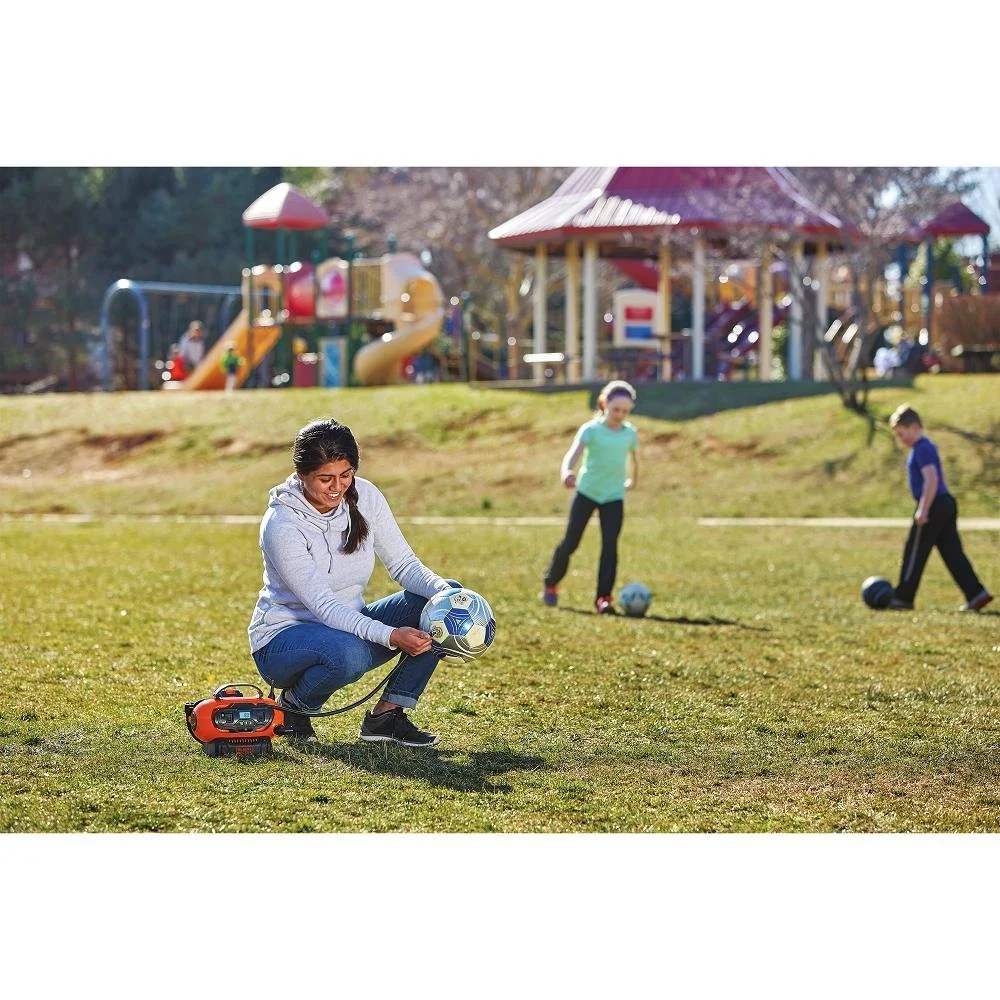 The BLACK+DECKER BDINF20C 20V MAX Lithium-Ion Multi-Purpose Inflator handle inflation needs anywhere. The three power sources allow for inflation inside the home, on the road, or in the backyard. (12V DC, 120V AC & 20V MAX Battery options) Its high-volume output quickly fills larger inflatables like rafts and air mattresses. Plus, the deflate function rapidly empties the air for quick clean up. The high-pressure output inflates tires and sport balls. Complete with a digital pressure gauge and automatic shutoff technology, this inflator brings set-it and forget-it peace of mind. Does not include Lithium-Ion Battery (Sold Separately). Backed by a 2 Year Limited Warranty.