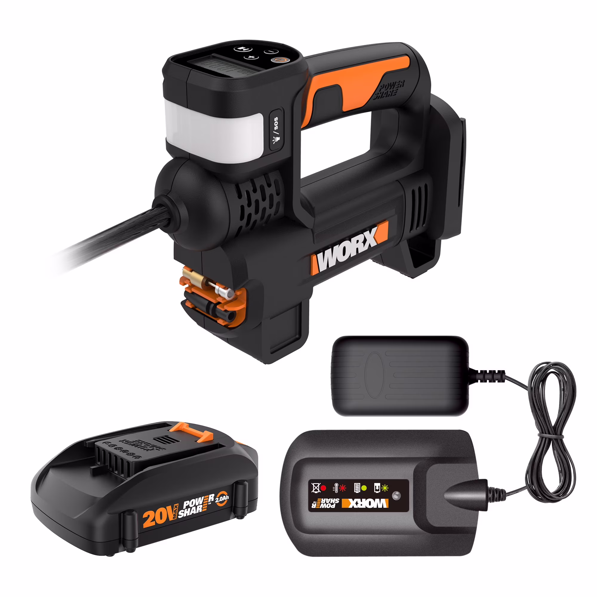 - INCLUDES - (1) sports ball needle, (1) Presta valve adaptor, (1) tapered adaptor, high-pressure hose, (1) 2.0Ah 20V battery, (1) 0.4A charger