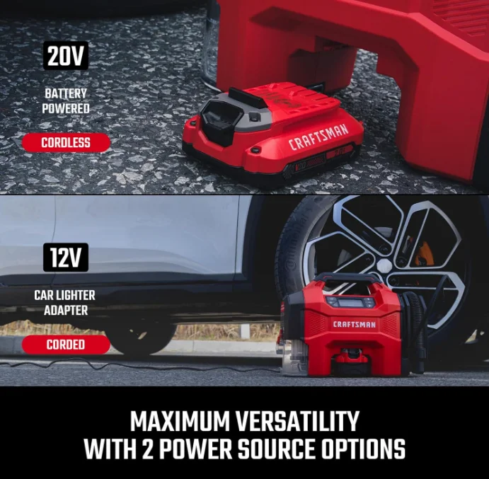 - Dual Power Options: Use 20V cordless battery (sold separately) or 12V car adapter with 14ft cable