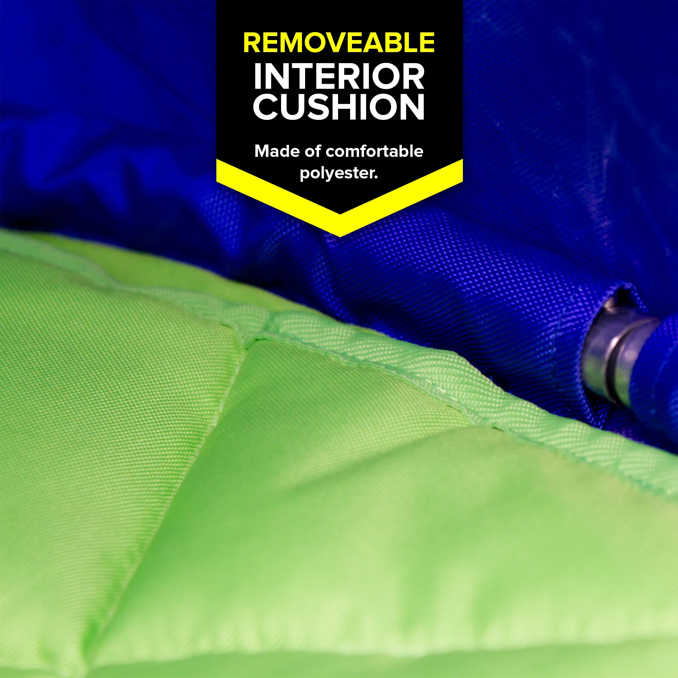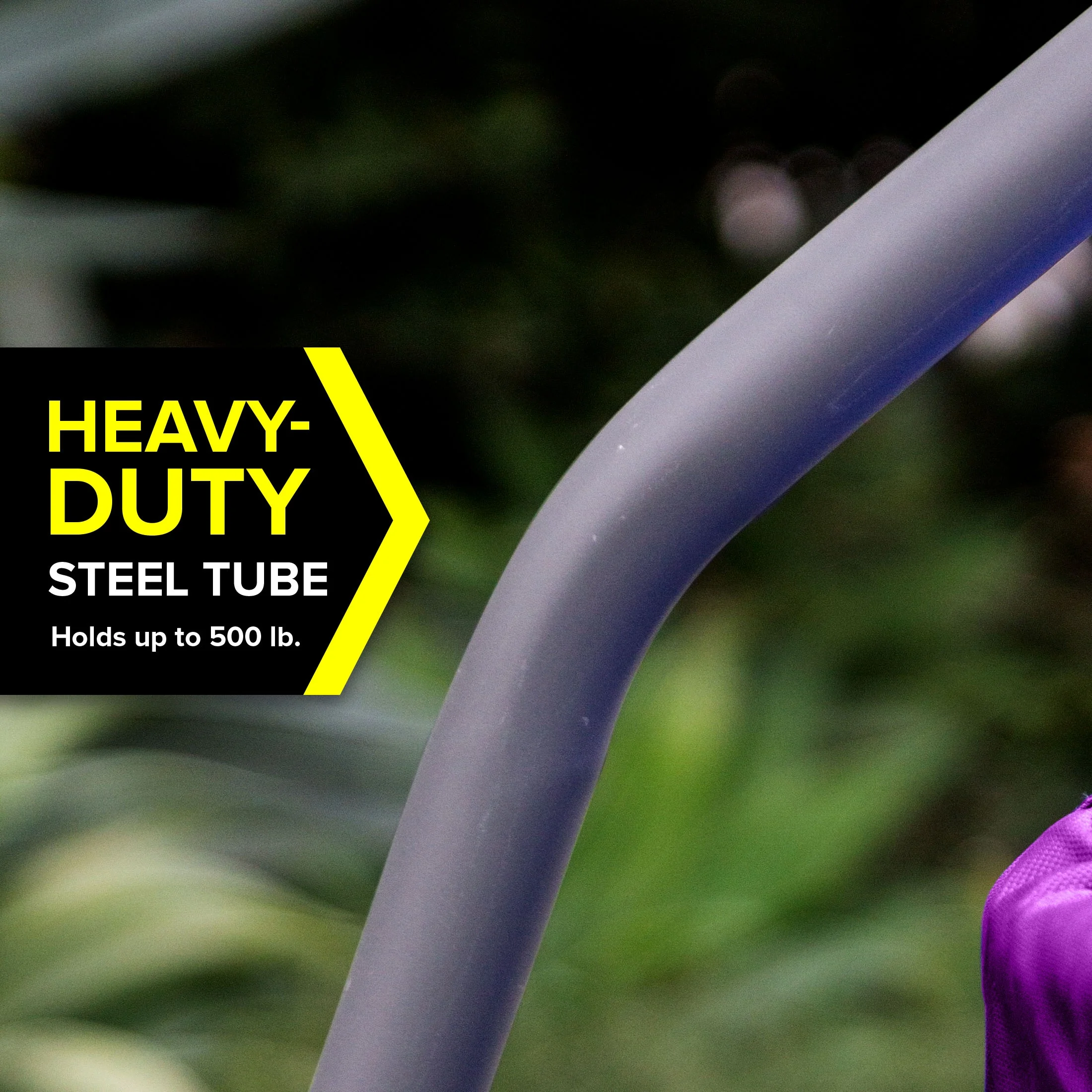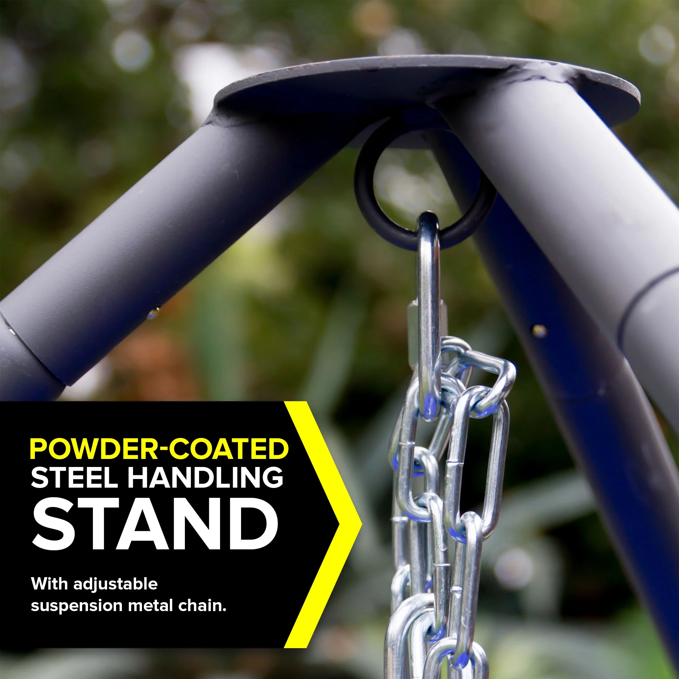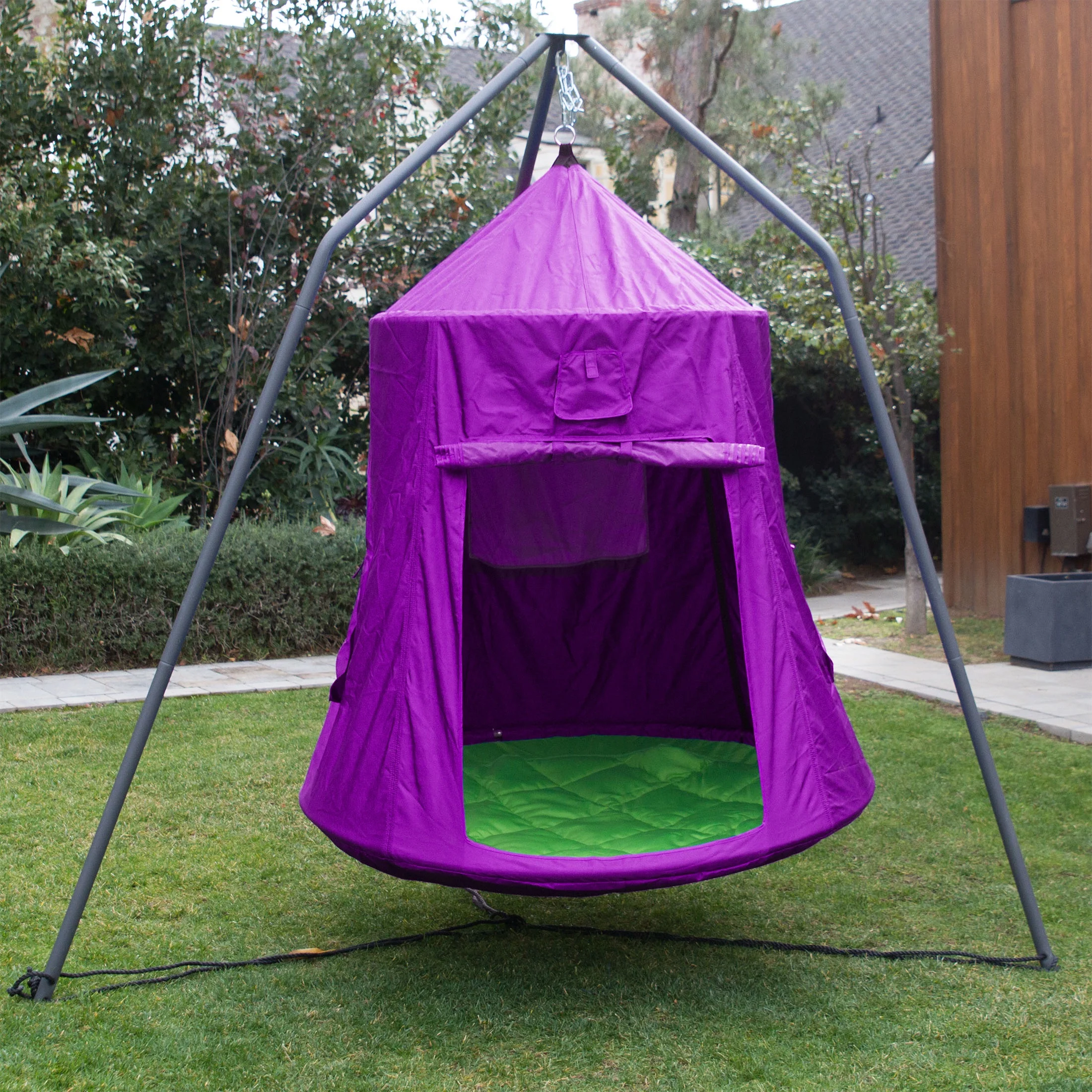 - Includes soft polyester cushion seat and galvanized steel hanging stand