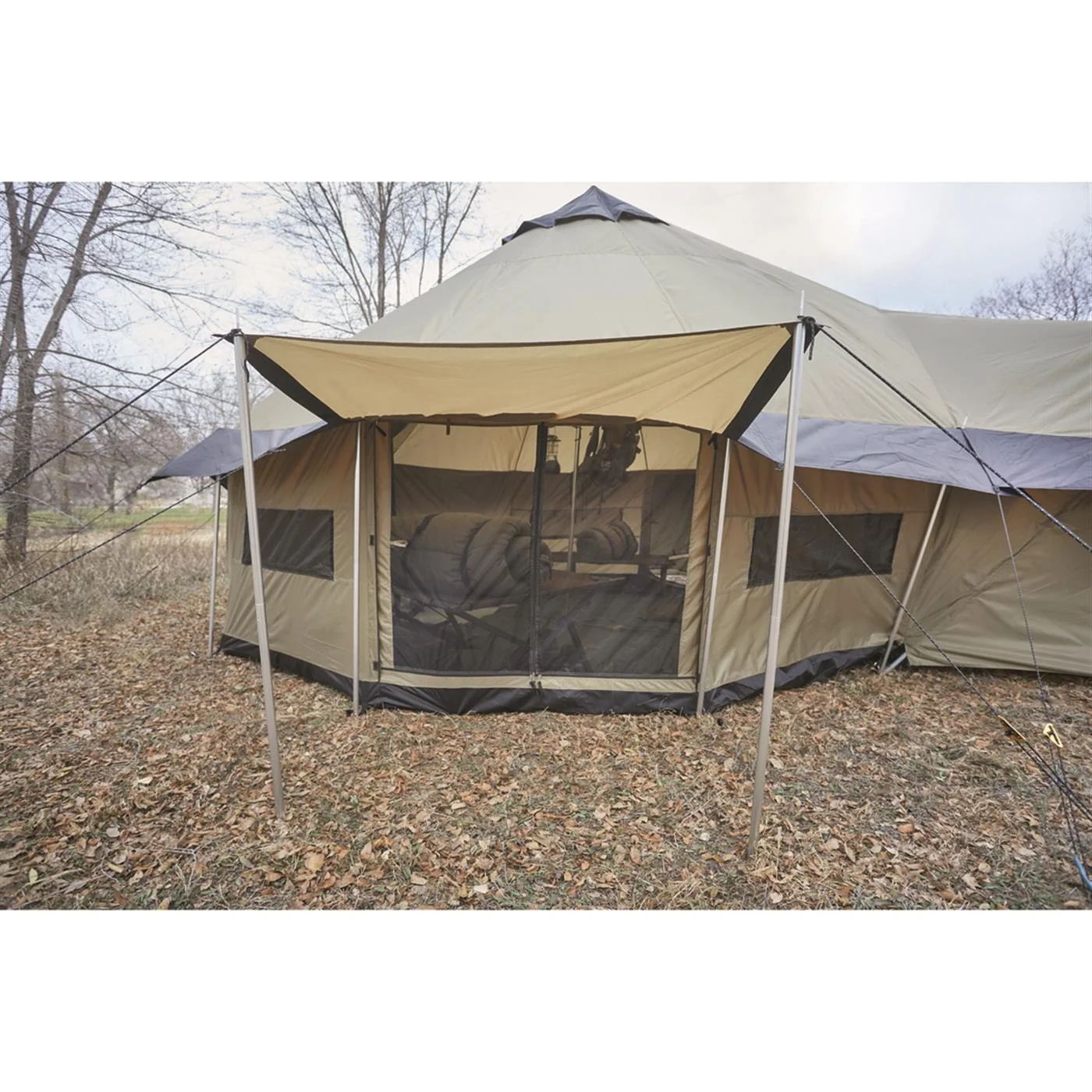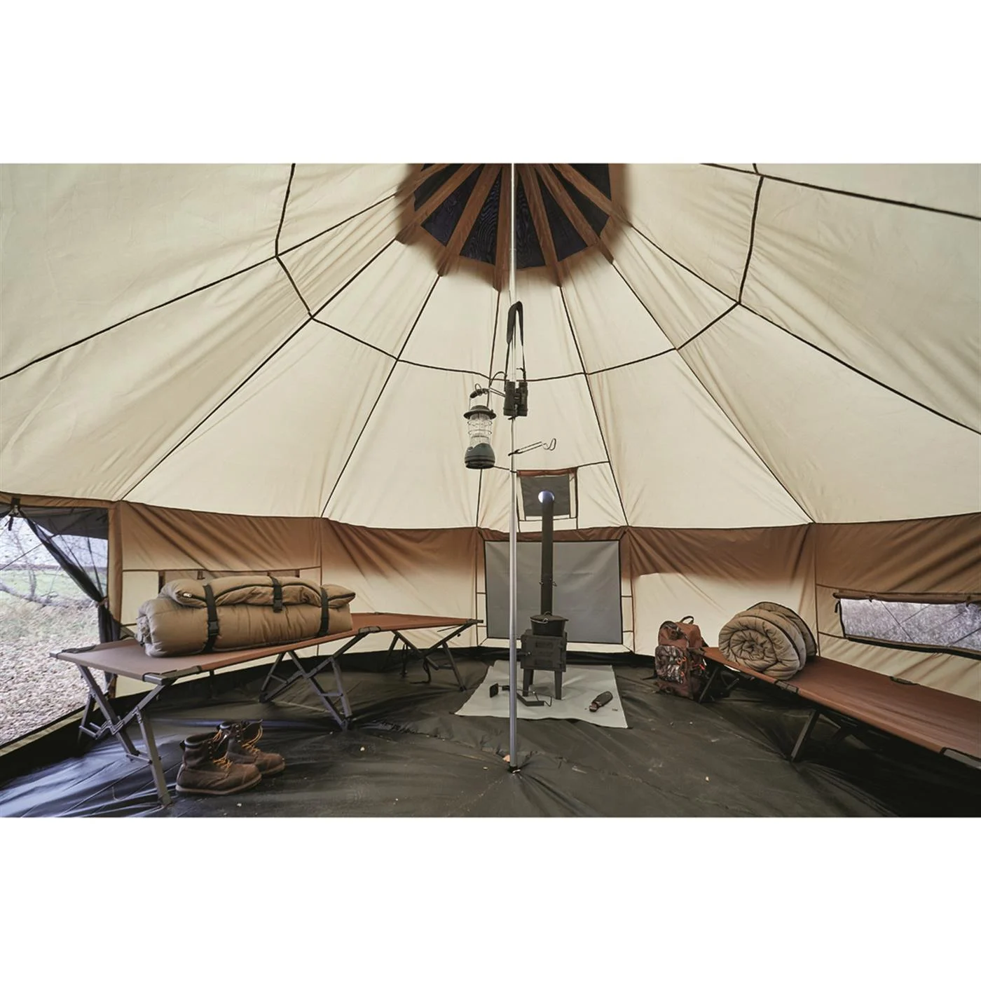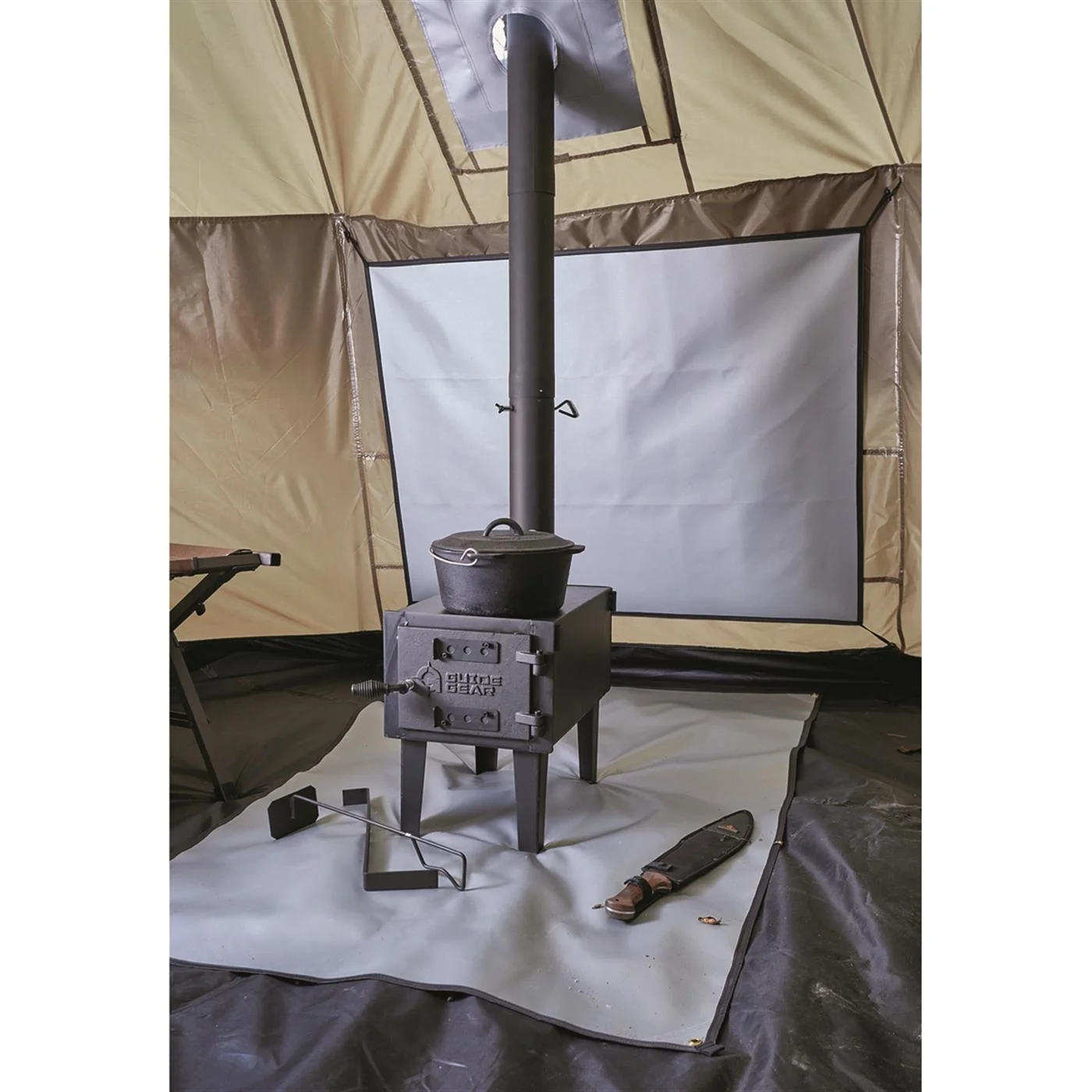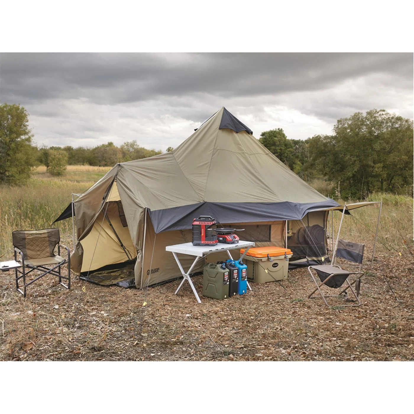 The Guide Gear Base Camp Tent is spacious and is large enough to host your hunting crew and all your camping essentials. There��s 2 side awnings for extra space to store your boots and other equipment. The Base Camp tent has everything you need to effectively use your tent stove, with a 46x35" heat shield, and stove jack opening. 5 windows provide ventilation and allow light into the tent so you can enjoy the view of the landscape. There��s even a lantern hook in the center for easy visibility at night.