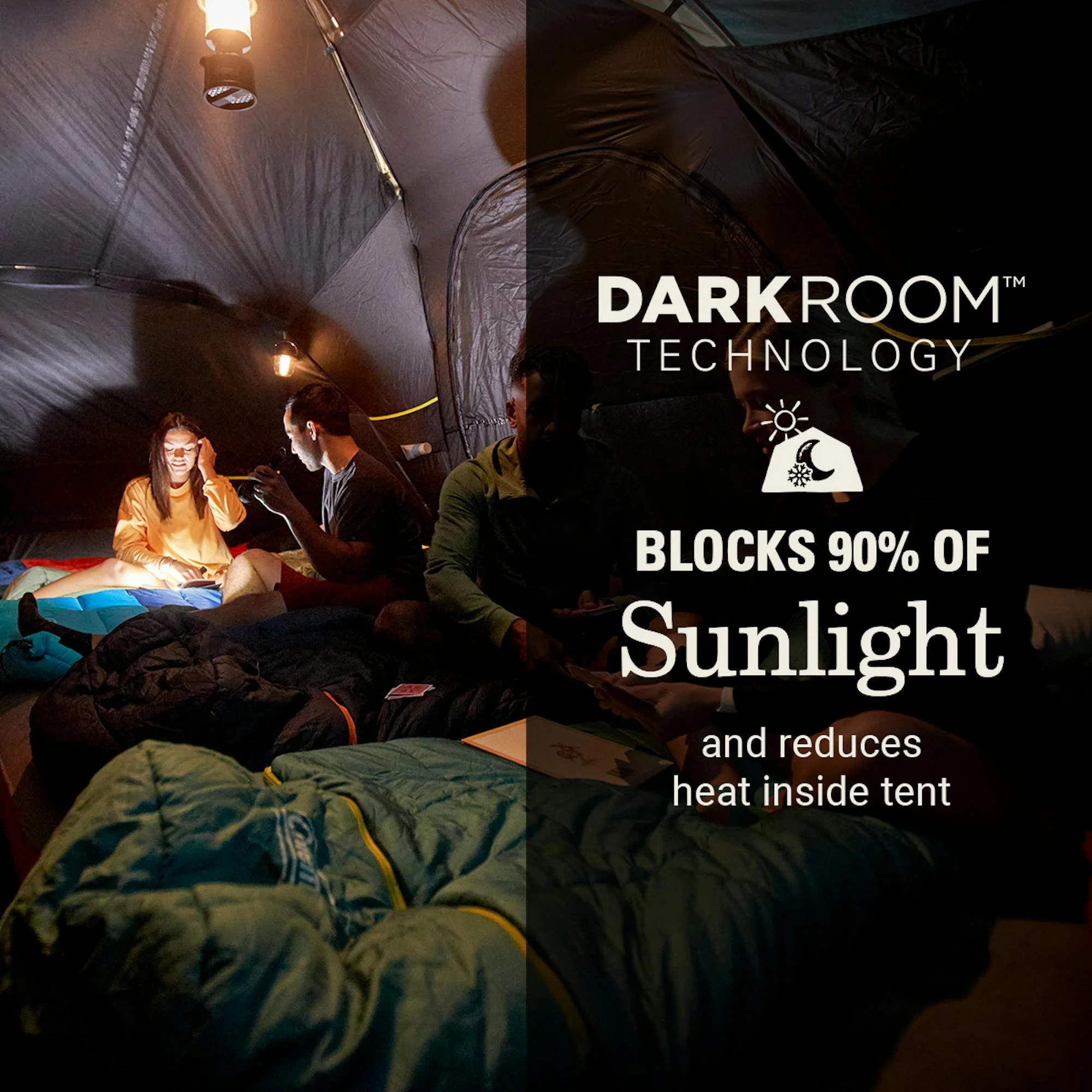 - DARK ROOM? TECHNOLOGY: Blocks 90% of sunlight so you can sleep in; reduces heat inside tent for additional comfort