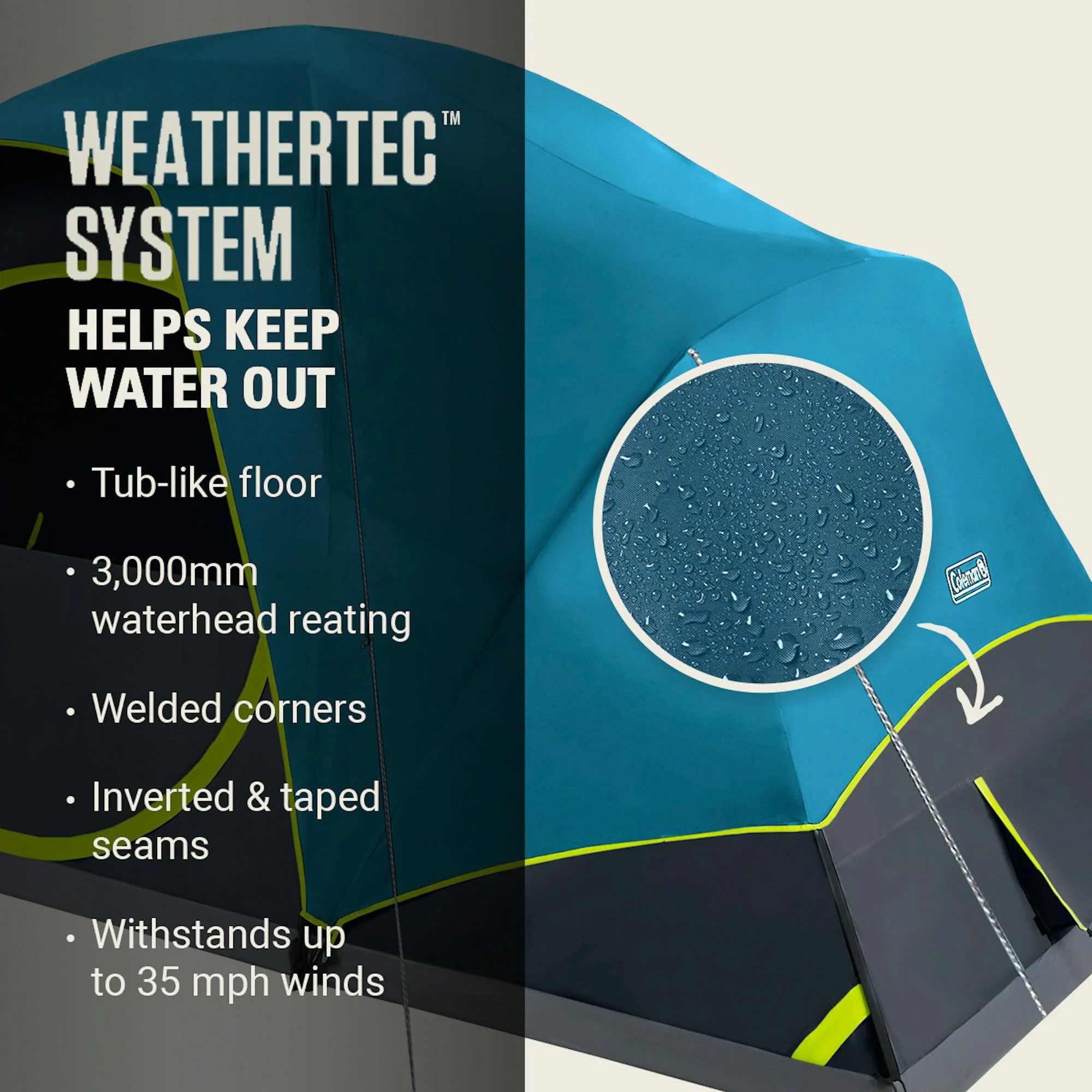 - BLOCKS WIND AND RAIN: WeatherTec? system's tub-like floor, welded corners, waterproof 3,000mm waterhead fabric, and inverted seams and taped seams on rainfly and tent body help keep water from getting in; strong frame has been tested to withstand up to 35 mph winds