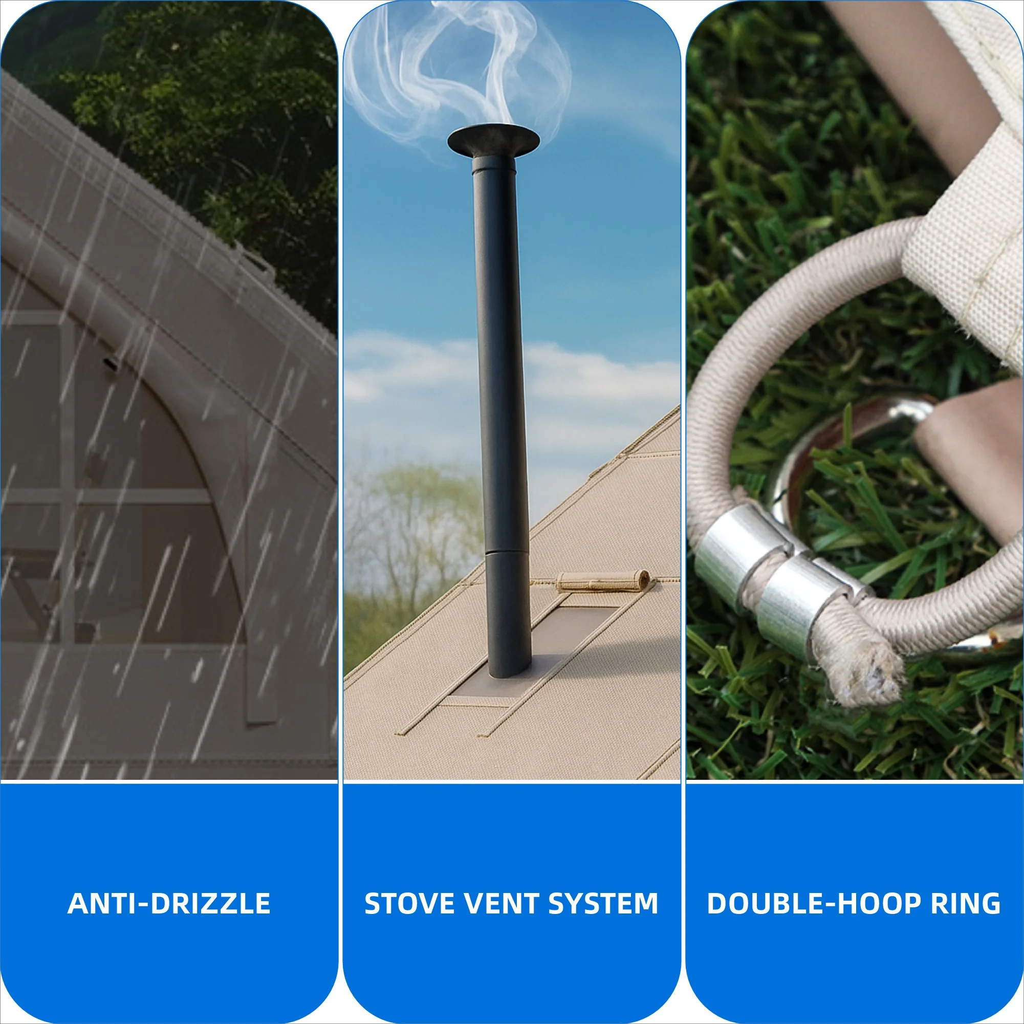 - Waterproof & windproof: Crafted with 400D Oxford cloth, our glamping tent provides a breathable interior with a PU5000 rainproof rating for effective protection against water infiltration. Enjoy a perfect balance of breathability and waterproofing.
