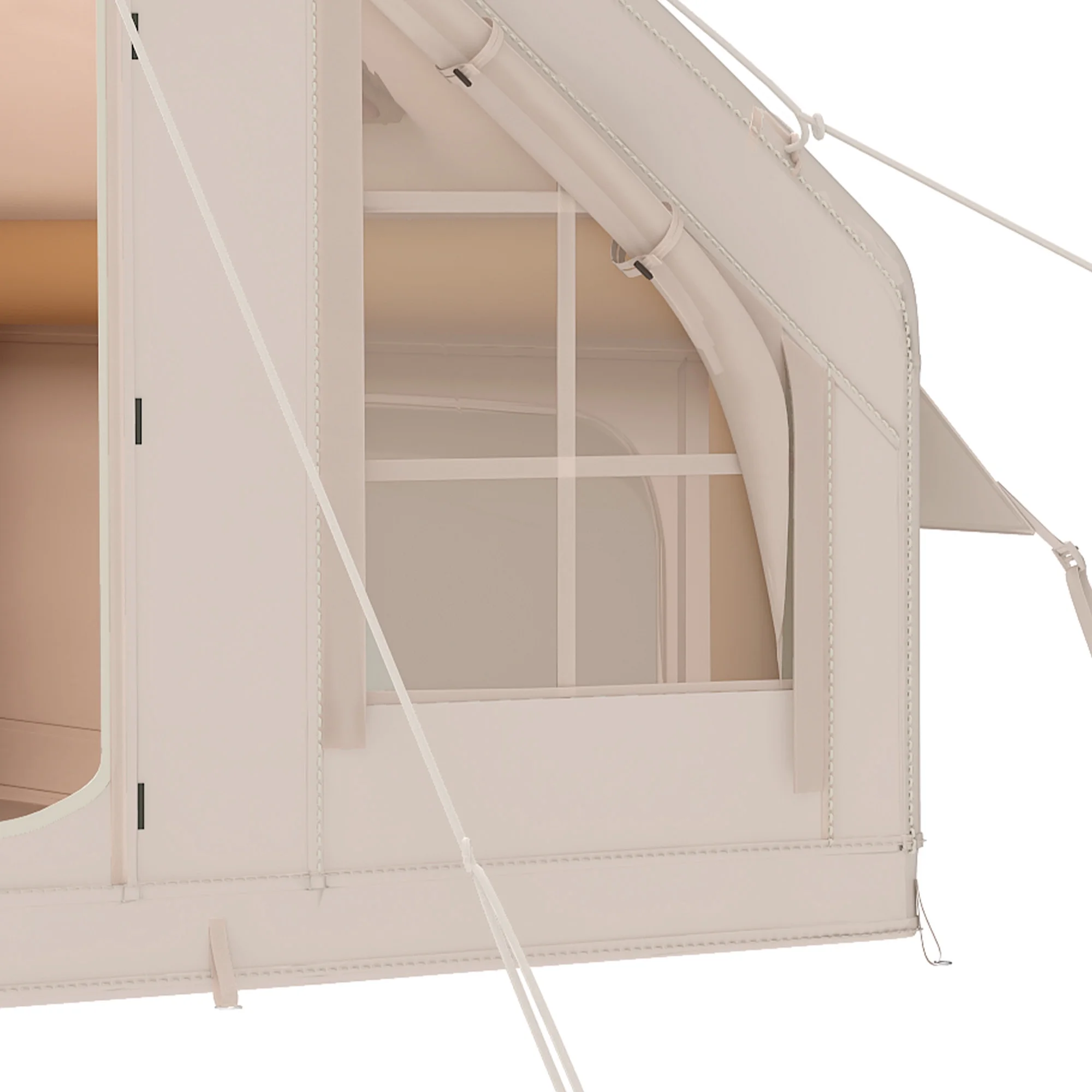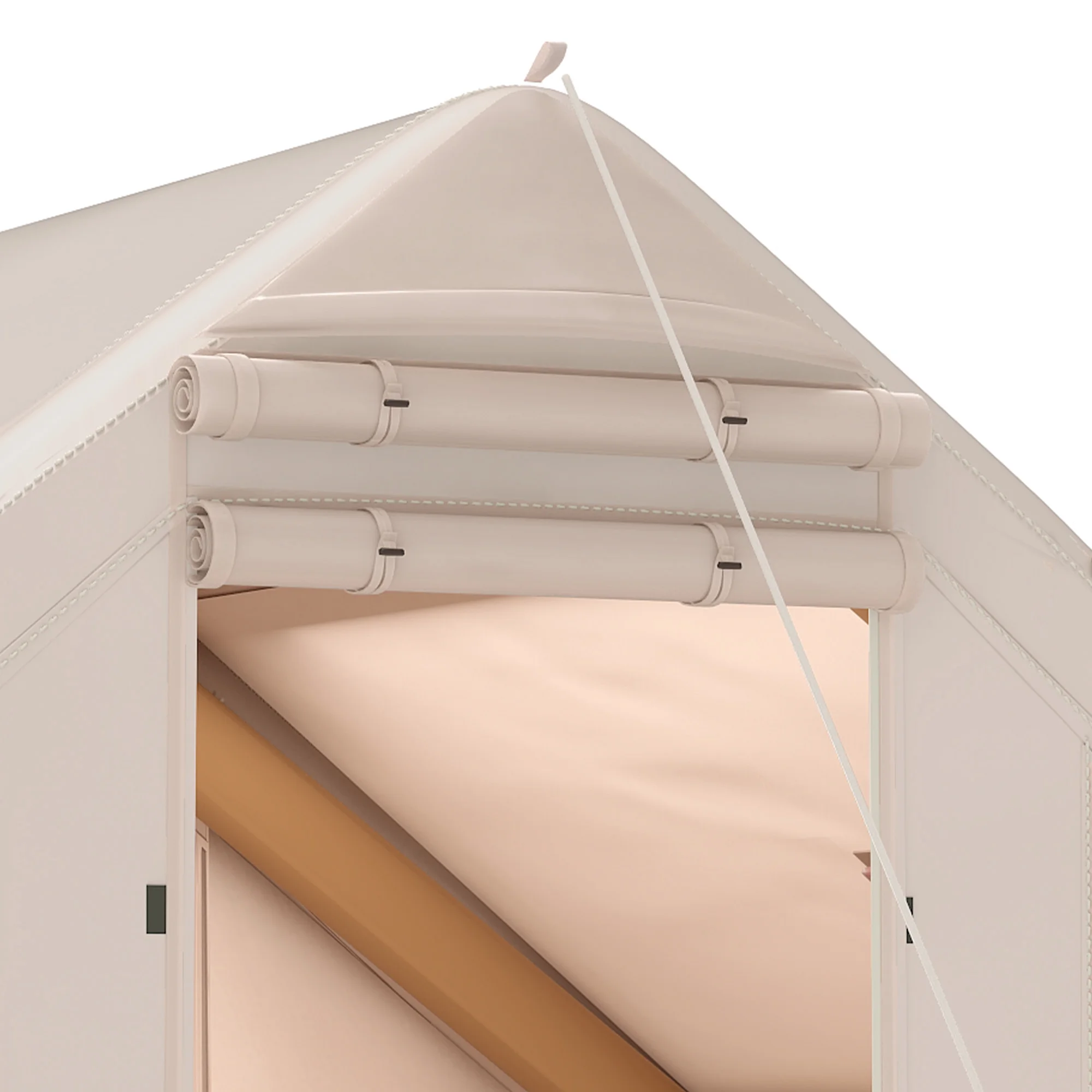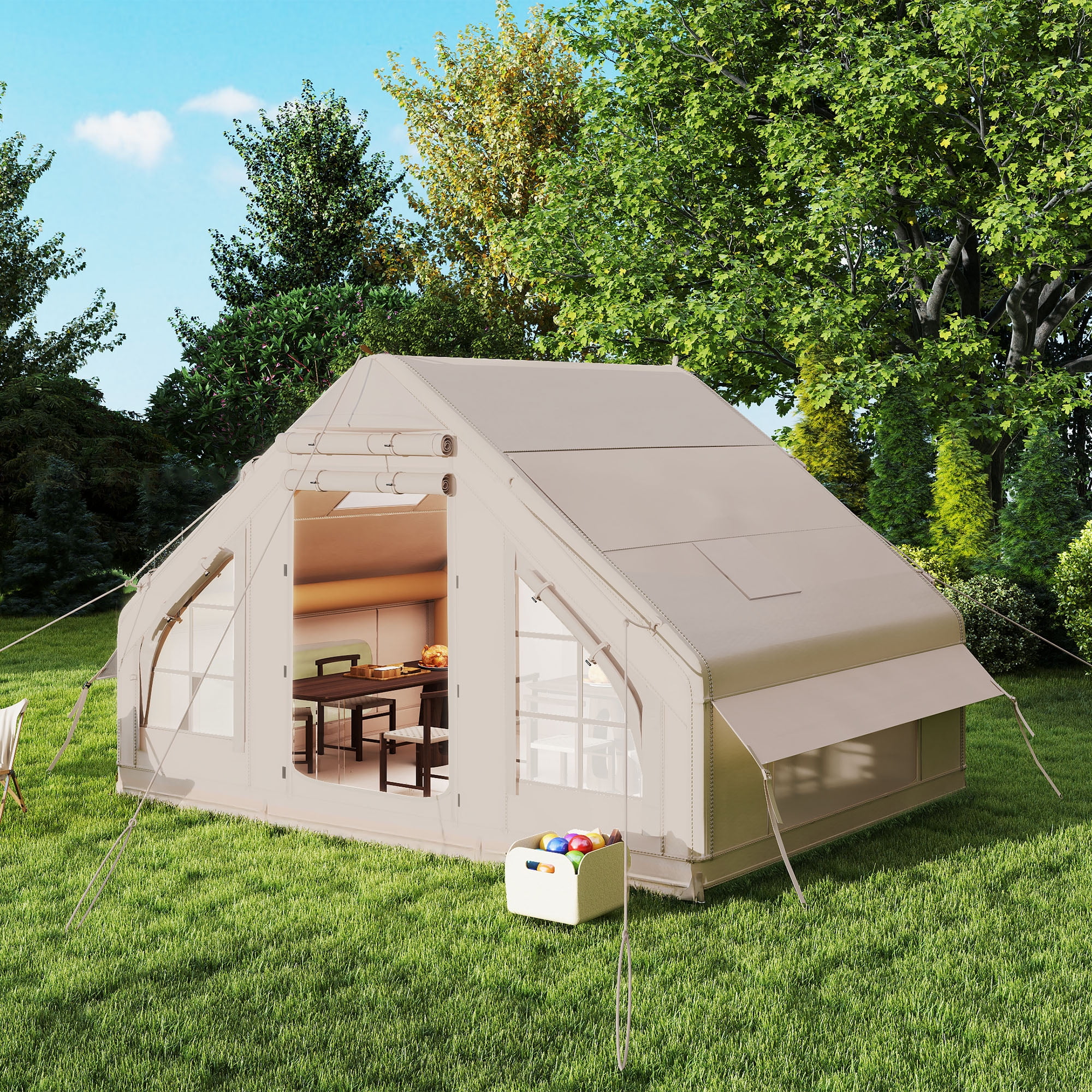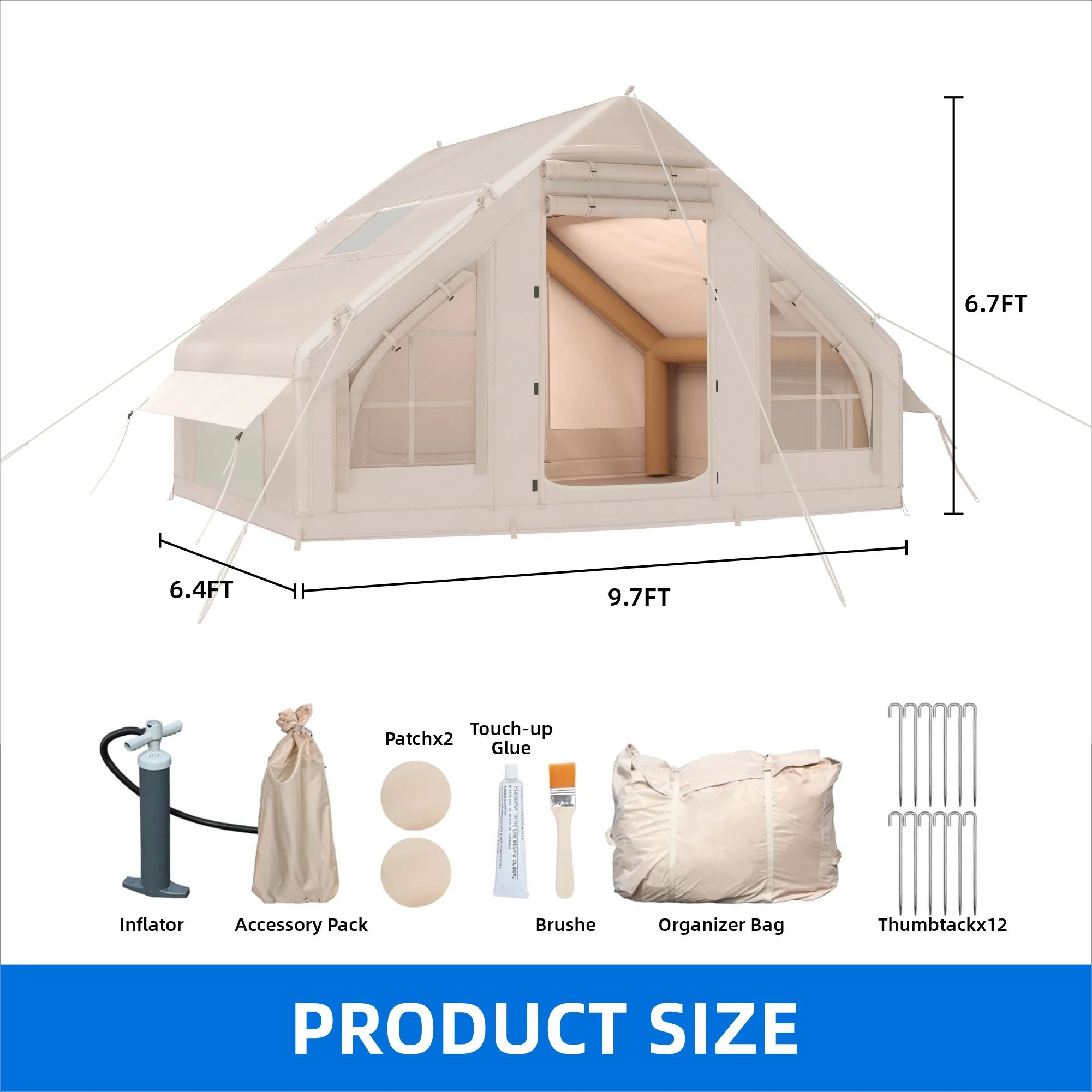 Experience ample space and excellent ventilation with our inflatable house tent, accommodating people for a comfortable outdoor vacation. Made from breathable 400D Oxford cloth, it offers balanced breathability and waterproofness with a rainproof rating of PU5000. The tent is easily repairable with provided canvas patches. Effortless installation is ensured with the self-supporting structure and one-piece TPU inflatable tube. Please avoid prolonged heavy rain usage.