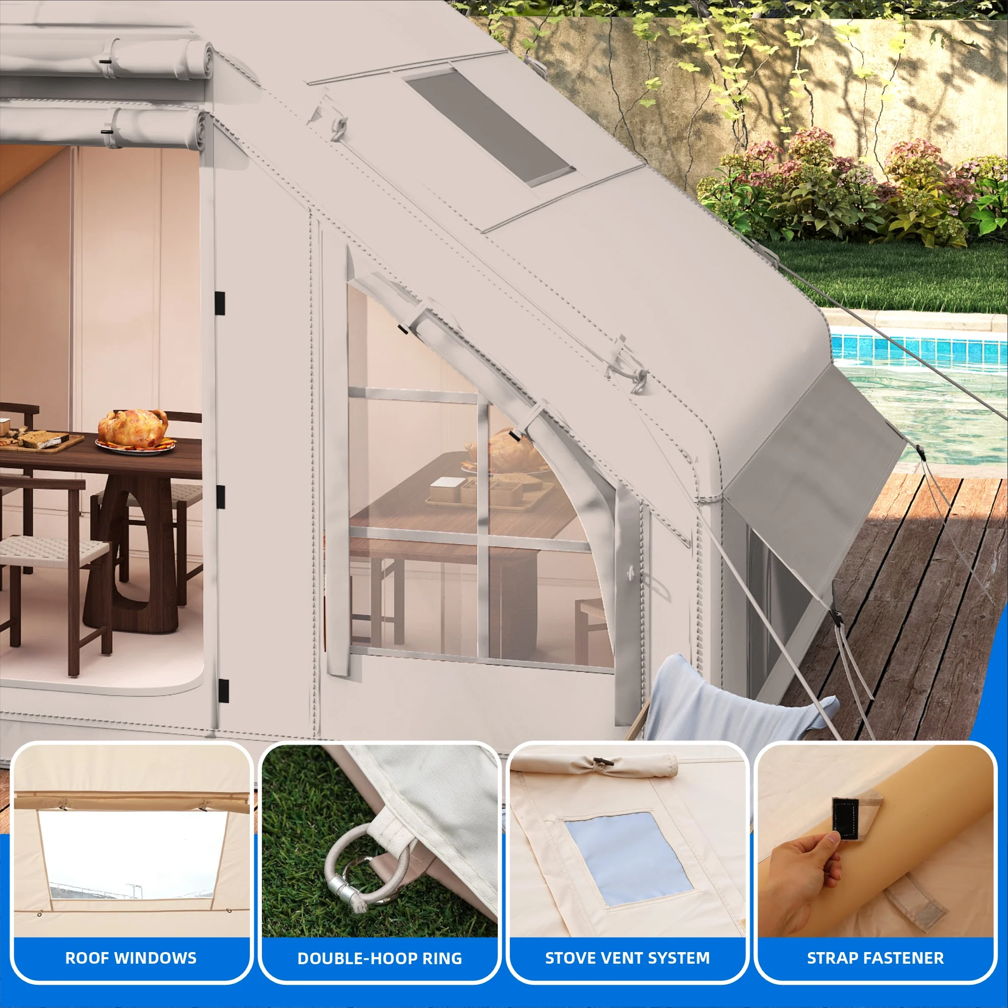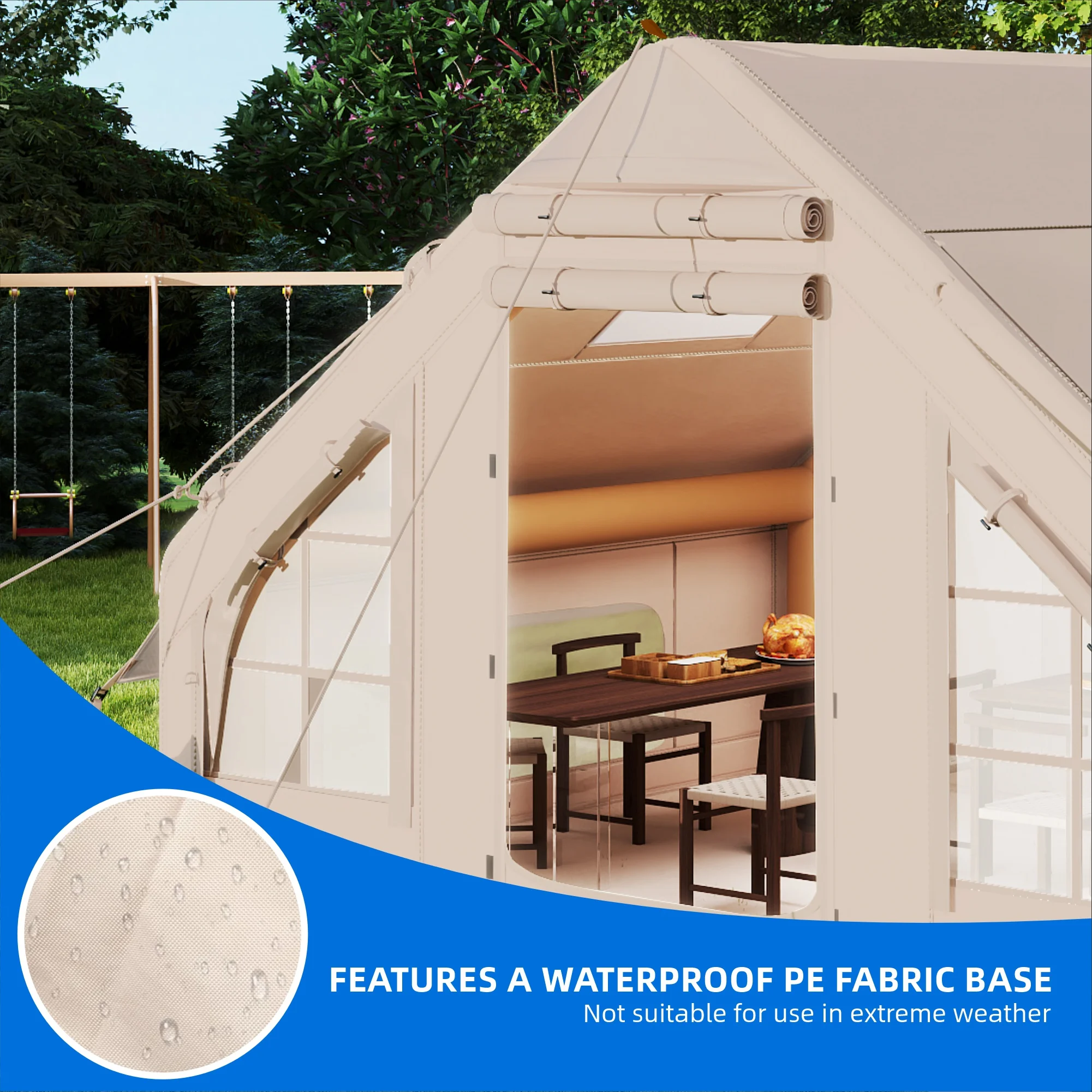 - Optimal ventilation: Experience efficient air circulation and ample natural light with the mesh windows and transparent panels of our inflatable house tent. Spacious enough for 4-6 people to enjoy a comfortable outdoor getaway.