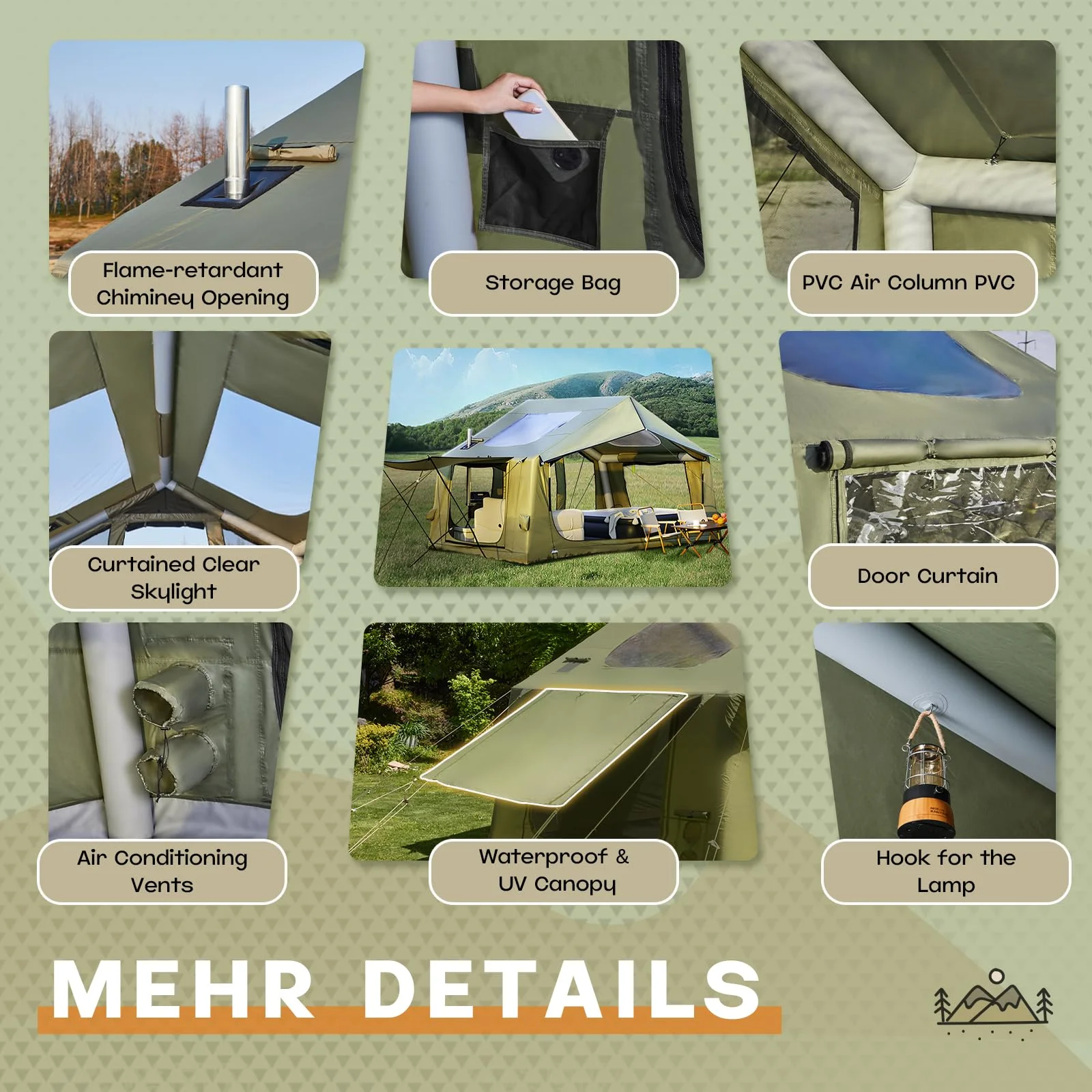 - ��Convenient Designs��This winter tent has a chimney opening with flame-retardant fabric. Just cut off the cross and you can have a proper smoke vent for your fireplace. When not in use, you can also seal the chimney opening with Velcro to make it more beautiful and windproof. The interior of the inflatable air tent also allows you to hang lights and features two storage pockets that can be used for items such as mobile phones.