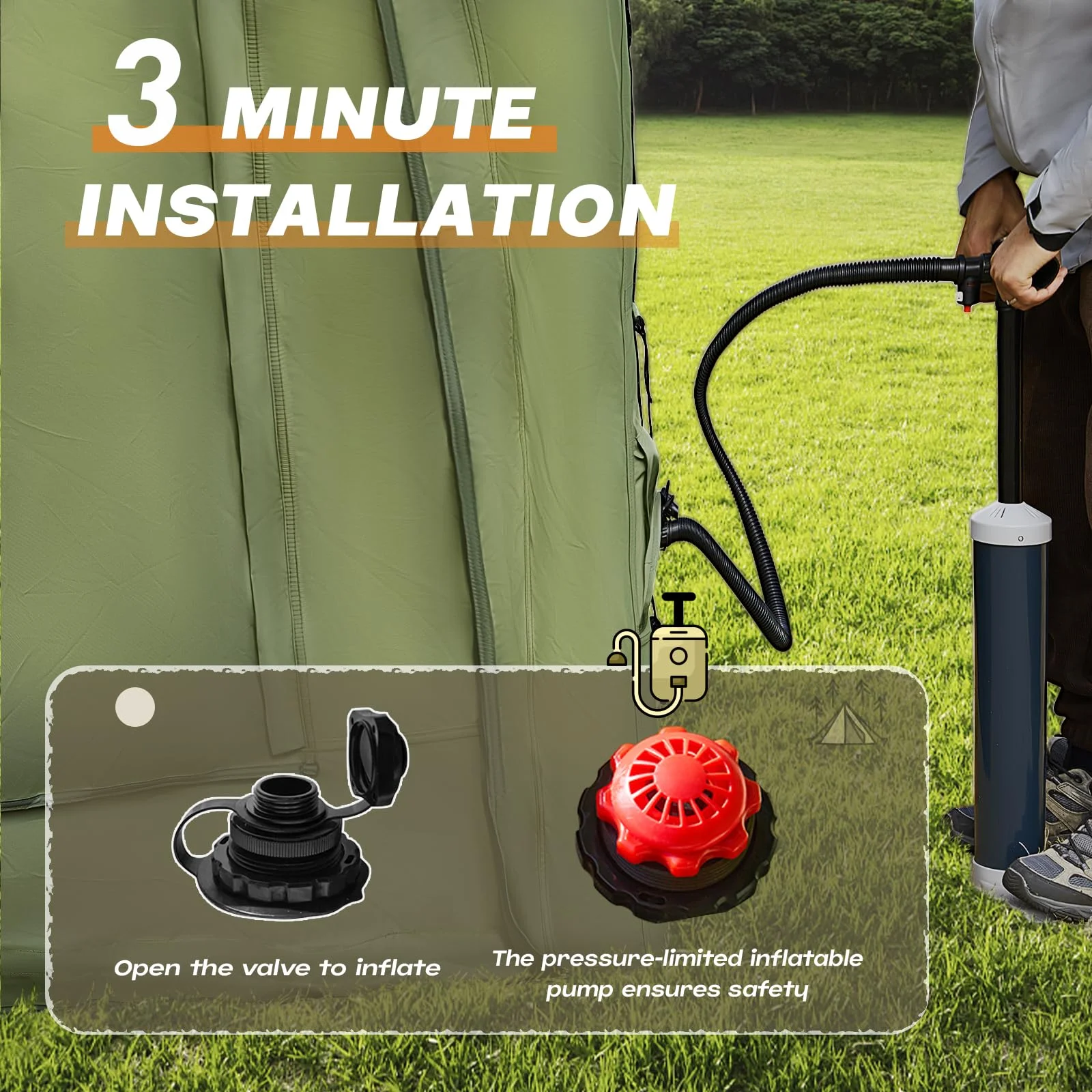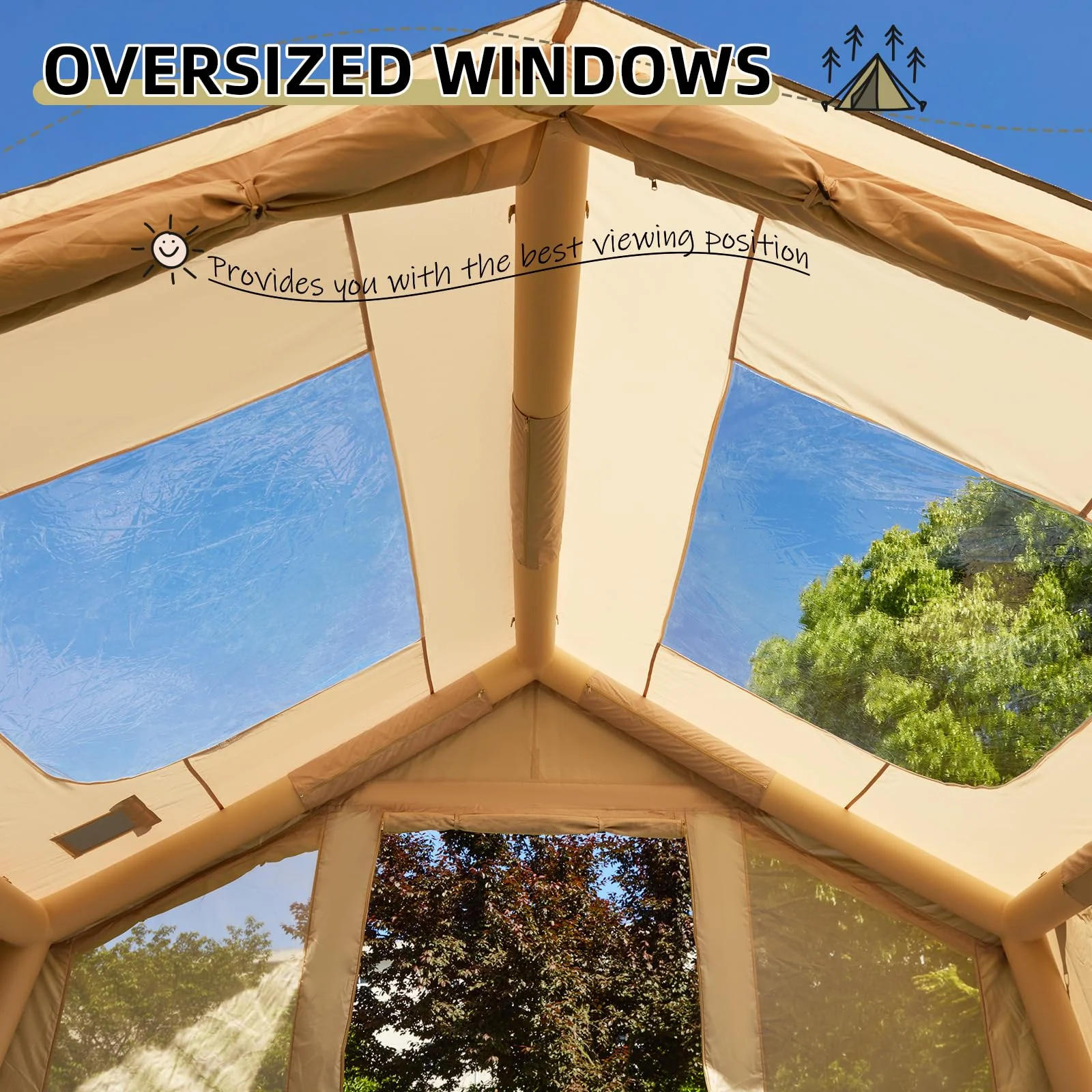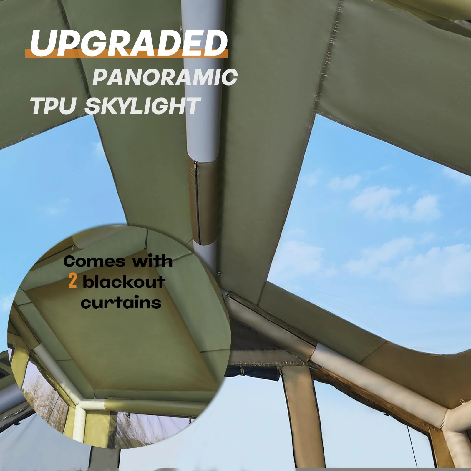 - ��Better Ventilation & Light��This inflatable camping house has PVC transparent skylight and a double-layered door curtain designed to provide efficient internal airflow and good lighting. The high density mesh increases air circulation while protecting privacy and keeping you cool and comfortable on hot summer days. Each door and window is fitted with blackout curtains, so you can choose the one that suits your needs.