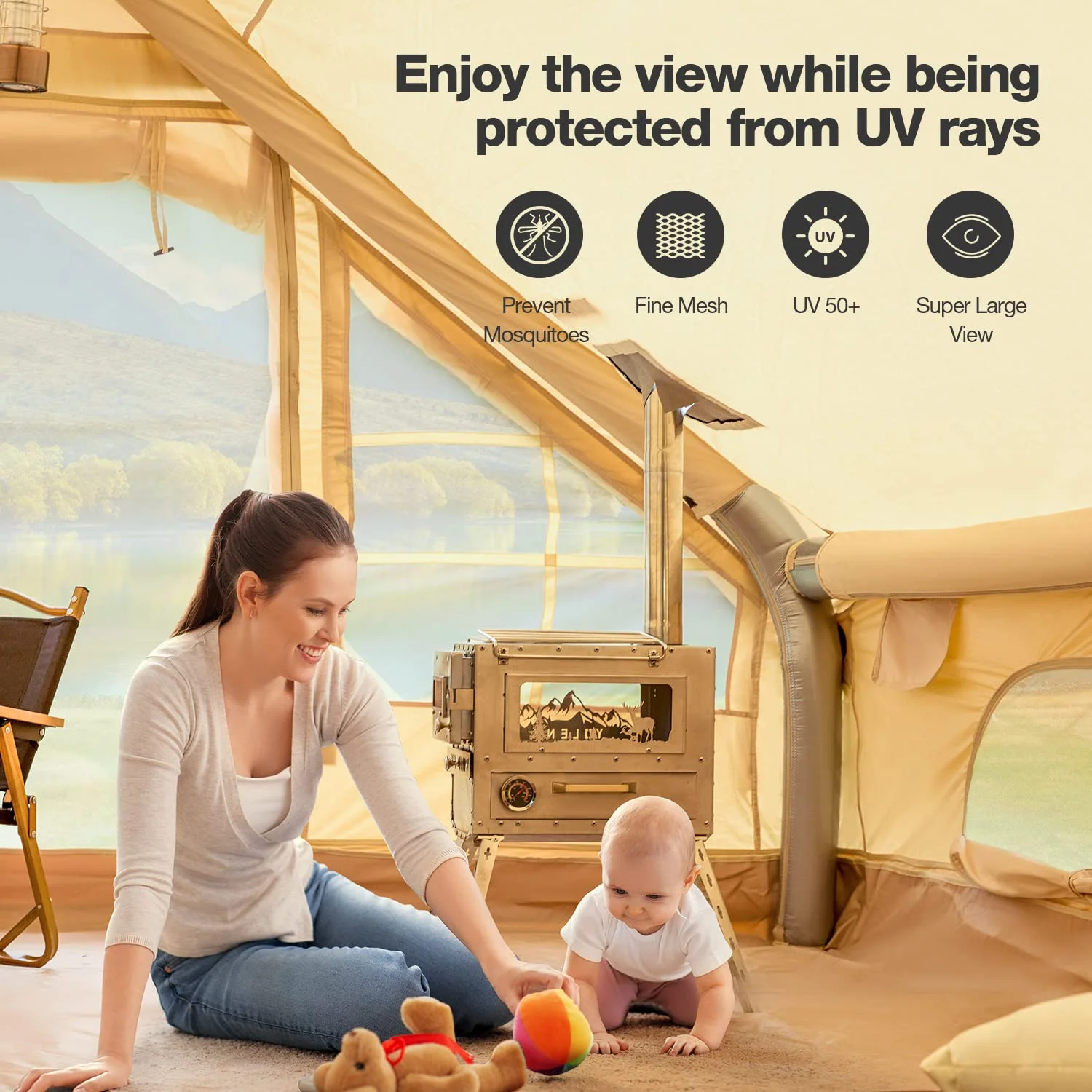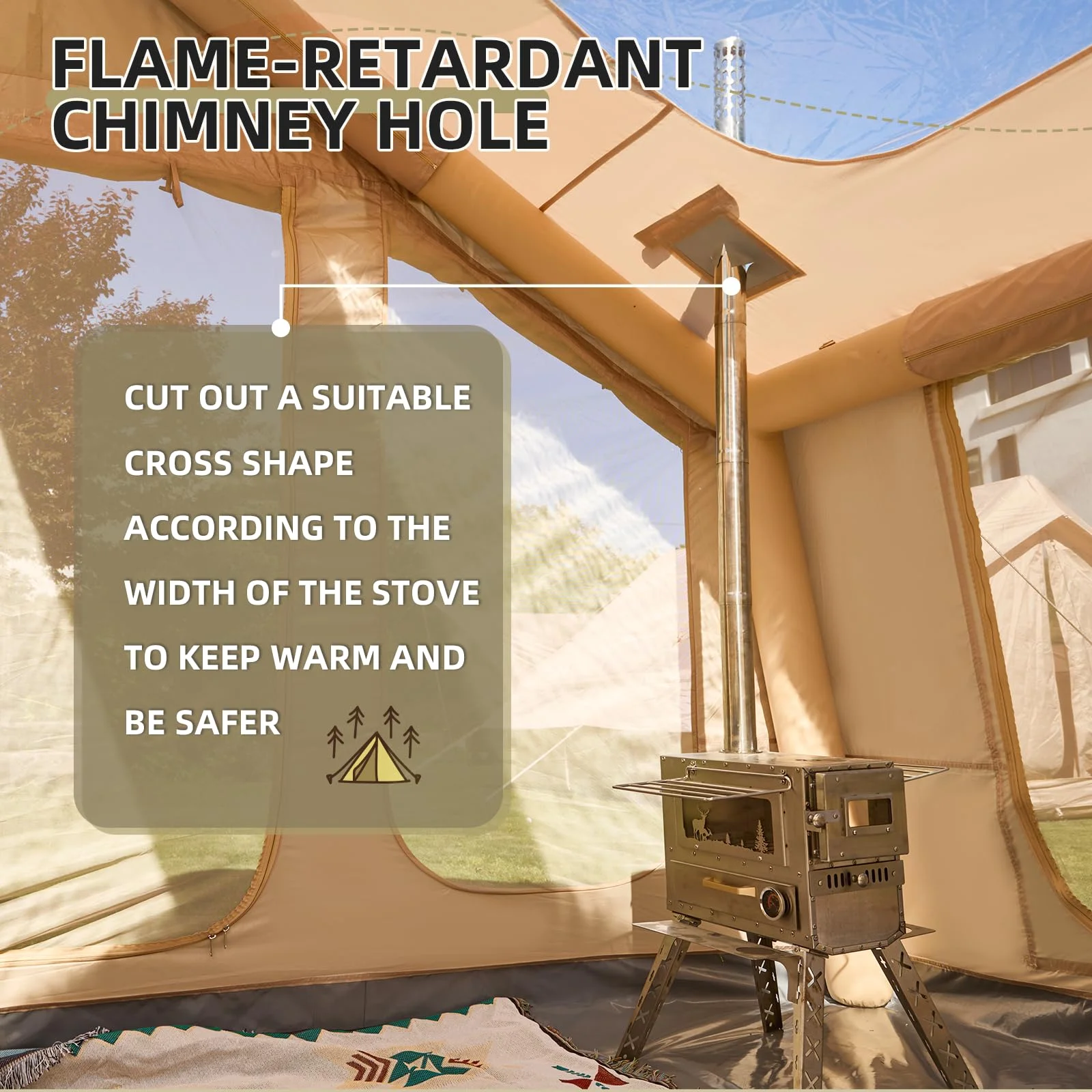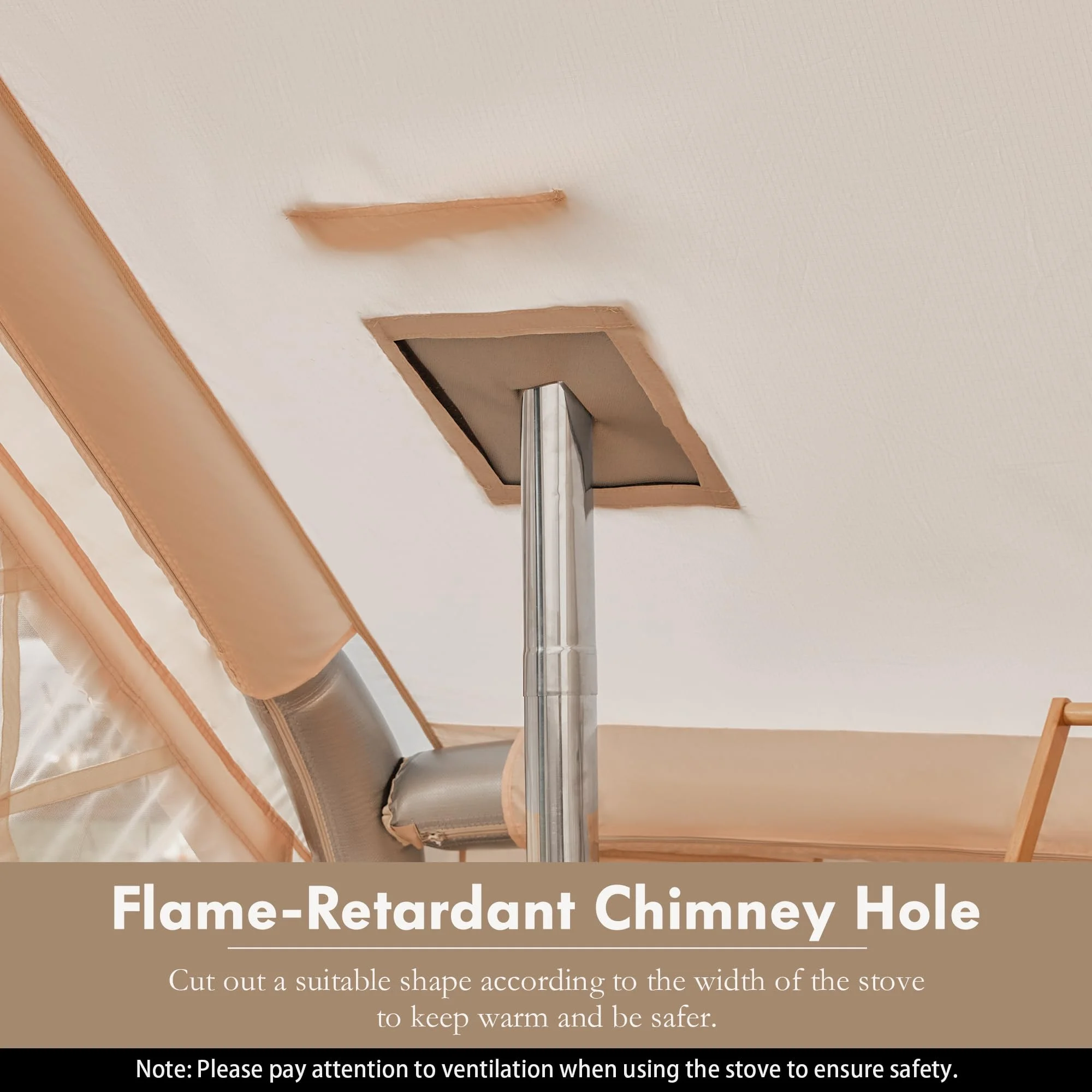 - ��Storage bag & Chimney Opening��There are more delicate designs of the inflatable tent for camping. The convenient storage bag help you to save small items like your phone. This glamping tent's prepped with a chimney hole using fire retardant fabric, you just need to cut a cross shape with scissors according to the size of your fireplace, and you can arrange a proper smoke vent for your fireplace. When you don't need to use it, you can also use Velcro to seal the chimney opening to protect it from the wind and make it more beautiful.