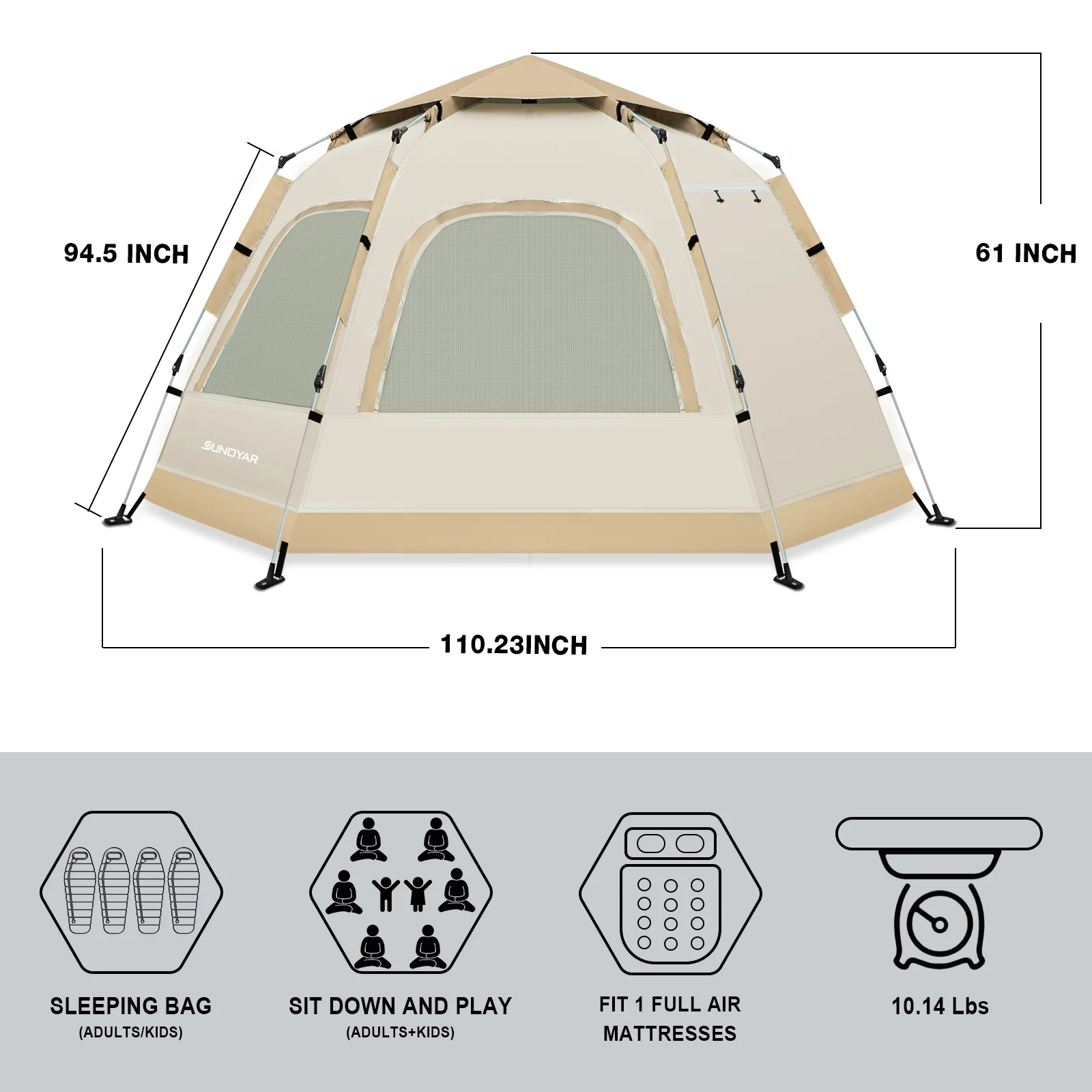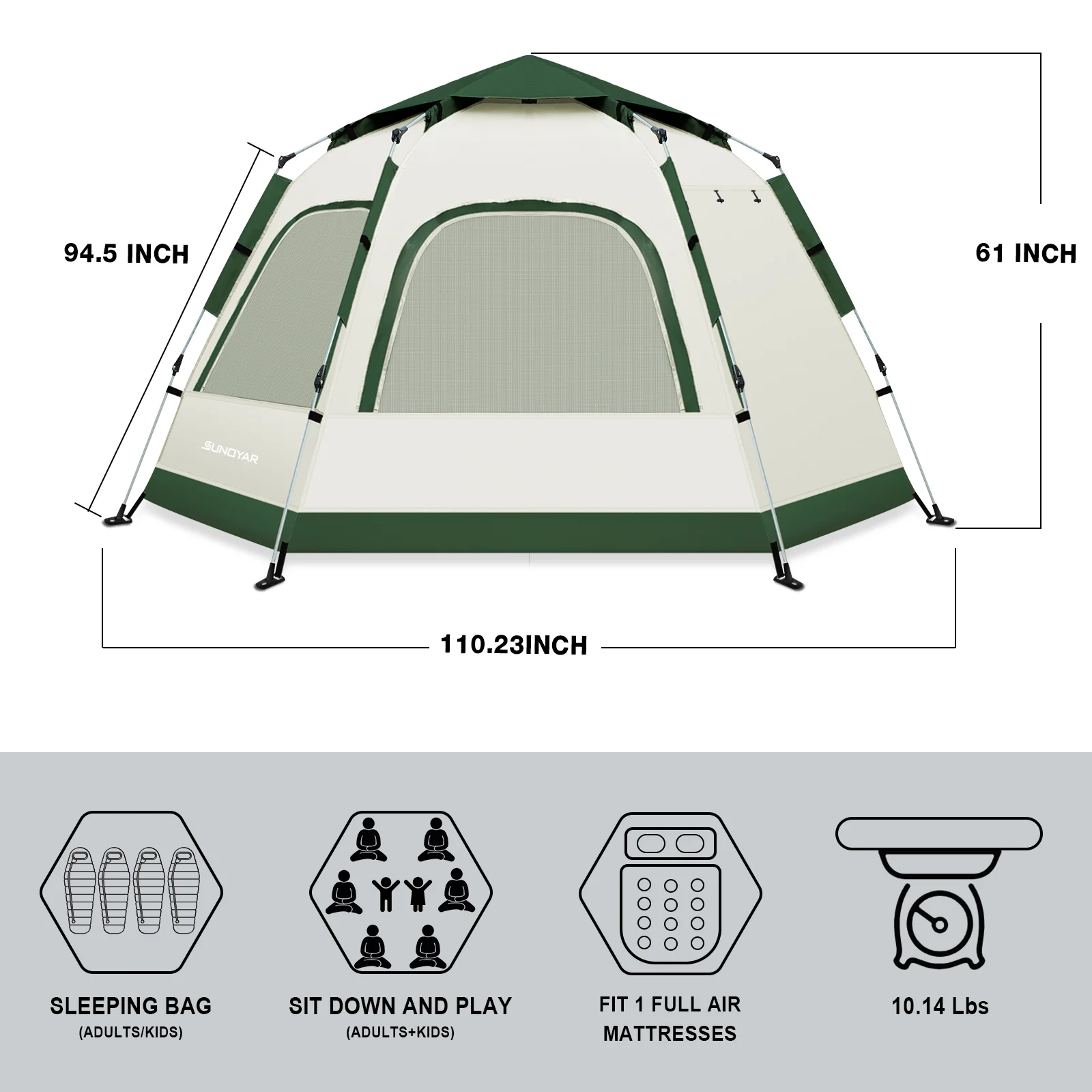 - Spacious and Comfortable for the Whole Family�C This SUNOYAR family tent offers a practical interior space of 110" �� 94" (approximately 9.2ft �� 7.8ft), comfortably accommodating up to 4 adults for sleeping, or 6-8 people for a gathering, enjoying a pleasant outdoor time. The tent��s thoughtful layout easily fits a large inflatable mattress and a single sleeping bag, providing enough space for each camper, allowing you to escape the cramped feeling of small spaces. Whether you're traveling with family, gathering with friends, or camping as a couple needing more room to stretch out, this camping tents provides a freer, more relaxed outdoor experience to fully enjoy the pleasantness of nature!
