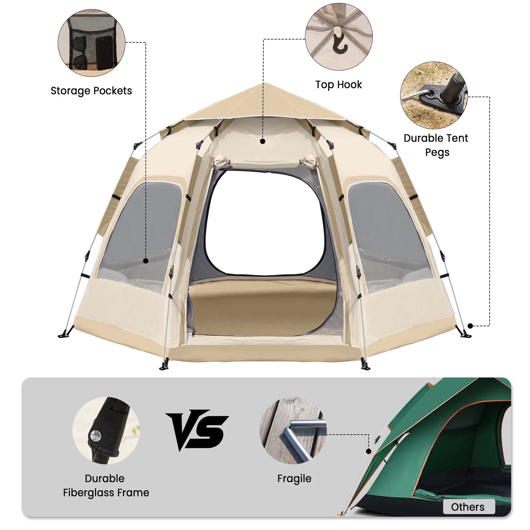 Accessories: 12 Ground Stakes, 6 Wind Ropes, 2 Door Poles