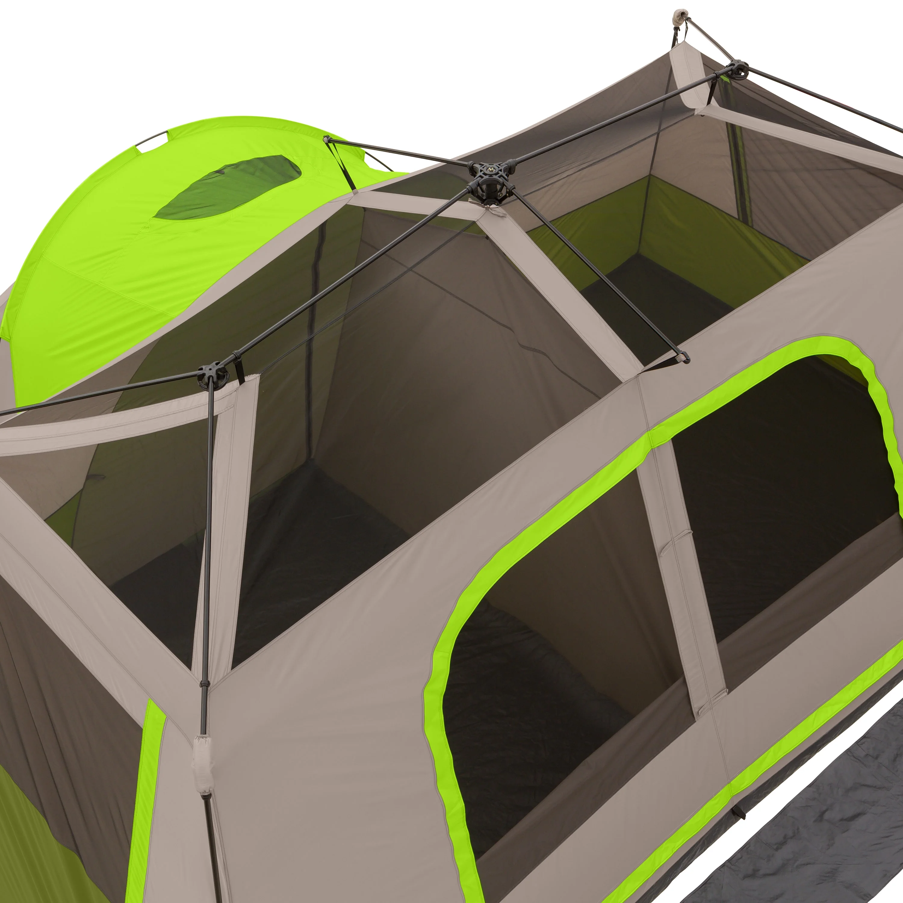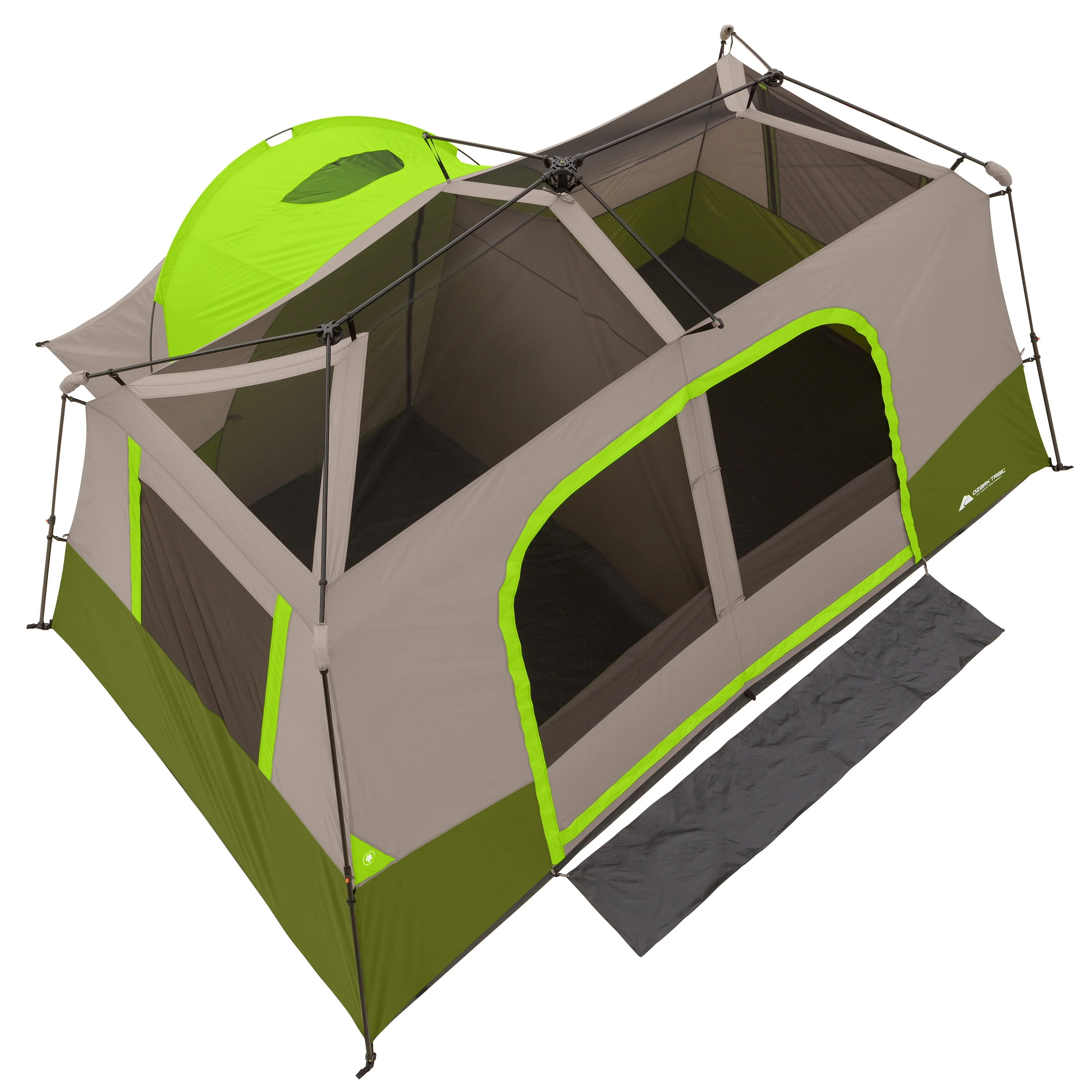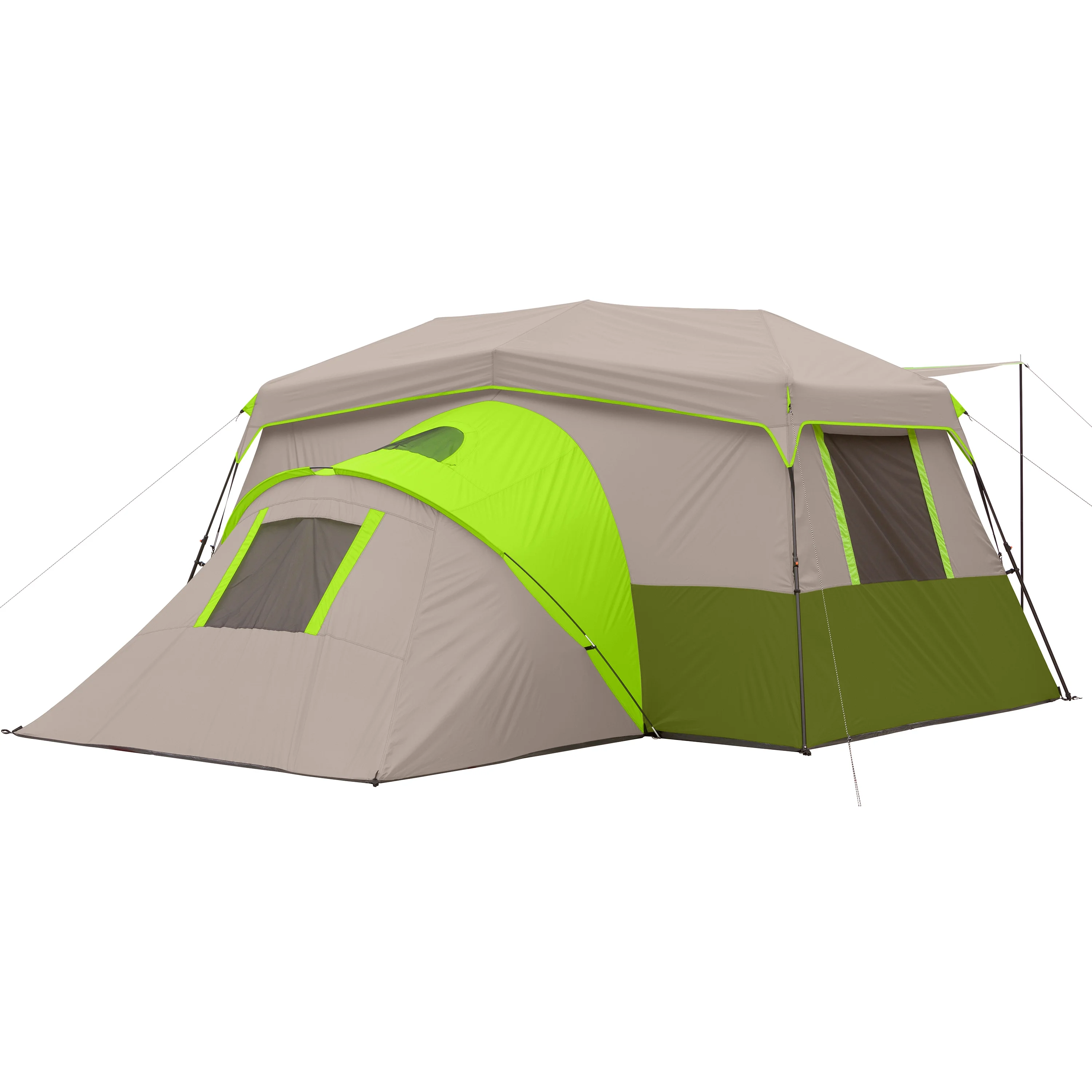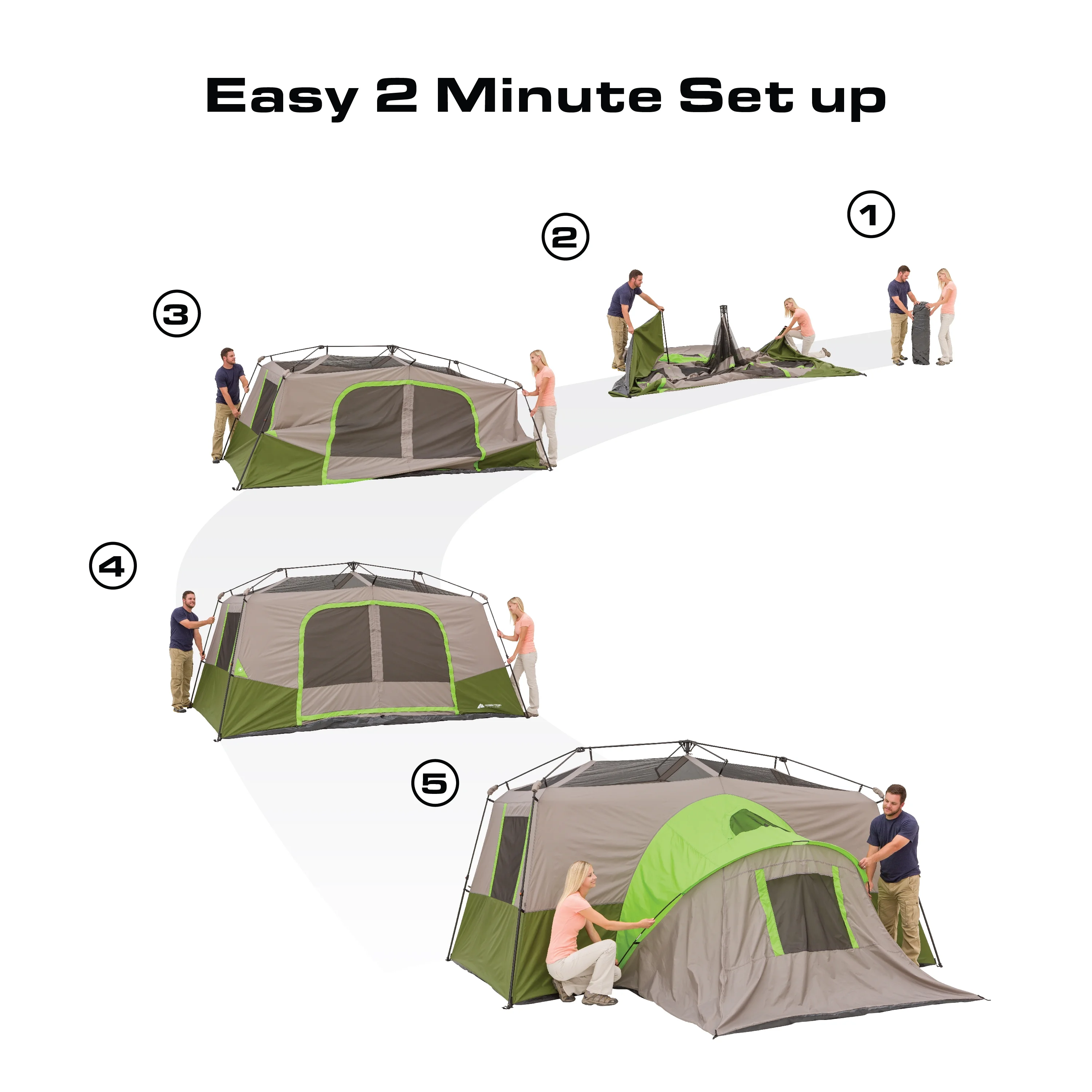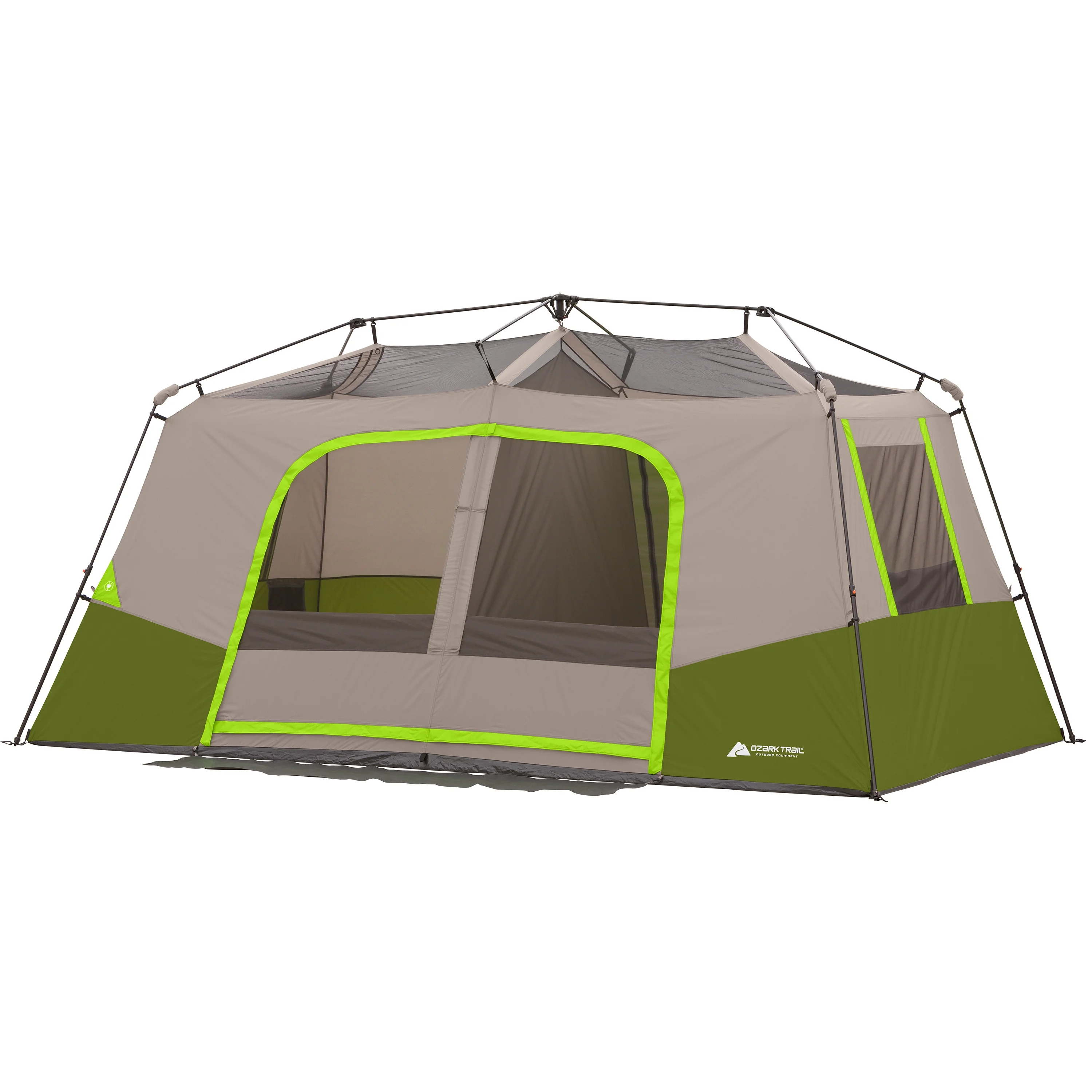 Gear up for your next outdoor adventure with the Ozark Trail 11-Person Instant Cabin with Private Room. This tent sets up in under two minutes with the innovative instant frame design for easy and fun camping. It features an open cabin with an extra attached back room. It also features a large front awning for protected entry and has a 76" ceiling height for ample headroom. Use the family camping tent's included room divider and back room door to create three separate living spaces, or keep them open for panoramic views. It features six large windows and mesh ceiling for comfortable ventilation. Easy to set up, this tent comfortably fits two queen airbeds or up to 11 campers (eight in main cabin plus three in private room) in sleeping bags on the floor. Keep your gear organized with the included hanging gear organizer. Also included are tent stakes to secure the tent, and a carry bag for easy portability and storage when not in use. Make the most of your next camping adventure with the Ozark Trail 11-Person Instant Cabin with Private Room.