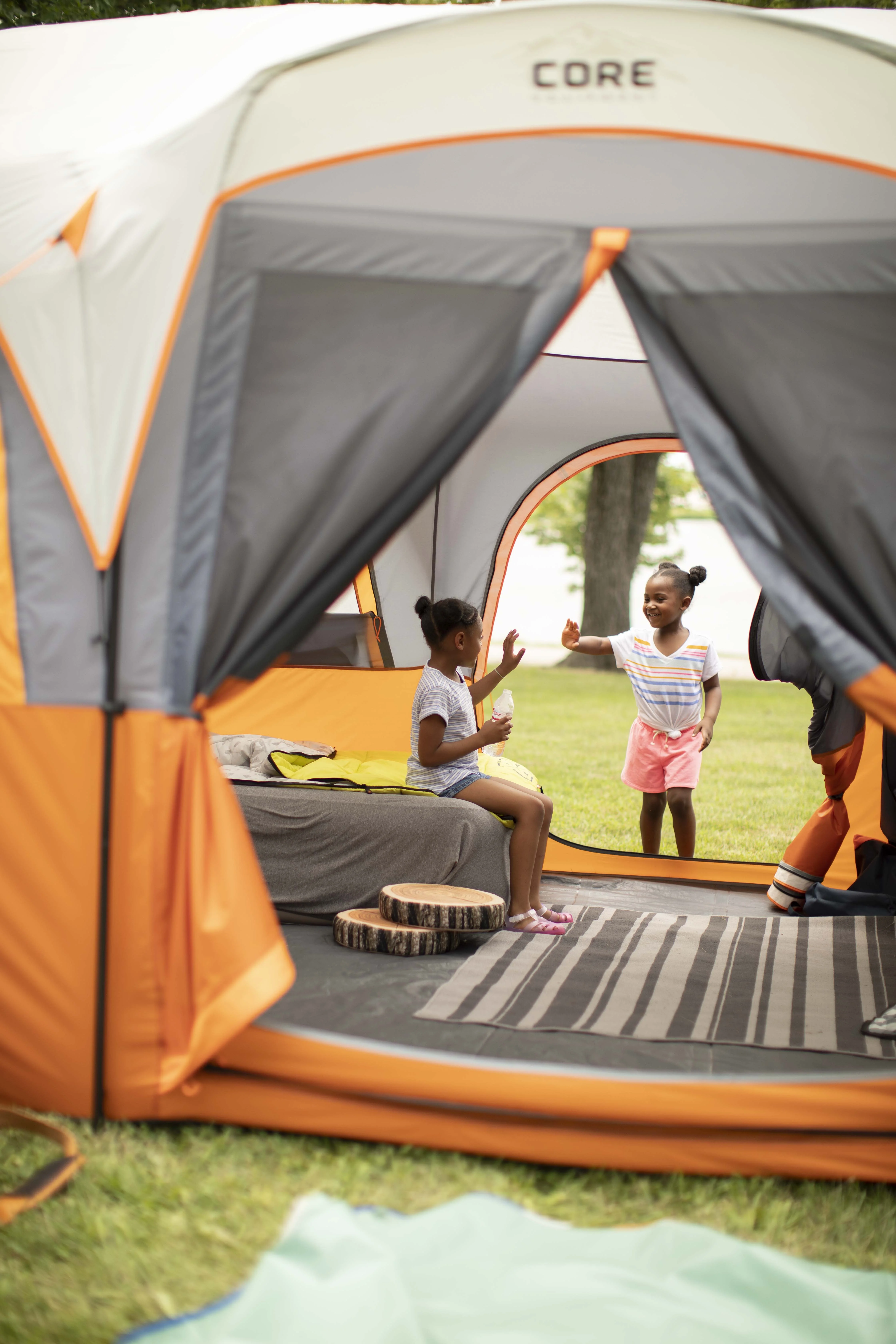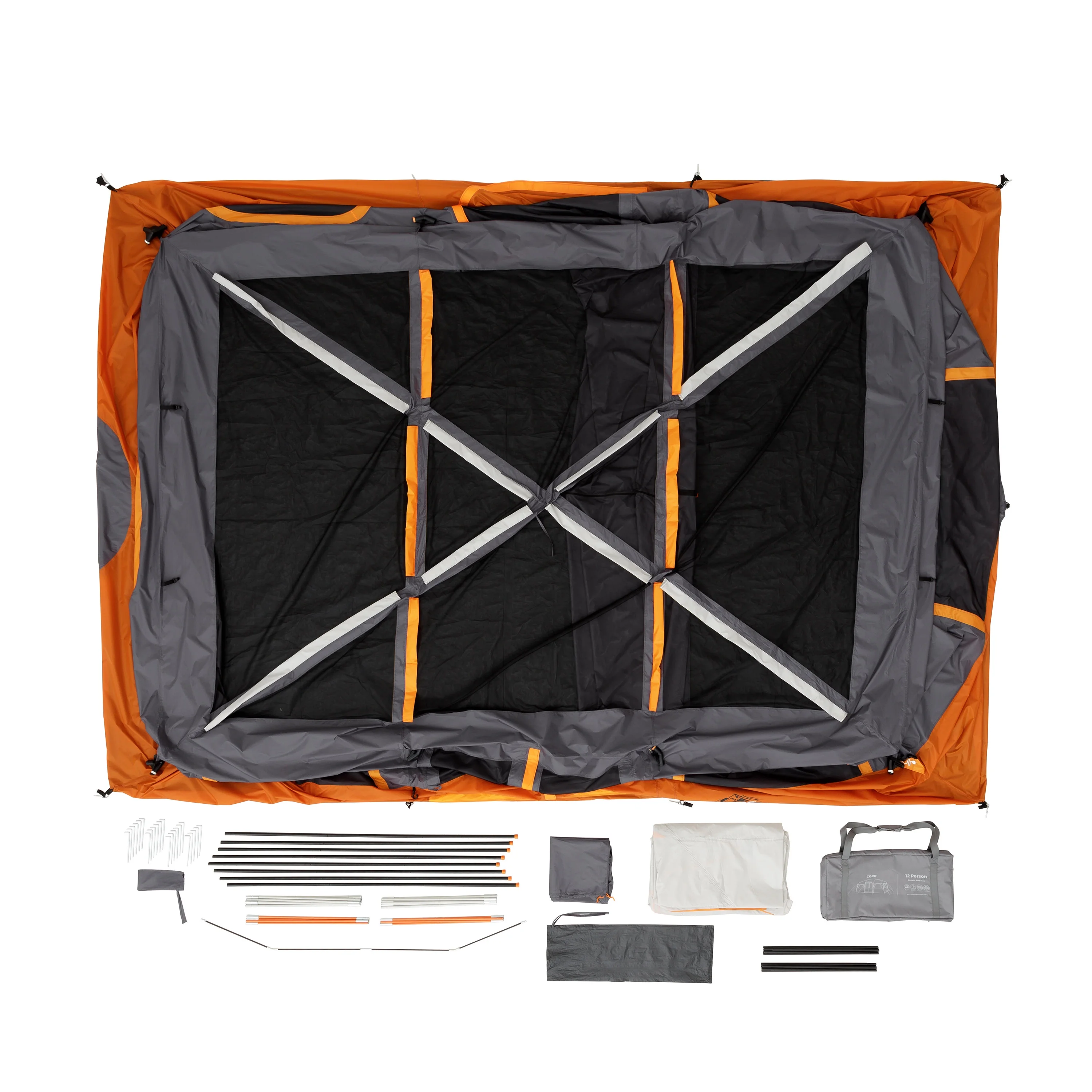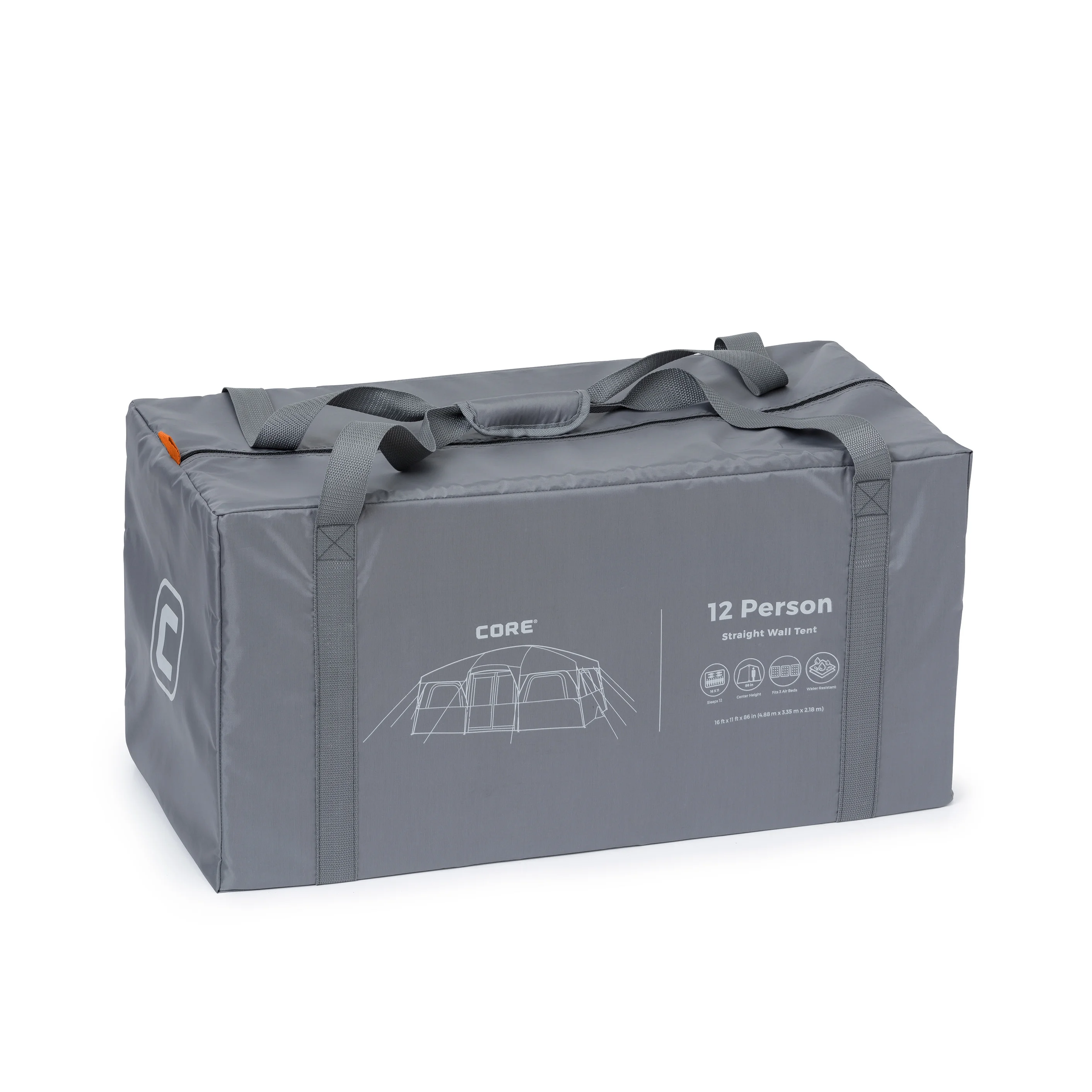 Give your family a tent they could not possibly grow out of! With a 16' x 11' floor space and a center height of 86", the CORE 12 Person Extra Large Straight Wall Tent allows your whole crew to stand, stretch, and move around with ease! The extra tall ceilings make it easy to change clothes and arrange your home away from home with space to spare! Enter from the front T-Door or back D-Door. Attach the included room divider to create separate living and sleeping spaces. Make one side or the other your private sleeping space (5.5' x 11') and use the rest of the space for gear organization (10.5' x 11'). Setup is simple with color-coded fiberglass poles, sleeves, and joints. The water repellent rainfly is removable in warmer weather to expose the mesh ceiling for panoramic views or star gazing on clear summer nights. All CORE Equipment tents feature CORE H20 Block Technology- water repellent fabrics with active bead technology for faster water runoff paired with sealed seams on rainfly, doors, and windows. The advanced venting system uses the adjustable air intake vent designed to draw in cool air from the ground while the mesh ceiling allows hot air to escape keeping you comfortable all season.