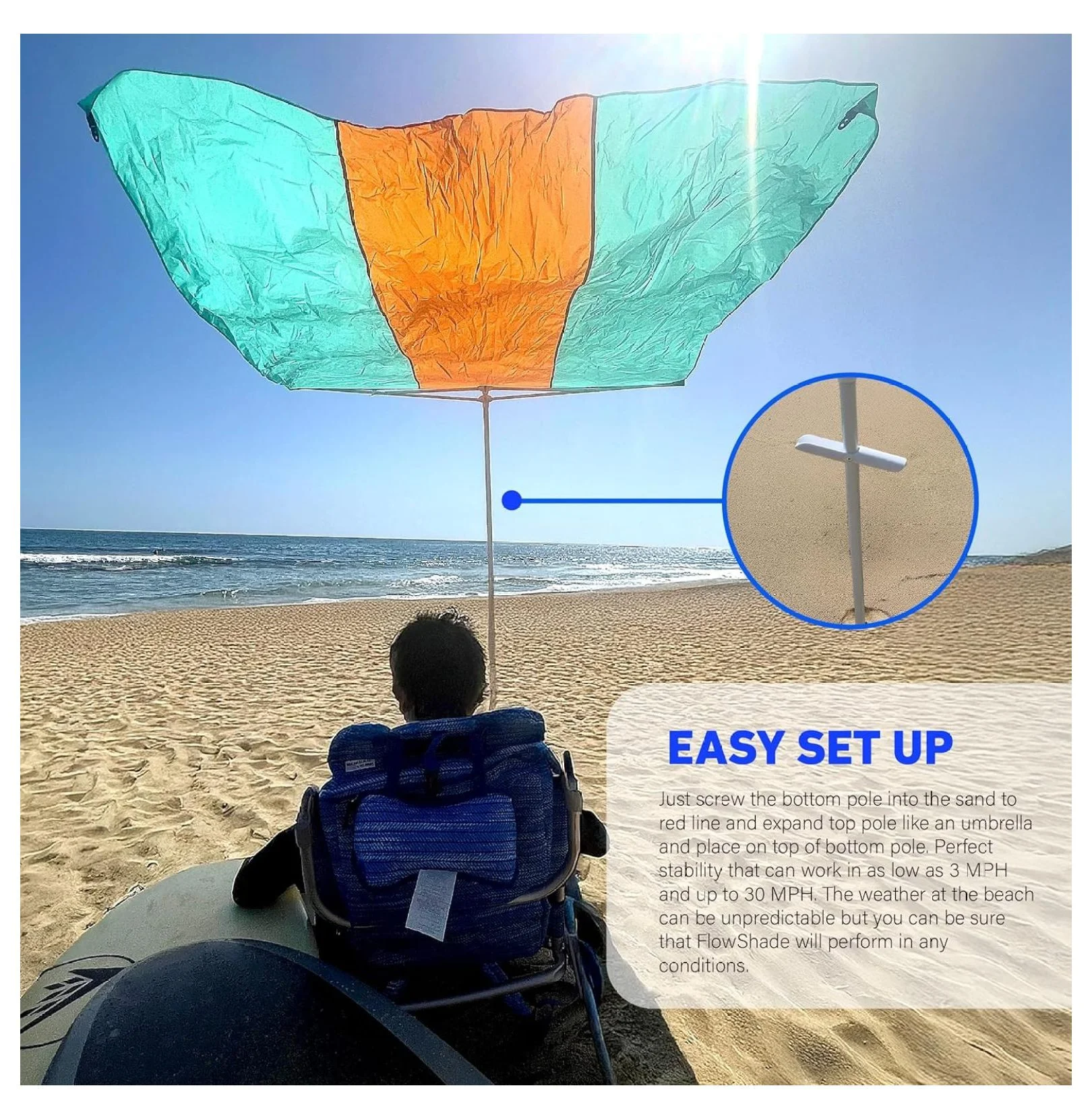 - EASY SET UP - Just screw the bottom pole into the sand to red line and expand top pole like an umbrella and place on top of bottom pole. Perfect stability that can work in as low as 3 MPH and up to 30 MPH. The weather at the beach can be unpredictable but you can be sure that FlowShade will perform in any conditions.